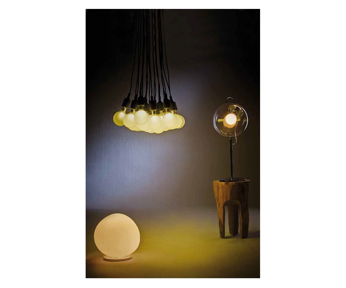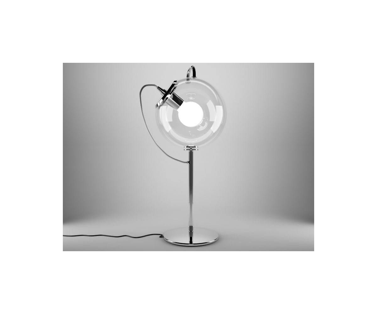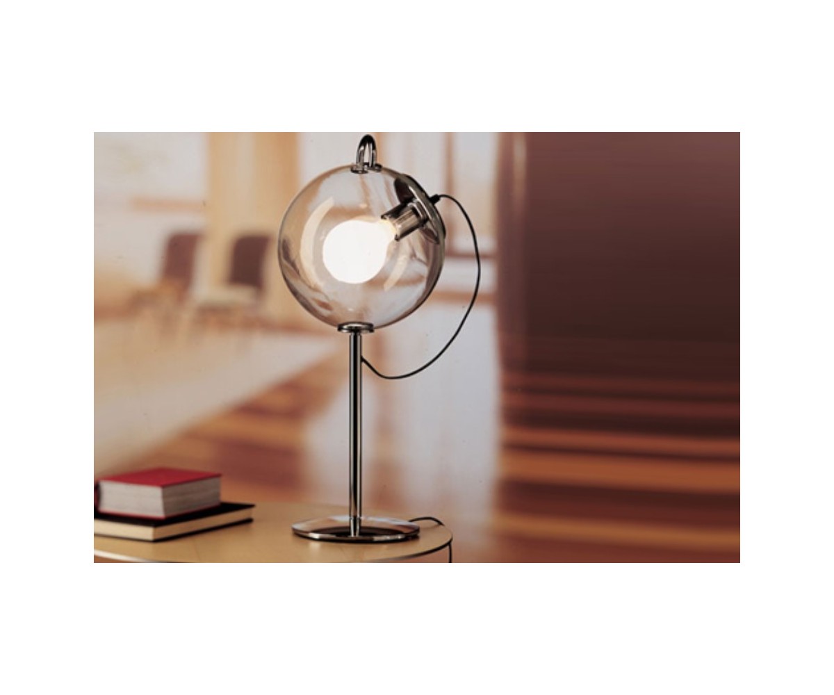 Lámpara de sobremesa, inspirada en un diseño de Ernesto Gismondi para Artemide. Base en acero cromado, globo de cristal transparente templado. También disponible en lámpara de suelo. Modelo de bombilla E27. Réplica exacta con materiales originales de máxima calidad.