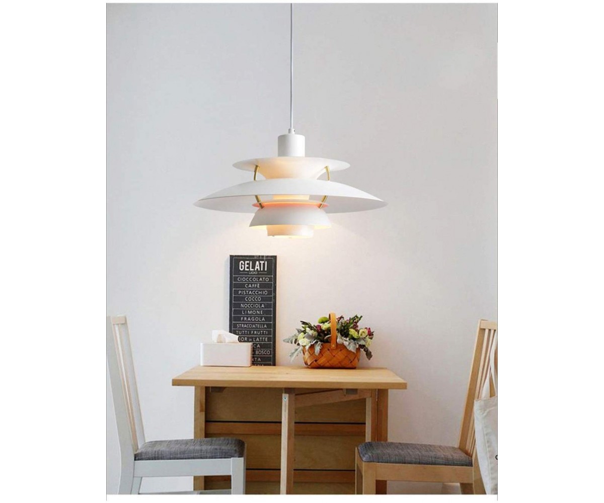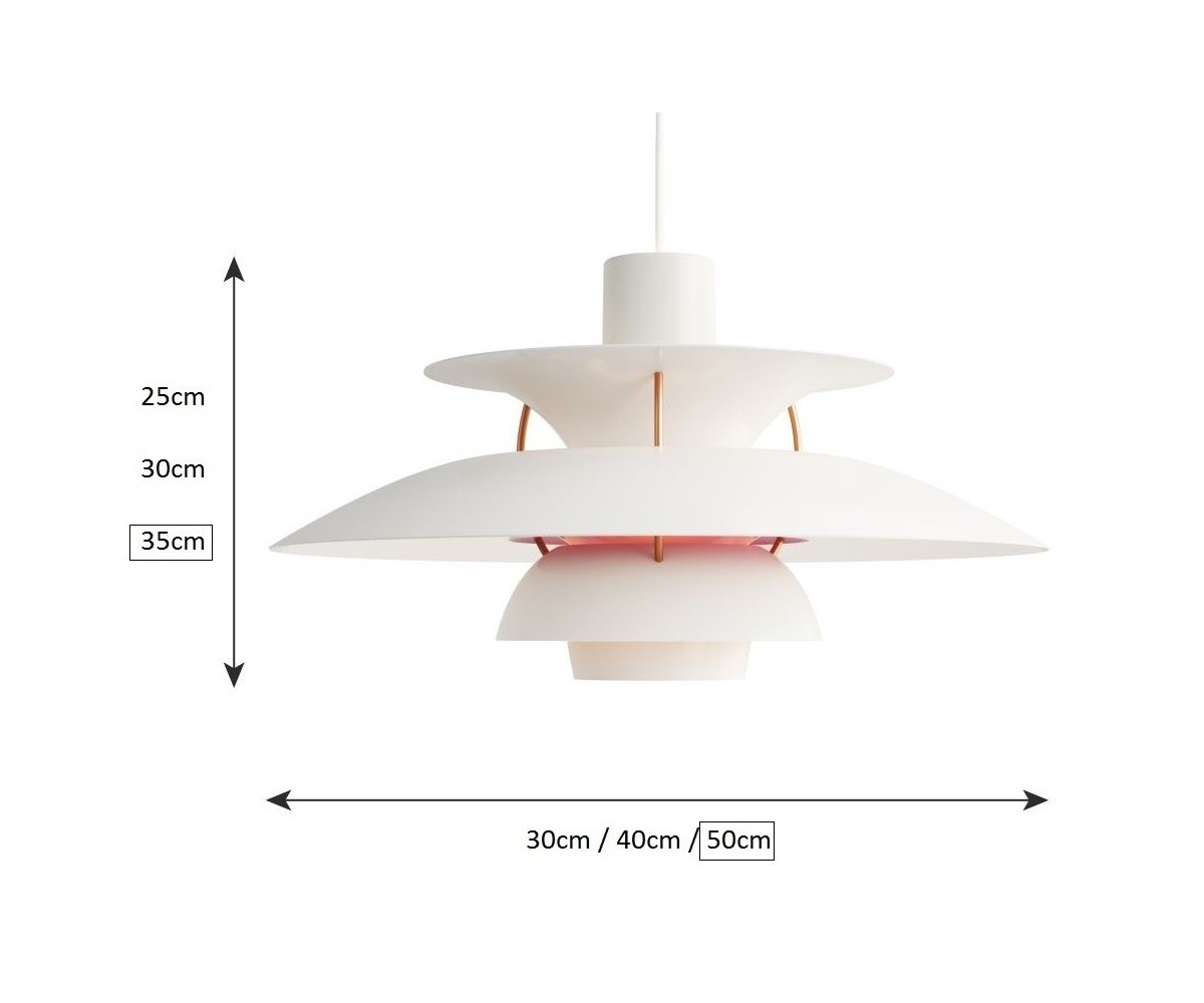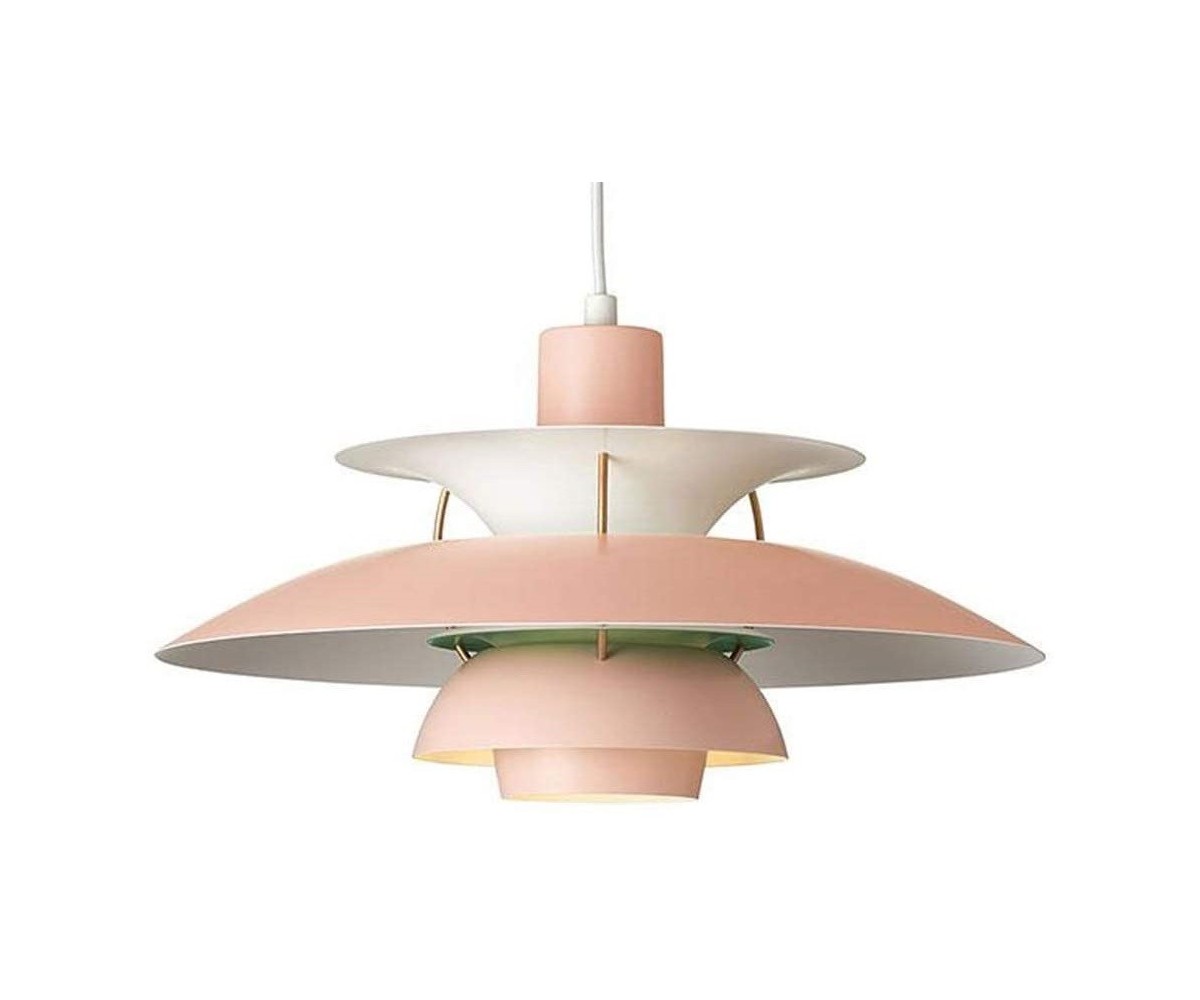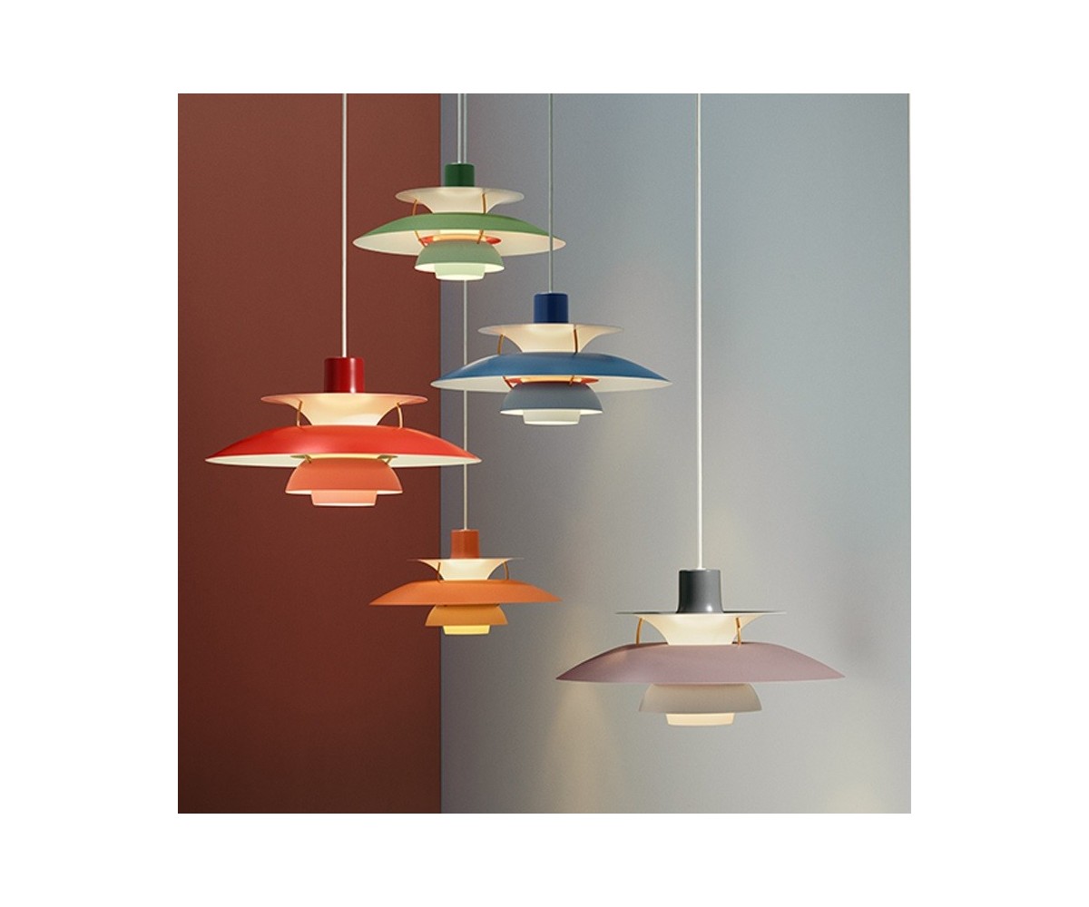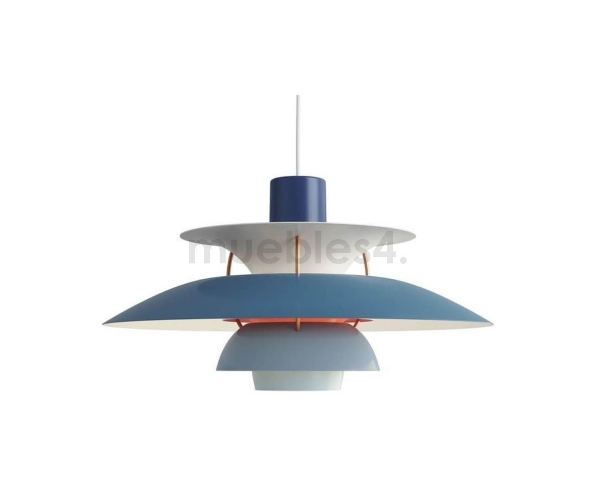 Lámpara suspendida, inspirada en un diseño de Poul Henningsen. Fabricada en aluminio de aleación, color disponible rosa, negro, rojo, celeste, pistacho, planco, amarillo, morado, gris, verde azul y naranja, terminación satinado. Modelo bombilla E27 LED, no incluida. Largo del cable 130cm. También disponible en lámpara de suelo y sobremesa. Réplica exacta con materiales originales de máxima calidad.