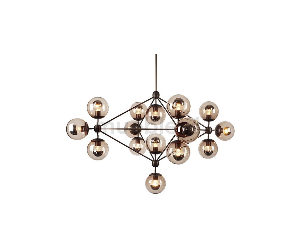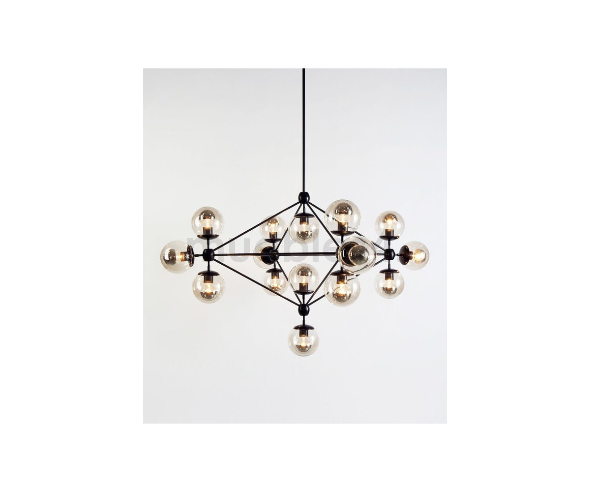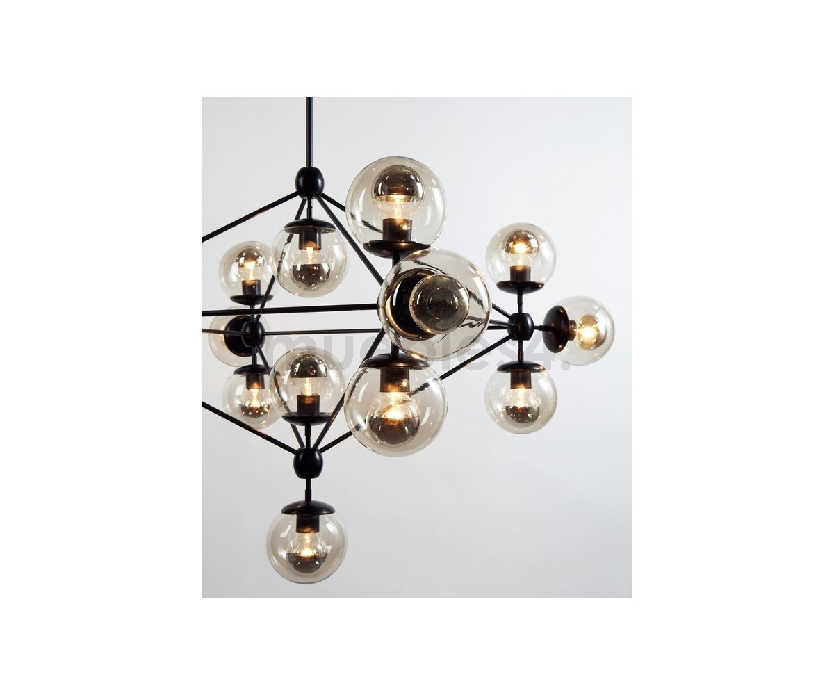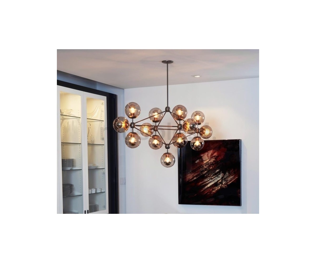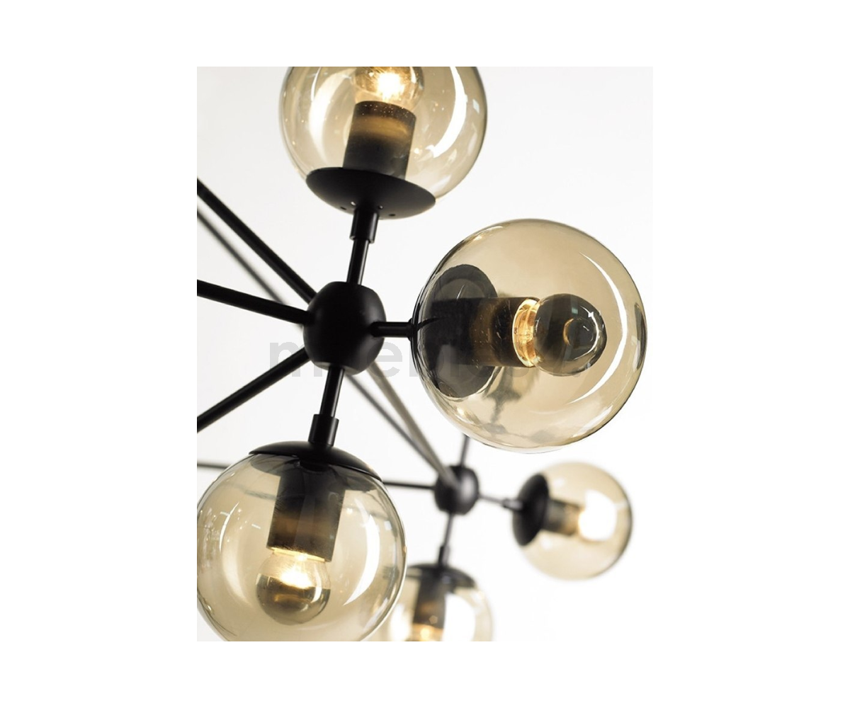 Lámpara inspirada en un diseño de Jason Miller para Roll & Hill. Se compone de tres brazos en acero TRIPLE LACADO AL HORNO color negro, cada uno de ello con tres globos de CRISTAL SOPLADOl ambar y uno central. Modelo de E27, (15 unidades) no incluidas. FABRICADA ARTESANALMENTE. Réplica exacta con materiales originales de máxima calidad.