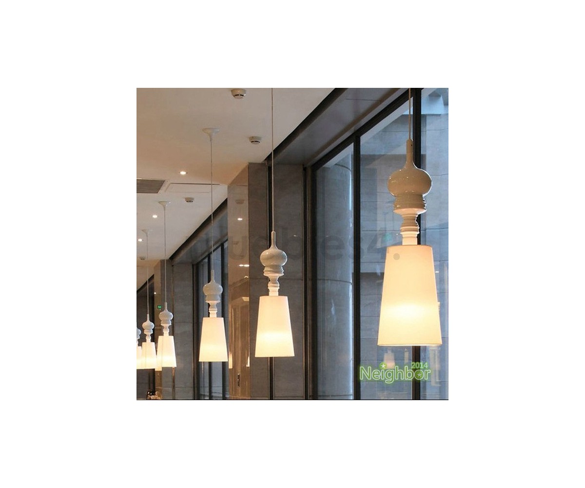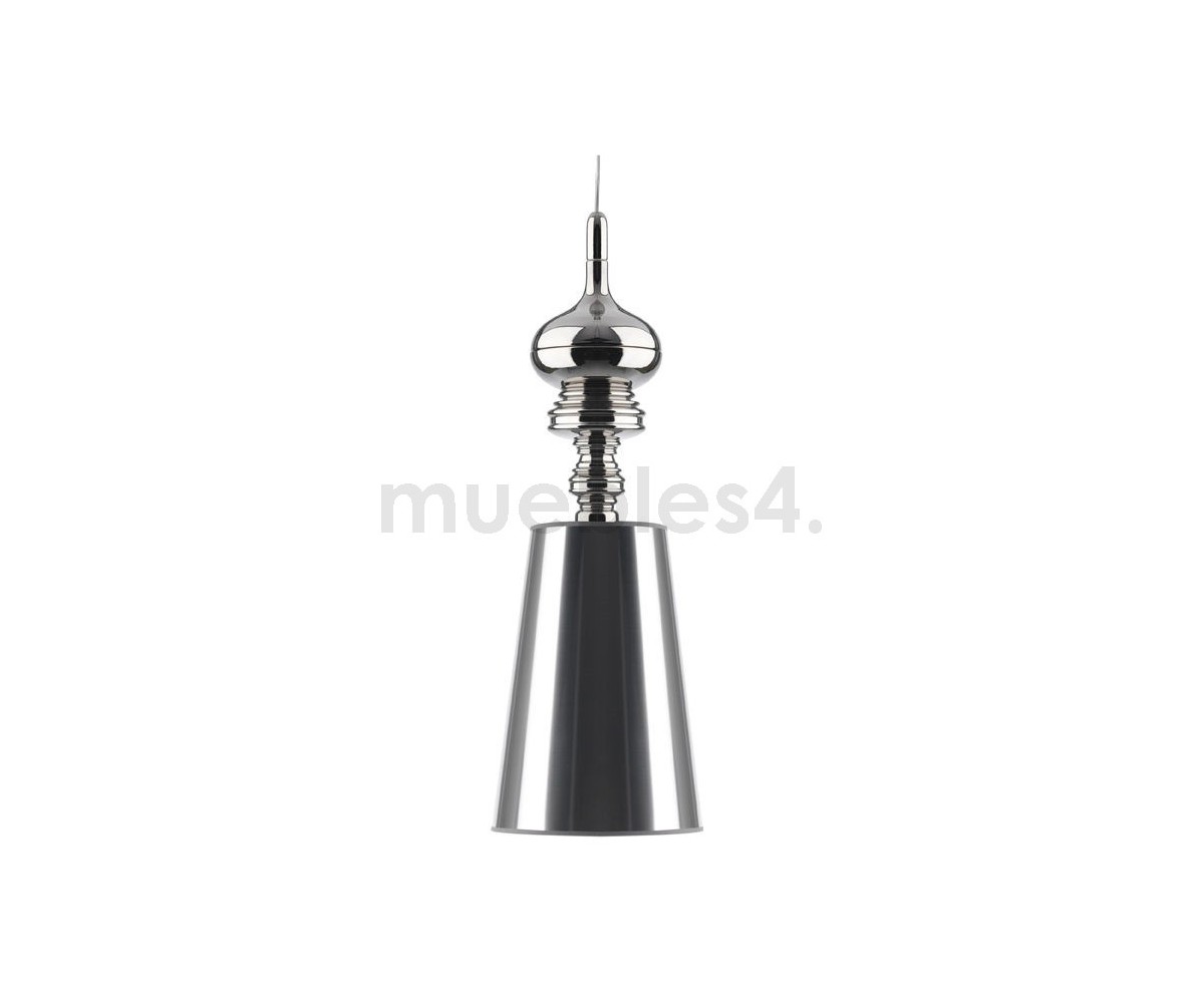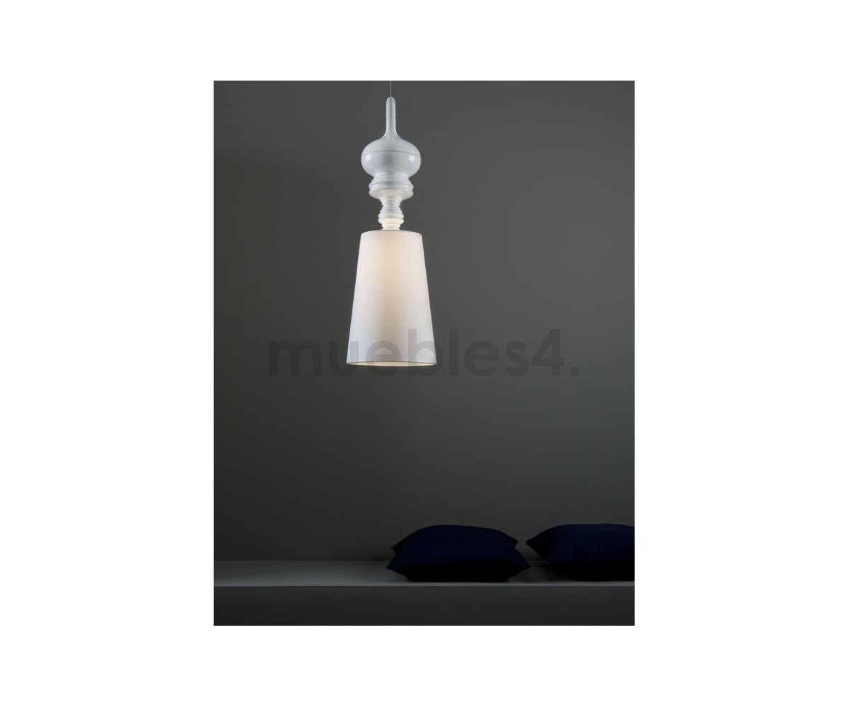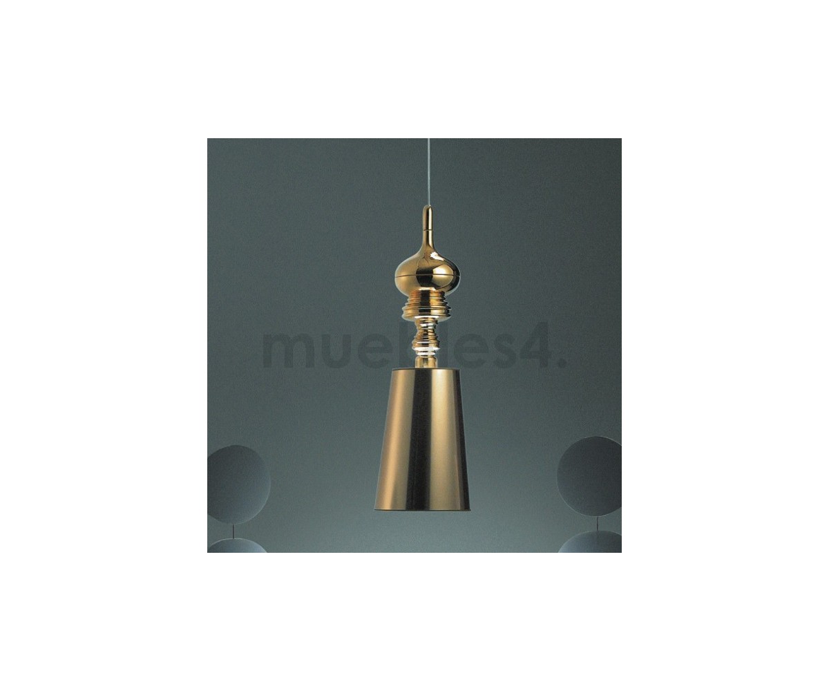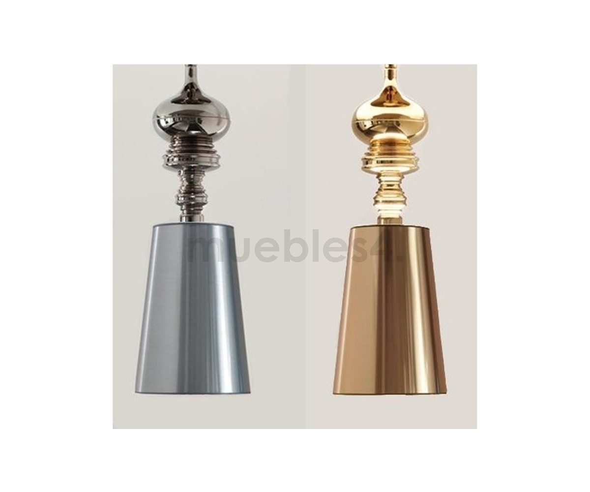 Lámpara suspendia, inspirada en un diseño de Jaime Hayón. Cuerpo realizado en acero en color plata, oro y blanca. Pantalla en policloruro de vinilo mismo color que el cuerpo. También disponible en lámpara de pie, aplique y sobremesa. Modelo de bombilla E27. Réplica exacta con materiales originales de máxima calidad.