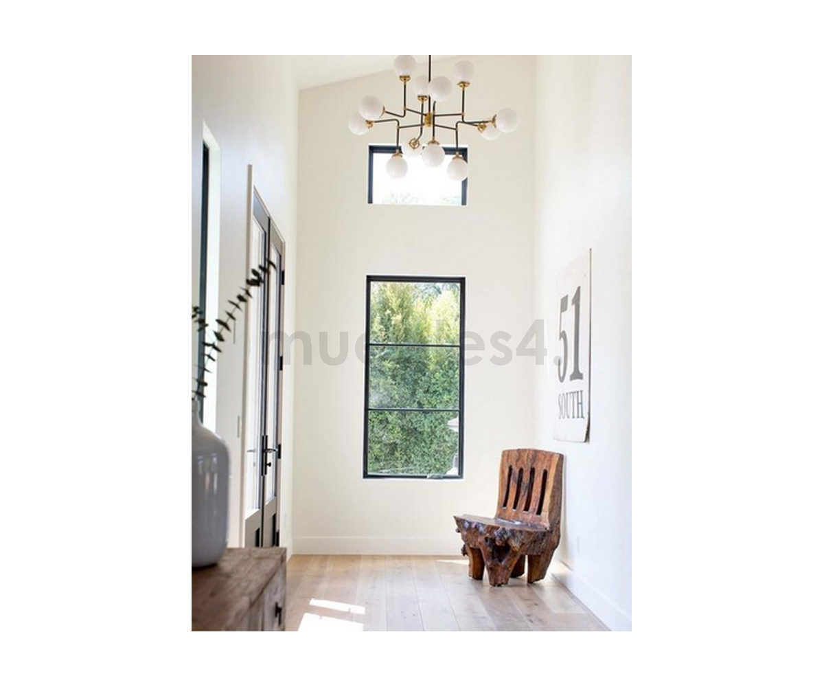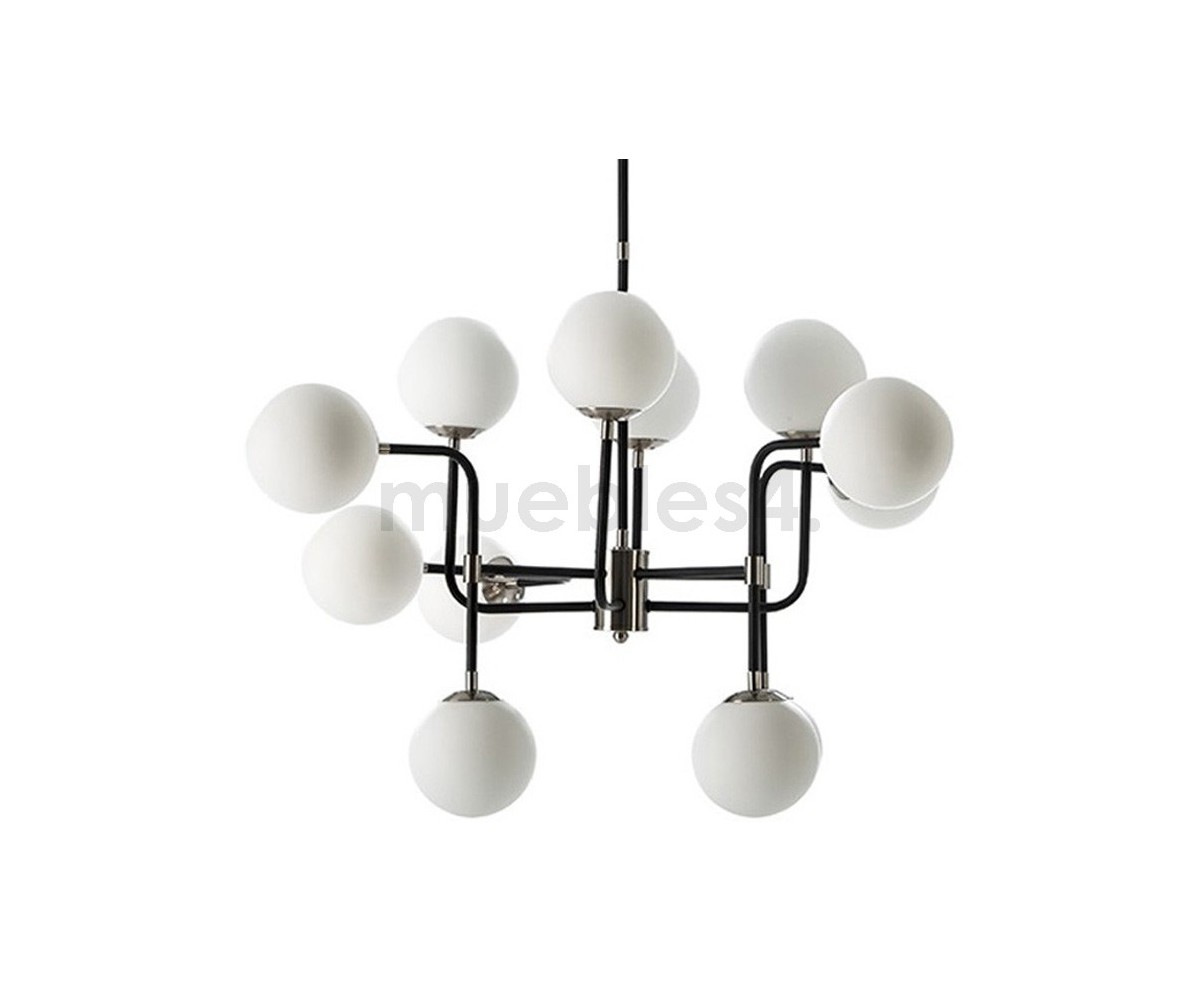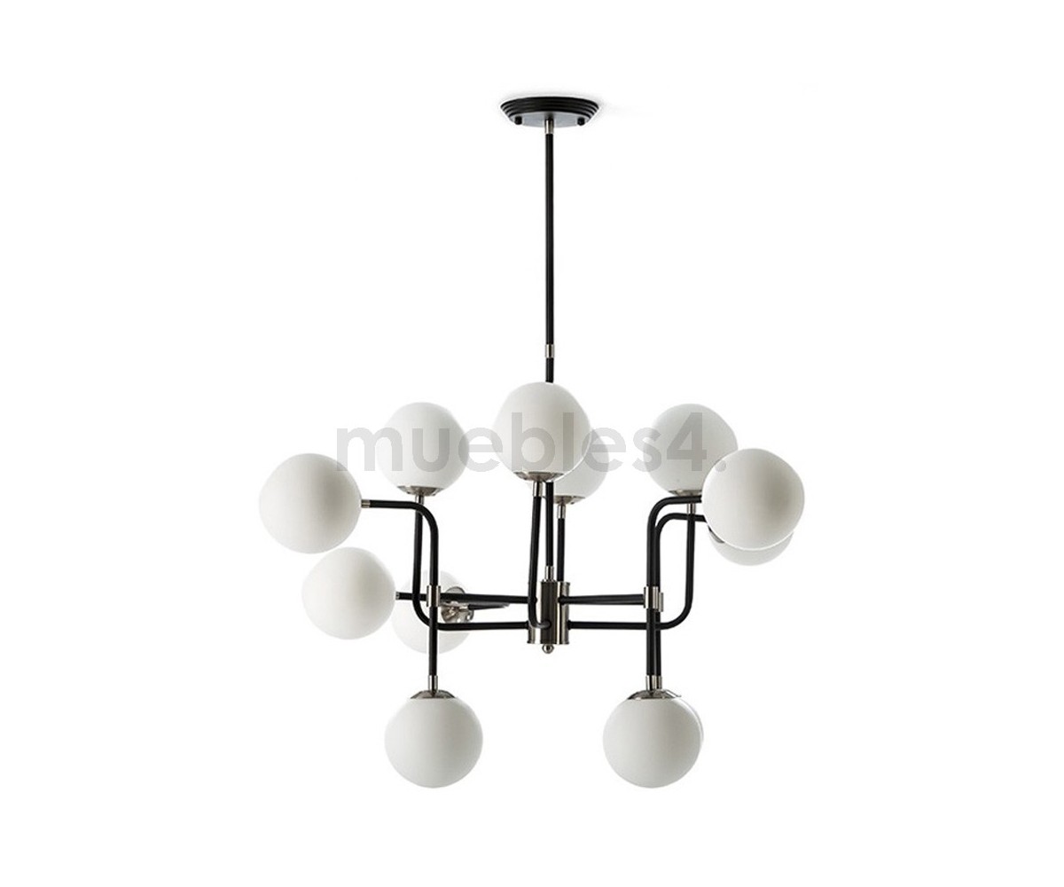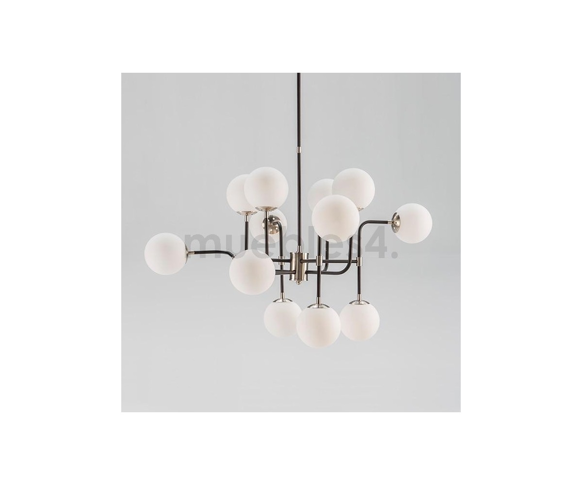 Lámpara de techo inspirada en un diseño Ian K. Fowler. Fabricada en acero color negro, niquel y cristal blanco, con 13 punto de luz. Modelo de bombilla 12 x E14. No requiere montaje. Réplica exacta con materiales originales de máxima calidad.