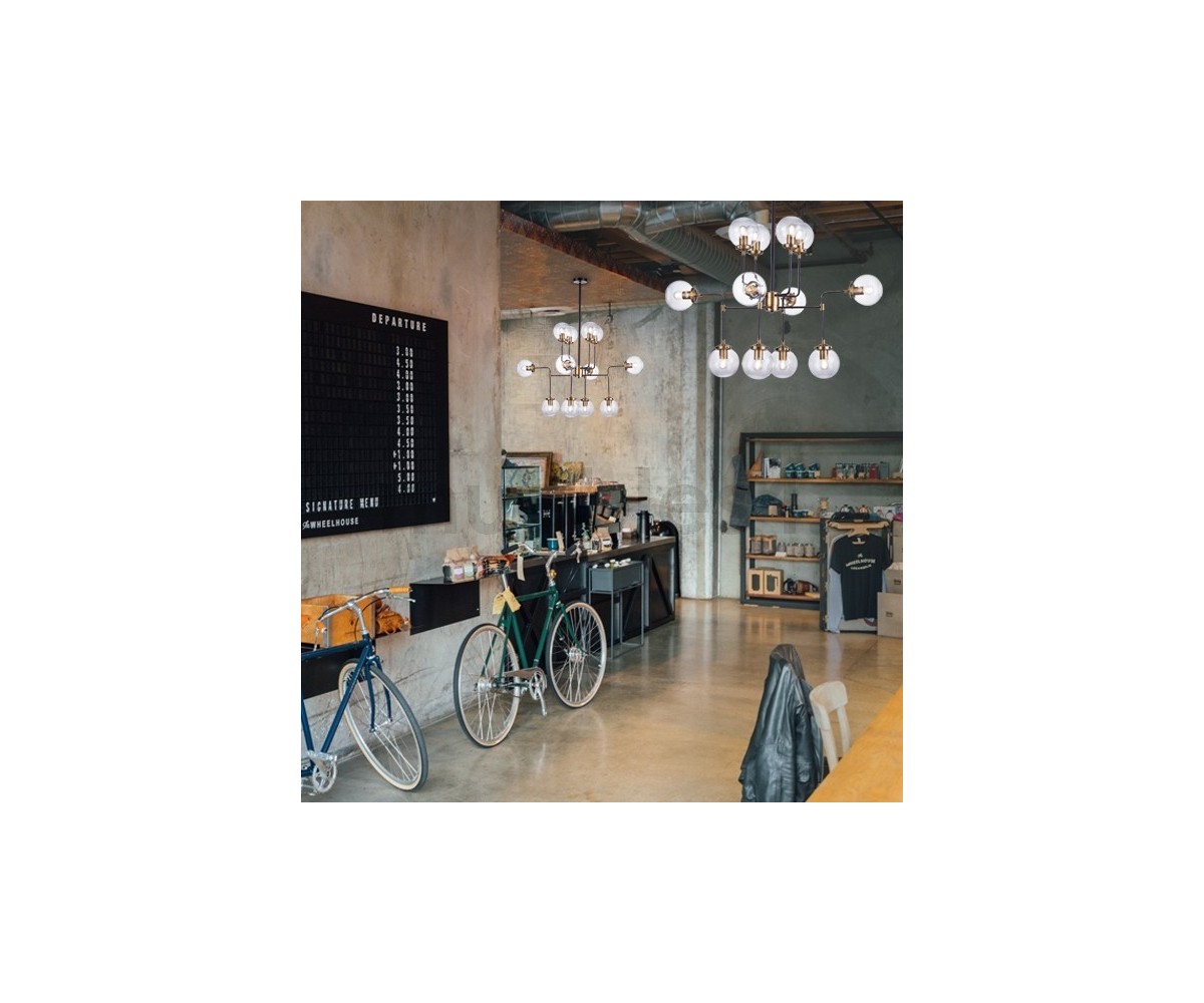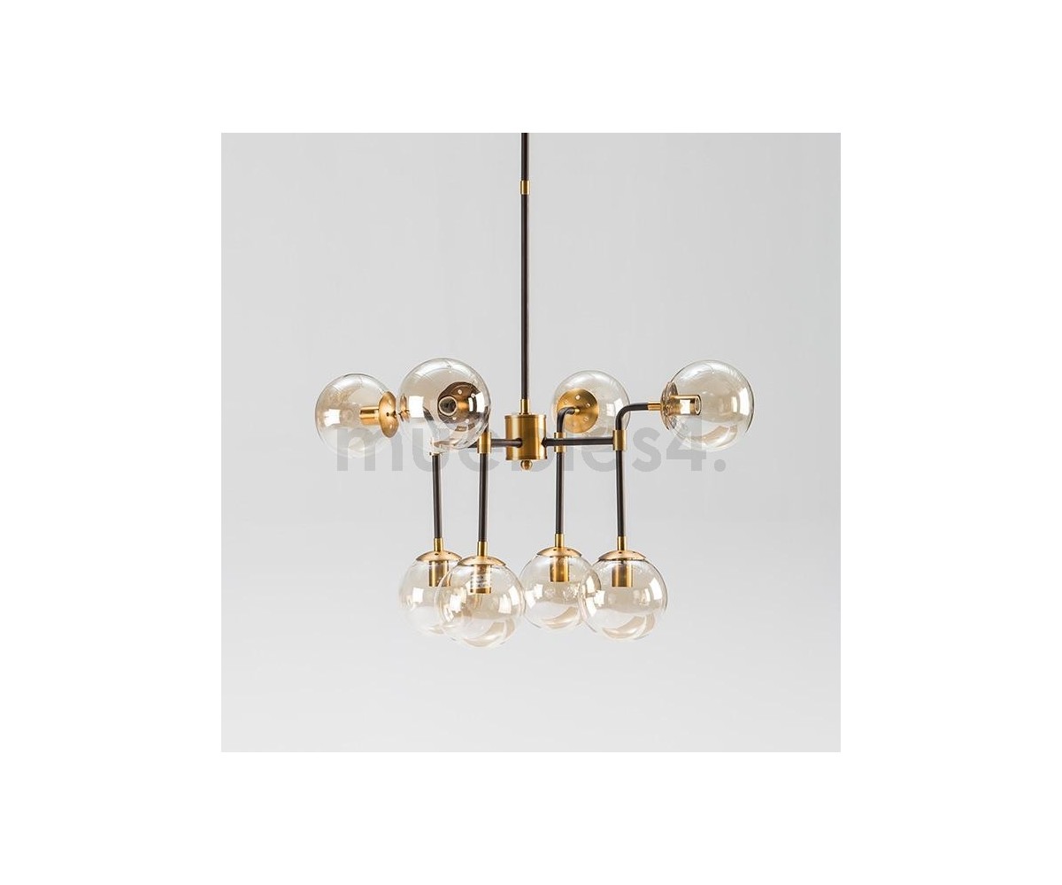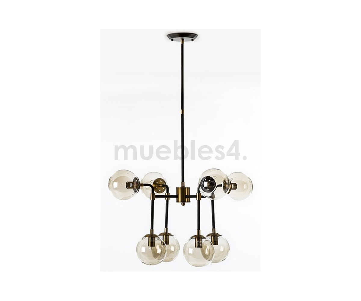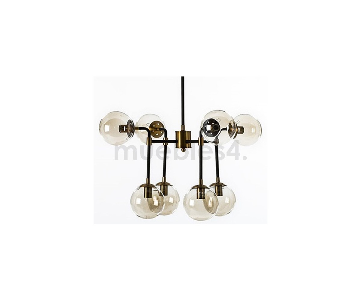 Lámpara de techo inspirada en un diseño Ian K. Fowler. Fabricada en acero color negro y dorado y cristal ambar, con 8 punto de luz. Modelo de bombilla 8 x E14. No requiere montaje. Réplica exacta con materiales originales de máxima calidad.
