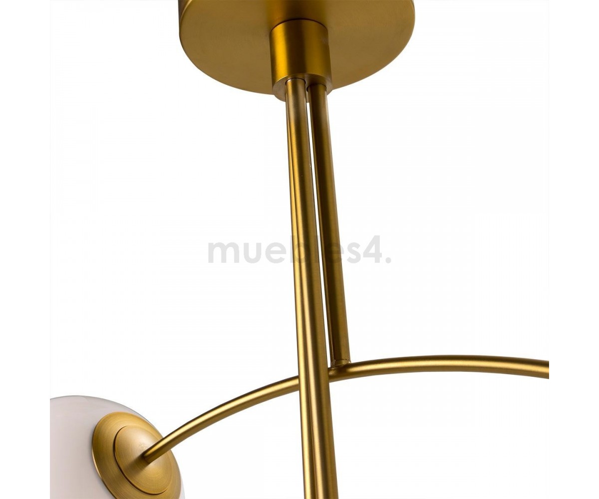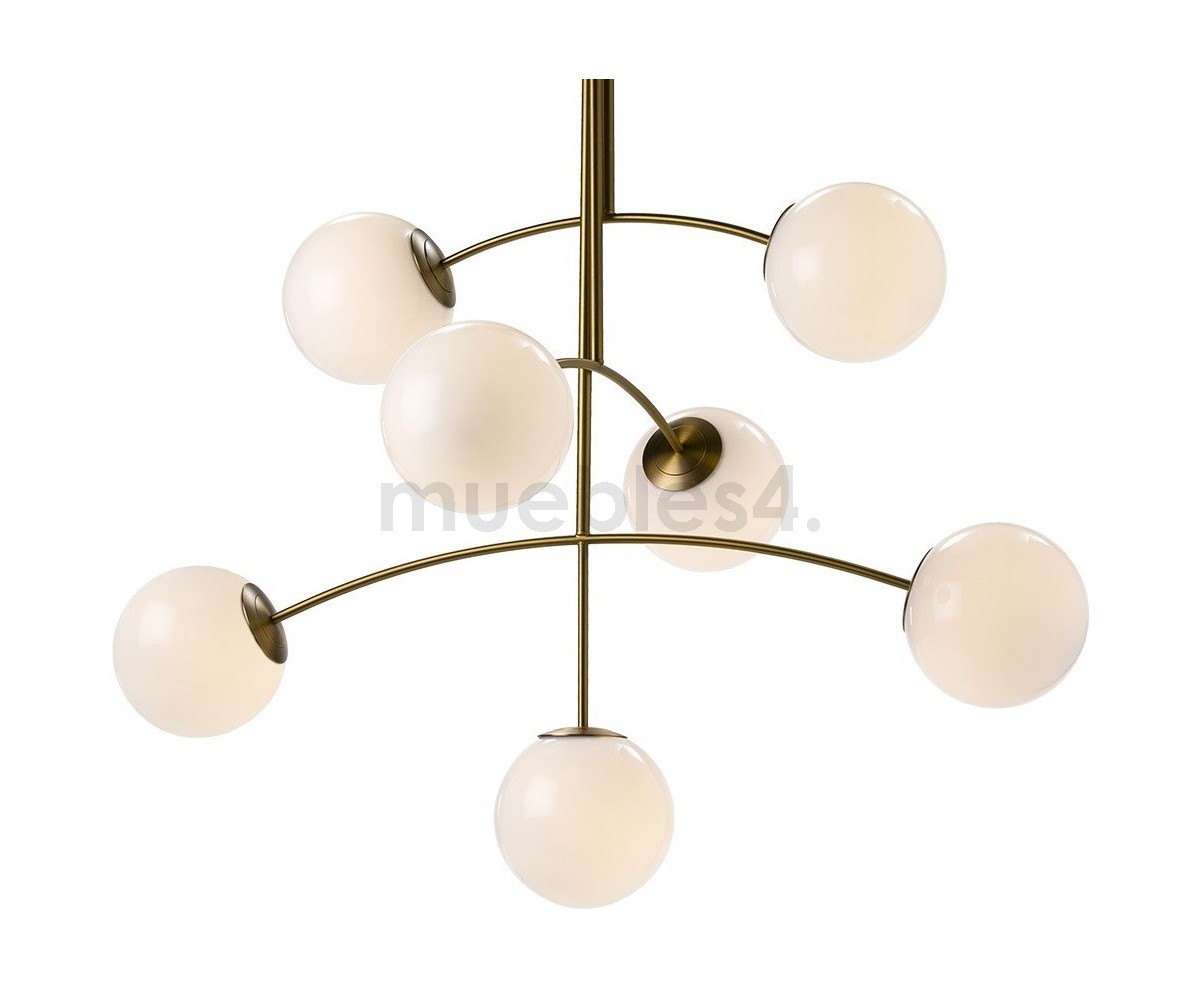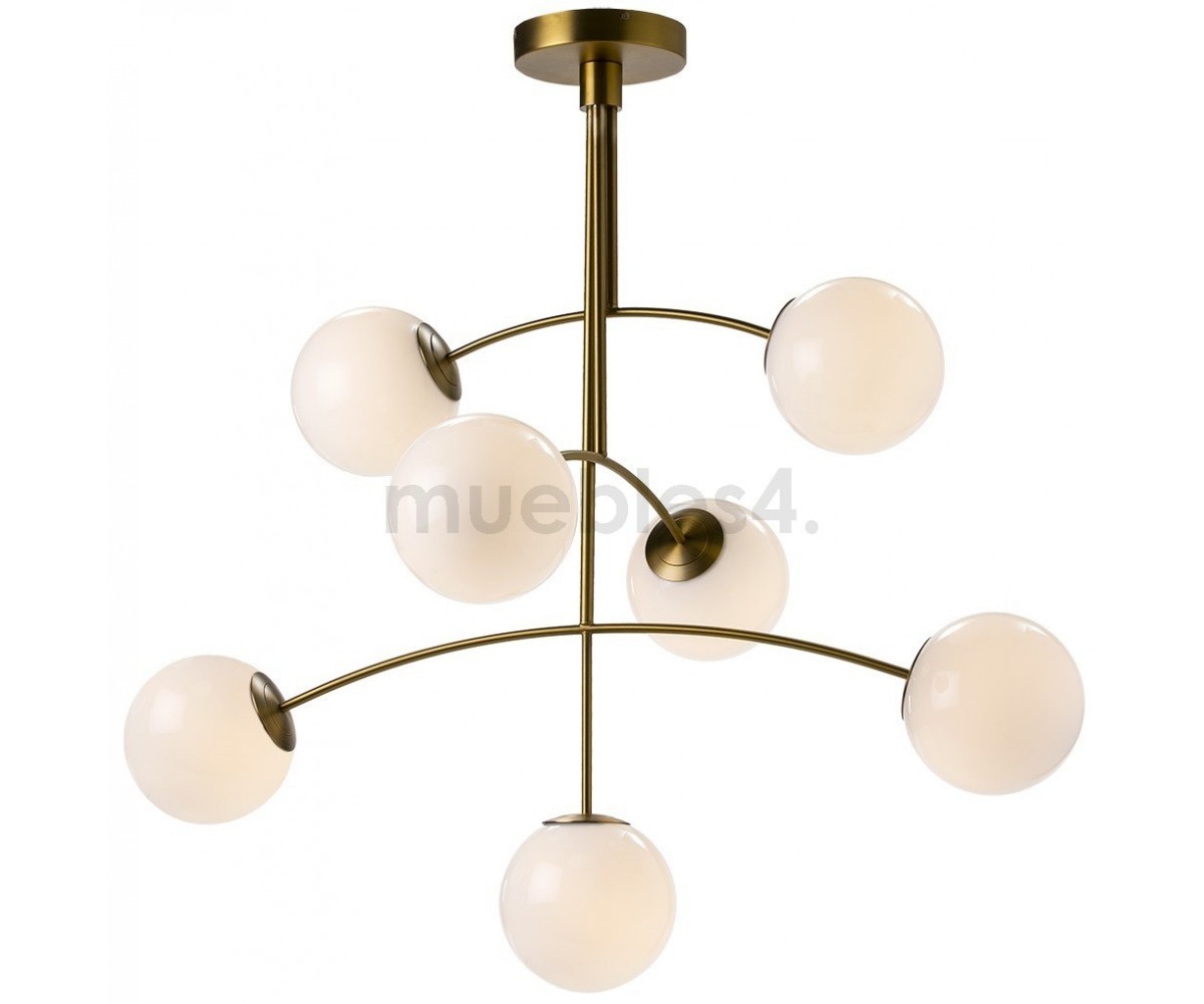 Lámpara de techo inspirada en un diseño de kate Spade New York. Fabricada en acero tubular dorado con siete puntos de luz con tulipas redondas en cristal blanco. Modelo de bombilla 7 x E14 Led, incluida. Réplica exacta con materiales originales de máxima calidad.