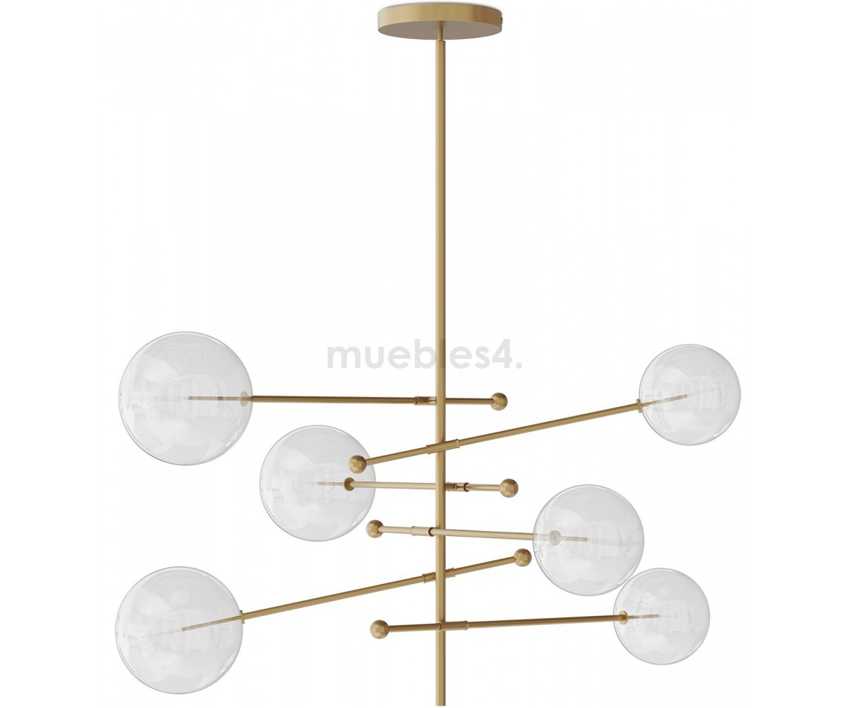 Lámpara de techo inspirada en un diseño de Christopher Marie-Lise Fery. Fabricado en acero tubular dorado, terminación envejecido, tulipas formadas por 6 bolas de cristal templado. Voltaje LED G4 220w x 6, no incluidas. También disponible en pared y sobremesa. Réplica con materiales originales de máxima calidad.