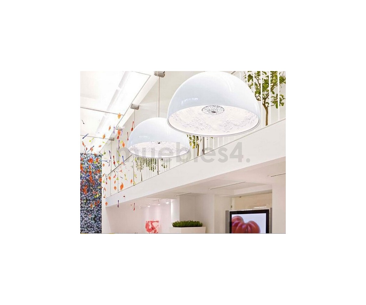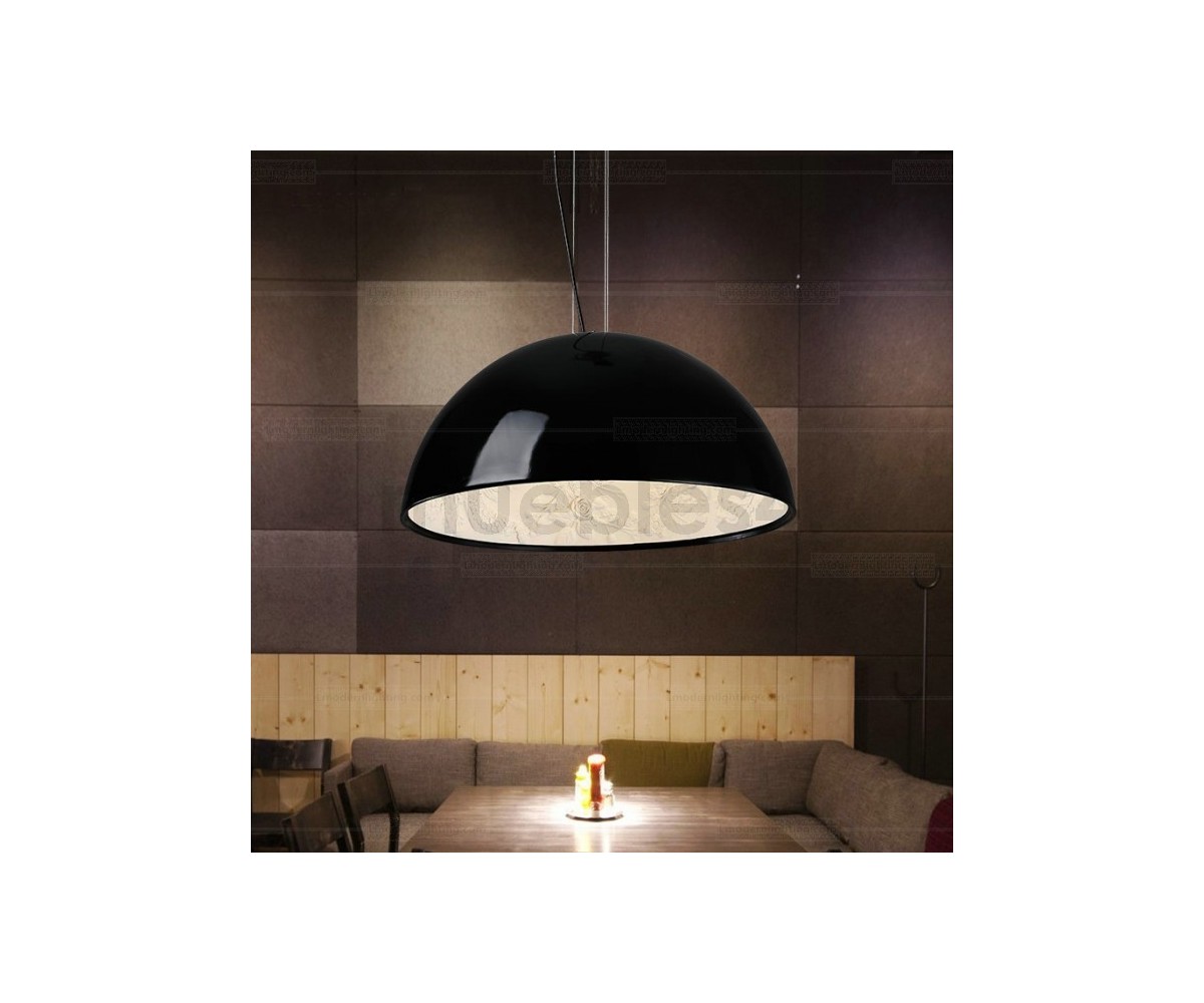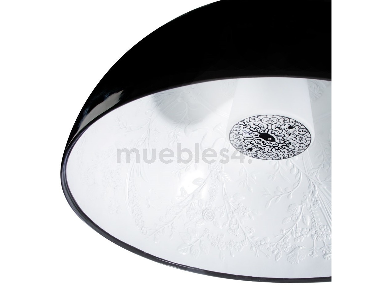 Lámpara suspendida circular, réplica de un diseño de Marcel Wanders. Interior fabricada en resina con decoracion en relieve color blanco, exterior en fibra de vidrio color negro o blanco. Largo del cable 1.15cm. Modelo de bombilla E27. Réplica exacta con materiales originales de máxima calidad.
