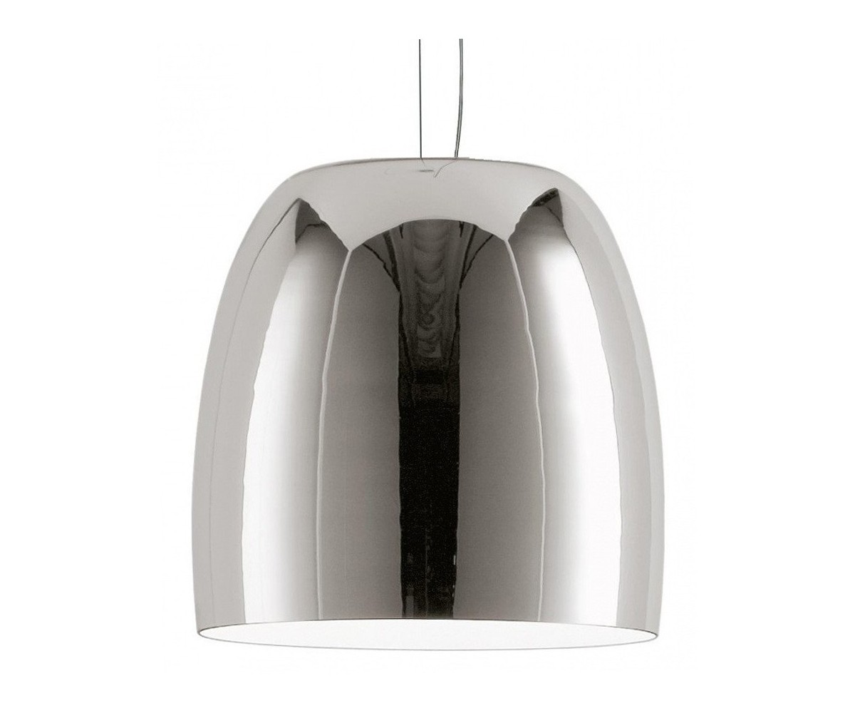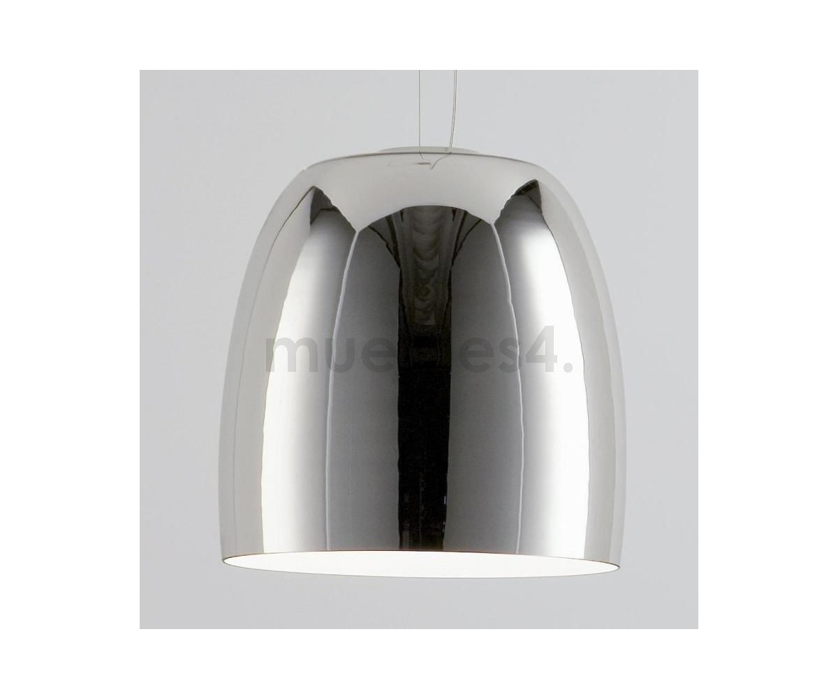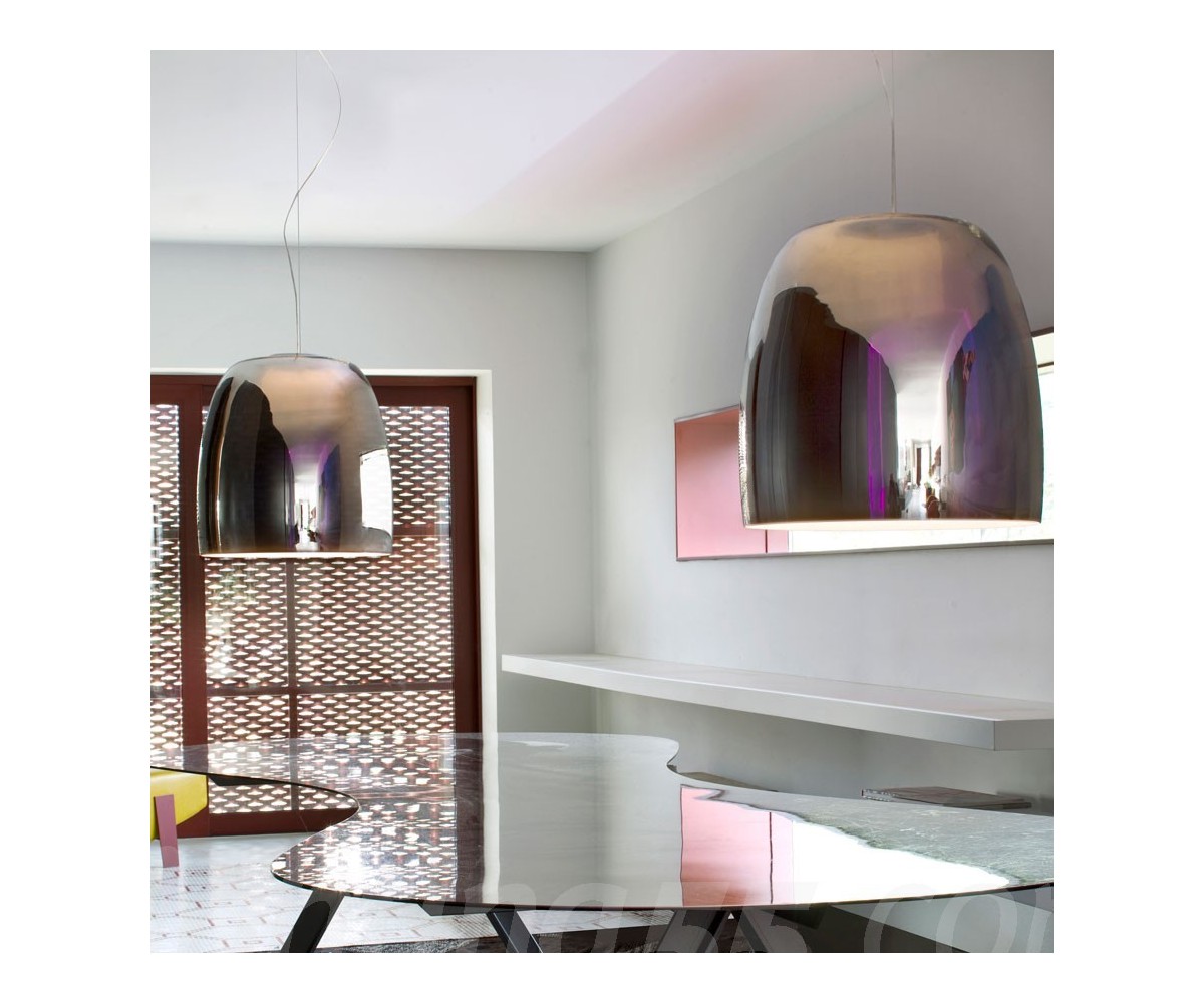 Lámpara suspendida, inspirada en un diseño Mario Mengotti y Sergio Prandina. Faricada en acero cromado y cristal. Modelo de bombilla E27. Réplica exacta con materiales originales de máxima calidad.