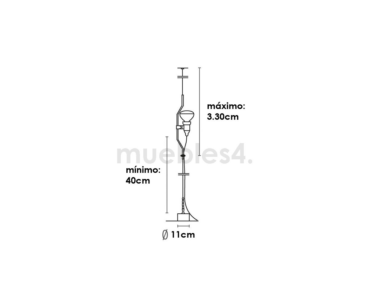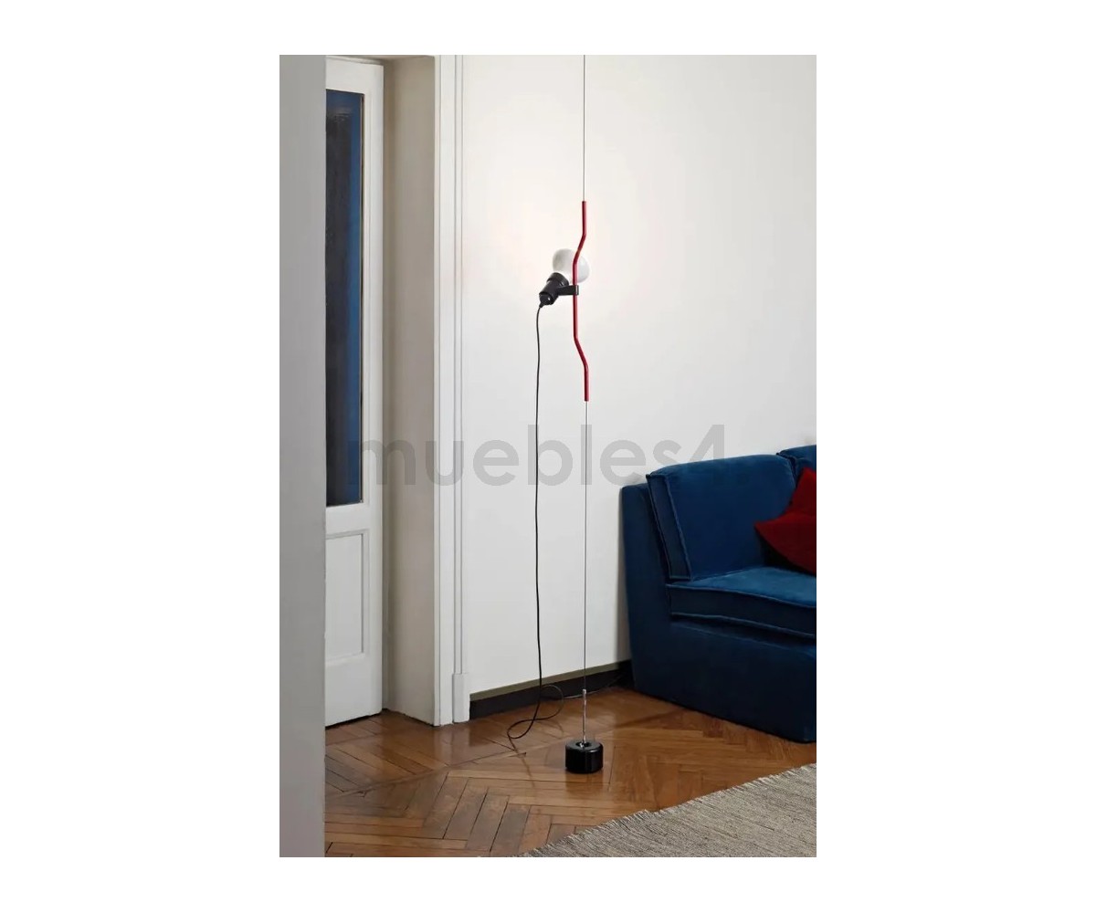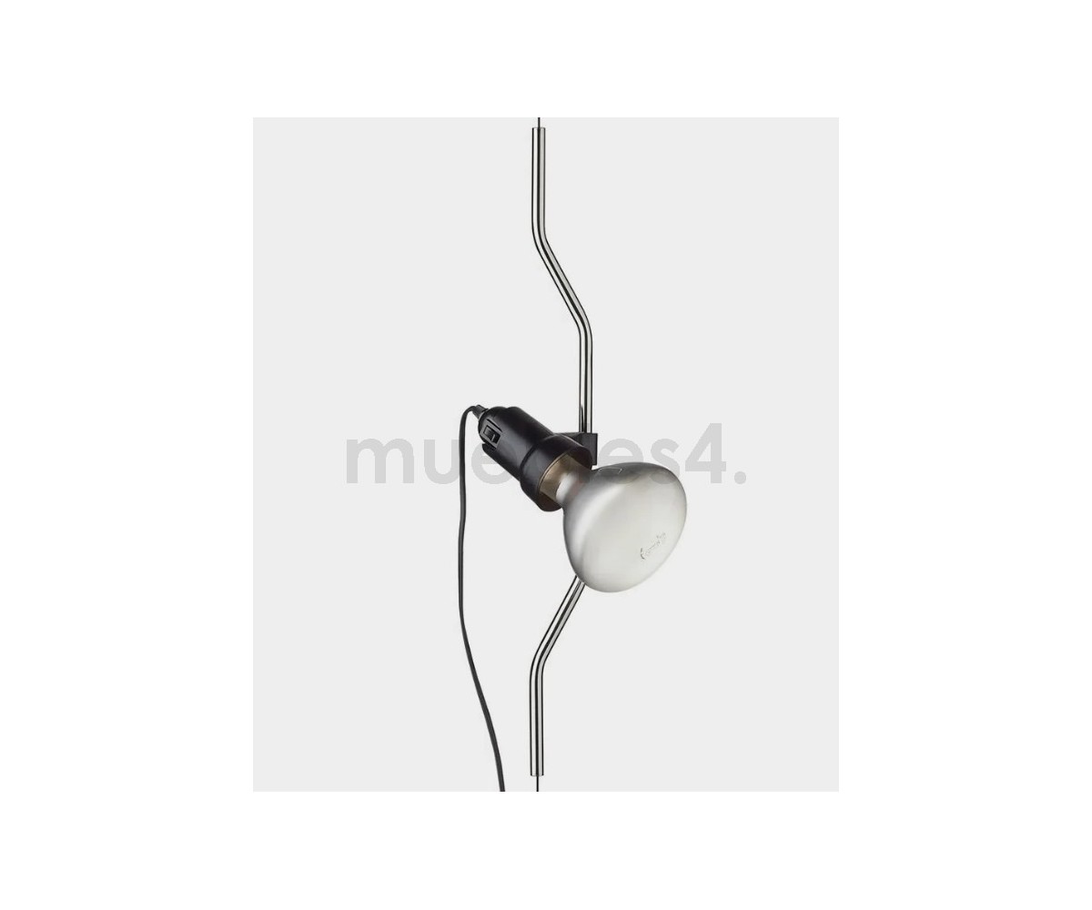 Lámpara suspendida, inspirada en un diseño de Achille Castiglioni y Pio Manzú. Lámpara de techo a suelo que esconde una ingeniosa técnica que nos permite subir o bajar fácilmente el punto de luz y enfocar el casquillo hacia dónde queramos. El movimiento vertical del cuerpo de luz se obtiene mediante el deslizamiento de un tubo en acero perfilado.