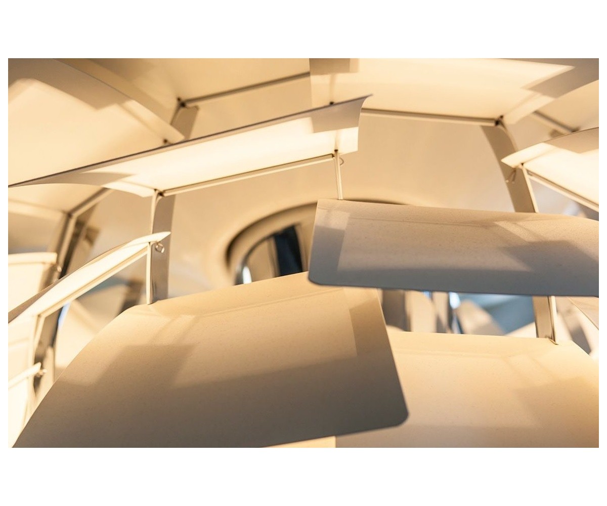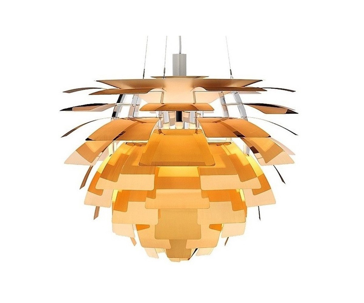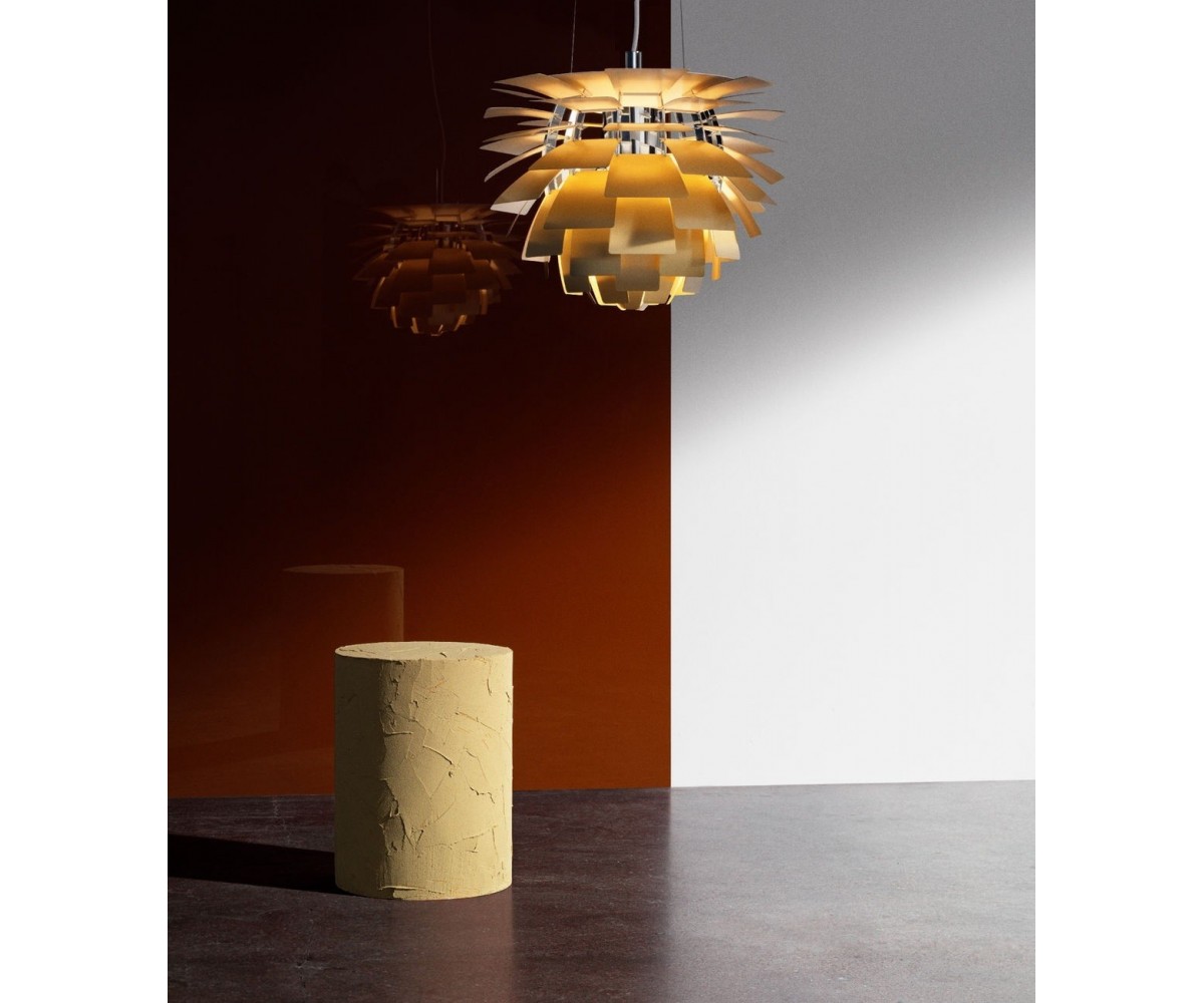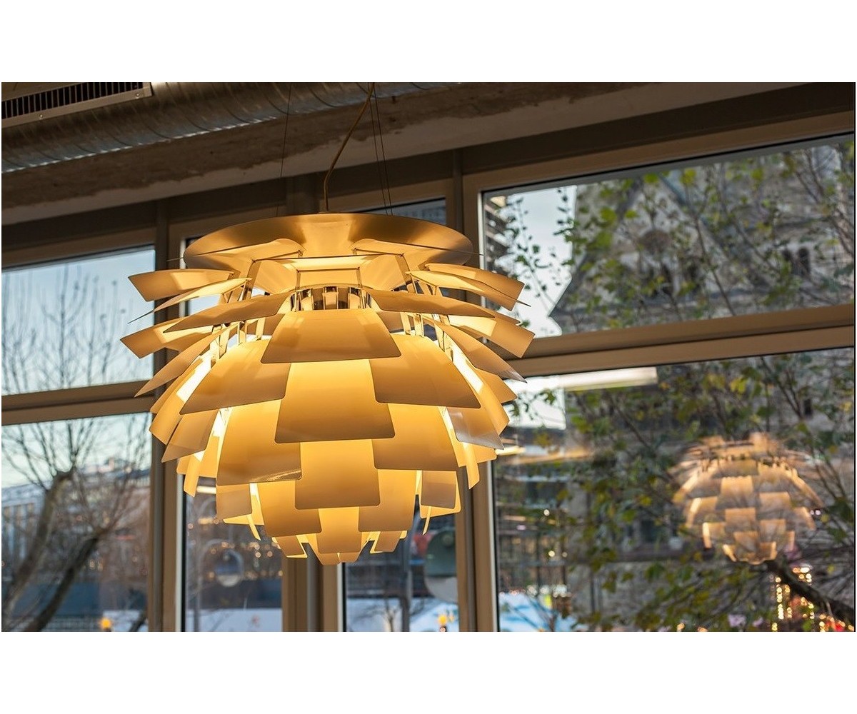 Lámpara suspendida, inspirada en un diseño de Poul Henningsen. Ilumina cualquier espacio con una iluminación 100 % sin deslumbramiento gracias a sus hojas, que forma hileras cuidadosamente situadas a mano. La luminaria garantiza que la luz se distribuya tanto hacia el interior como hacia el exterior y emite así una luz atractiva y confortable. Fue diseñada en 1958 para el restaurante Langelinie Pavillonen de Copenhage.