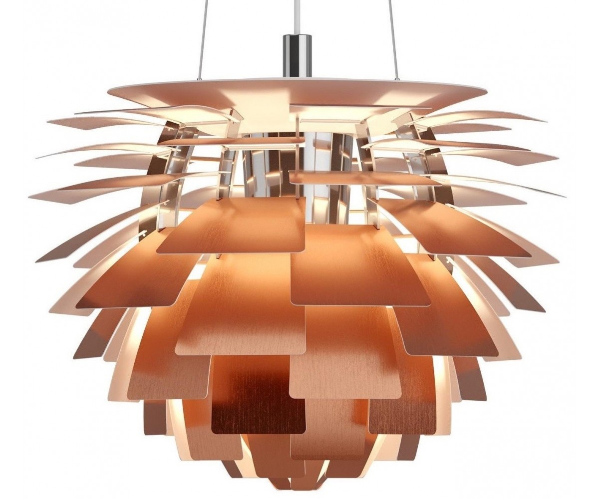 Lámpara suspendida, inspirada en un diseño de Poul Henningsen. Fabricada mediante laminas color oro o bronce. Elaborada en aluminio y acero. Modelo de bombilla E27. El artículo se envía montado. Requiere montaje. Réplica exacta con materiales originales de máxima calidad.