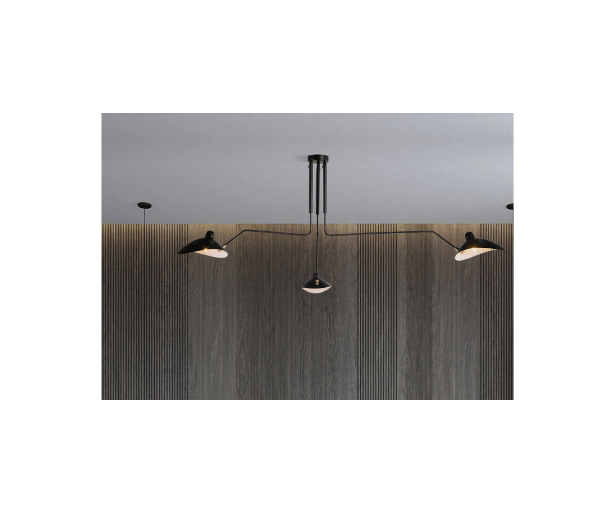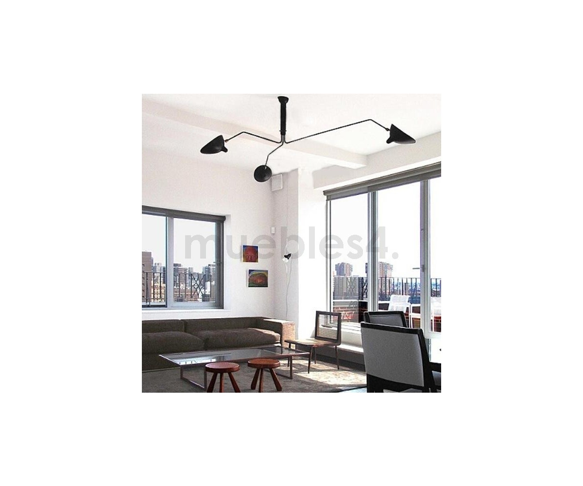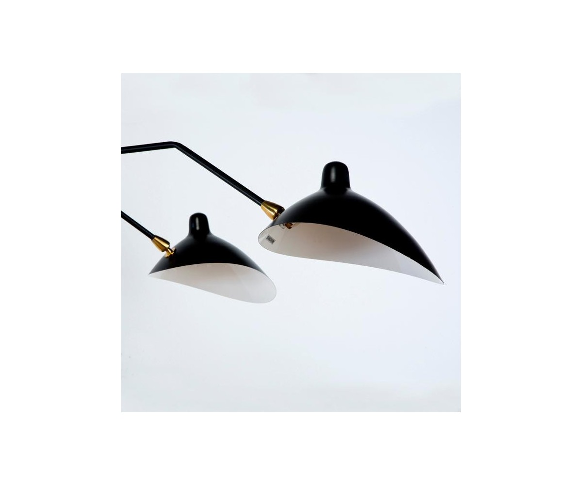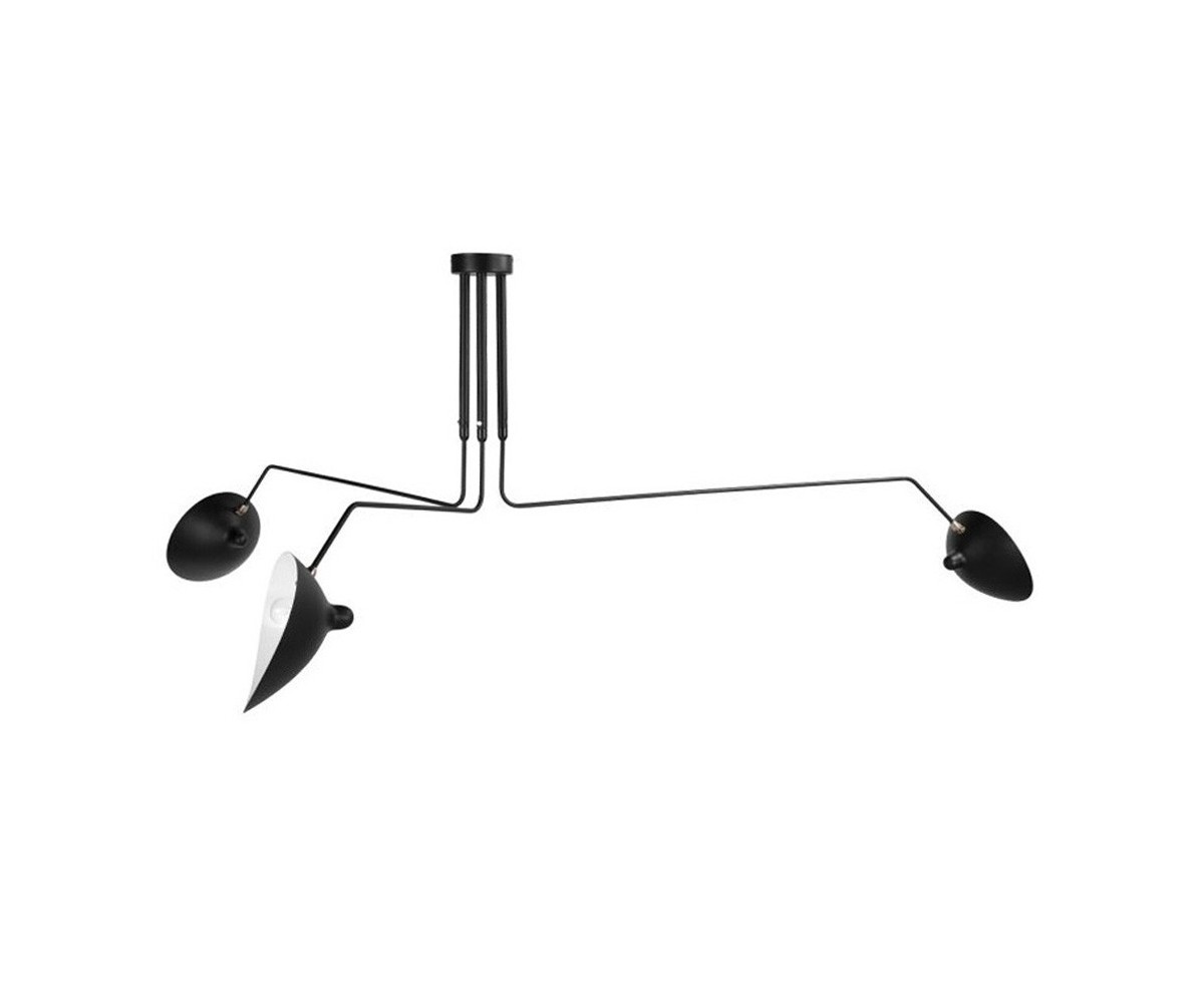 Lámpara de techo inspirada en un diseño de Serge Mouille. Fabricada en acero y cobre, TRIPLE LACADO en color negro. Difusor orientable. Modelo de bombilla E27. Medidas Brazos: 1- 134cm. 2- 110cm. 3- 85cm. Réplica exacta con materiales originales de máxima calidad.
