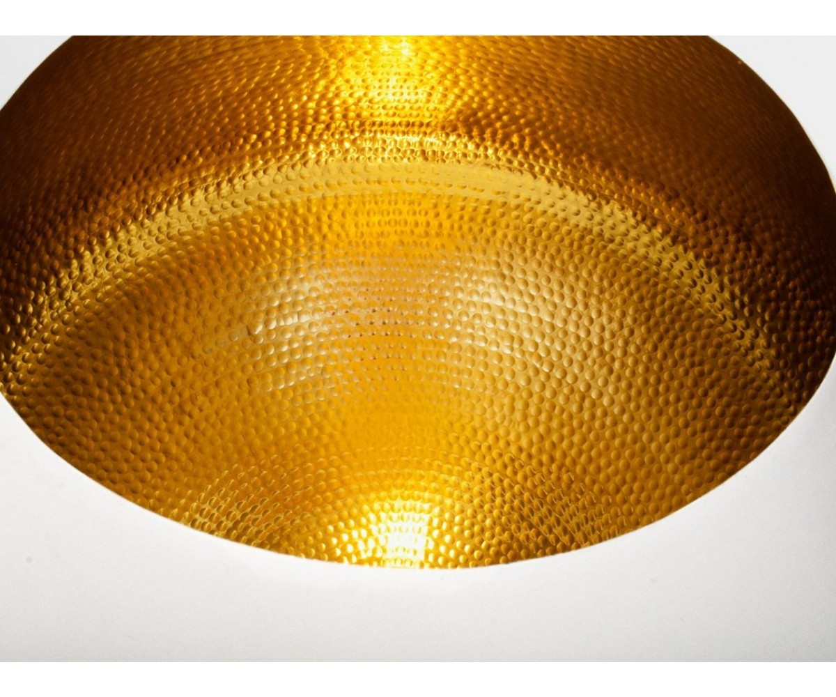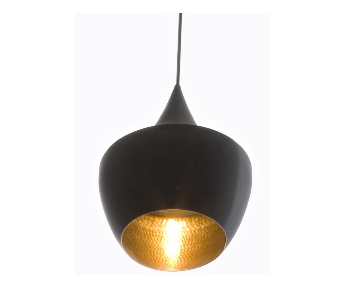 Lámpara suspendida inspirada en un diseño de Tom Dixon. Realizada en acero con TRIPLE lacado con pintura de epoxi de alta resistencia, color exterior negro, color interior oro/dorado con grabado en relieve de escamas. Longitud de cable 120cm aprox. Modelo de bombilla E27 máximo 60w. Réplica exacta con materiales originales de máxima calidad.