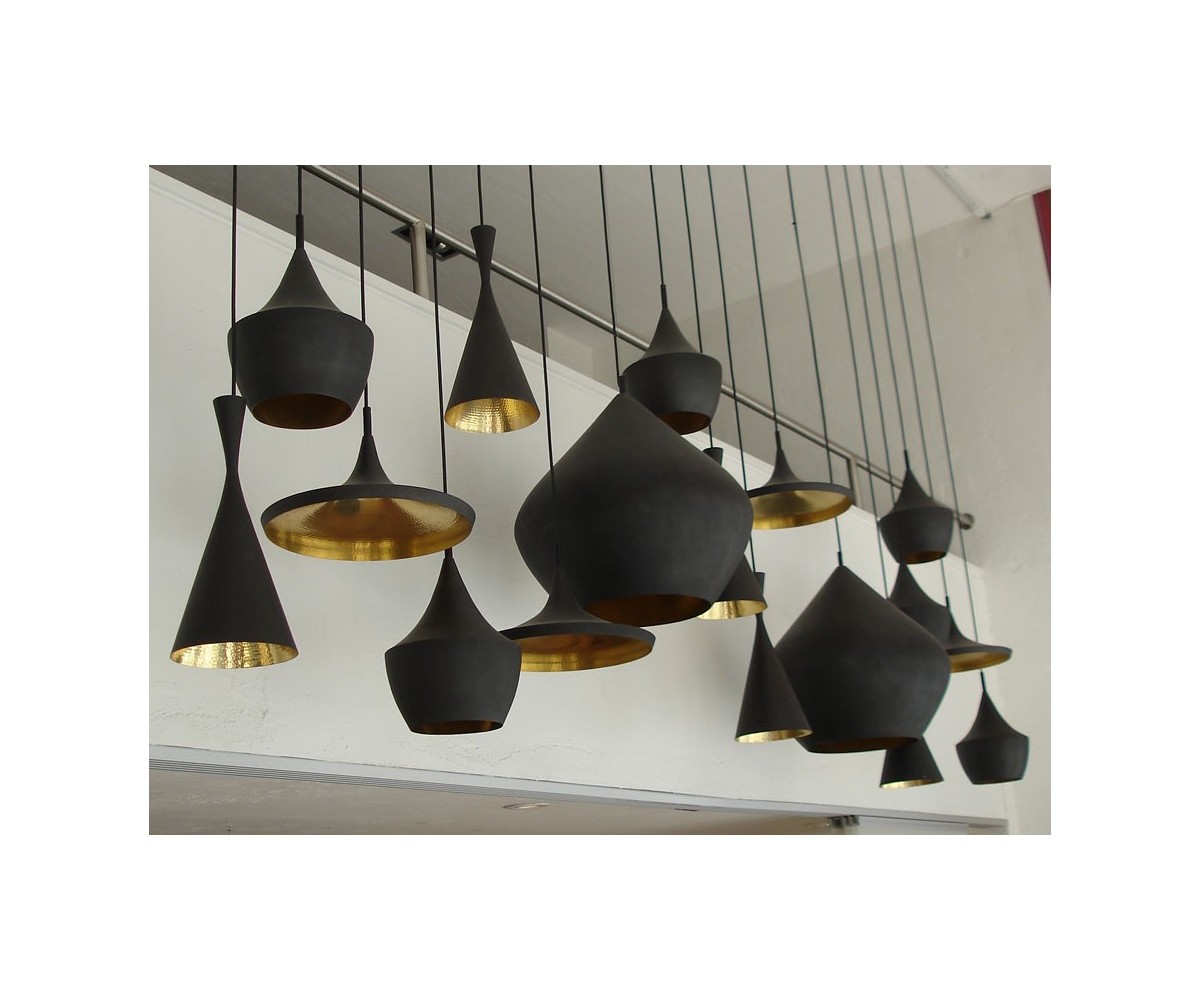 Lámpara suspendida inspirada en un diseño de Tom Dixon. Realizada en acero con TRIPLE lacado con pintura de epoxi de alta resistencia, color exterior negro, color interior oro/dorado con grabado en relieve de escamas. Longitud de cable 120cm aprox. Modelo de bombilla E27 máximo 60w.  Réplica exacta con materiales originales de máxima calidad.