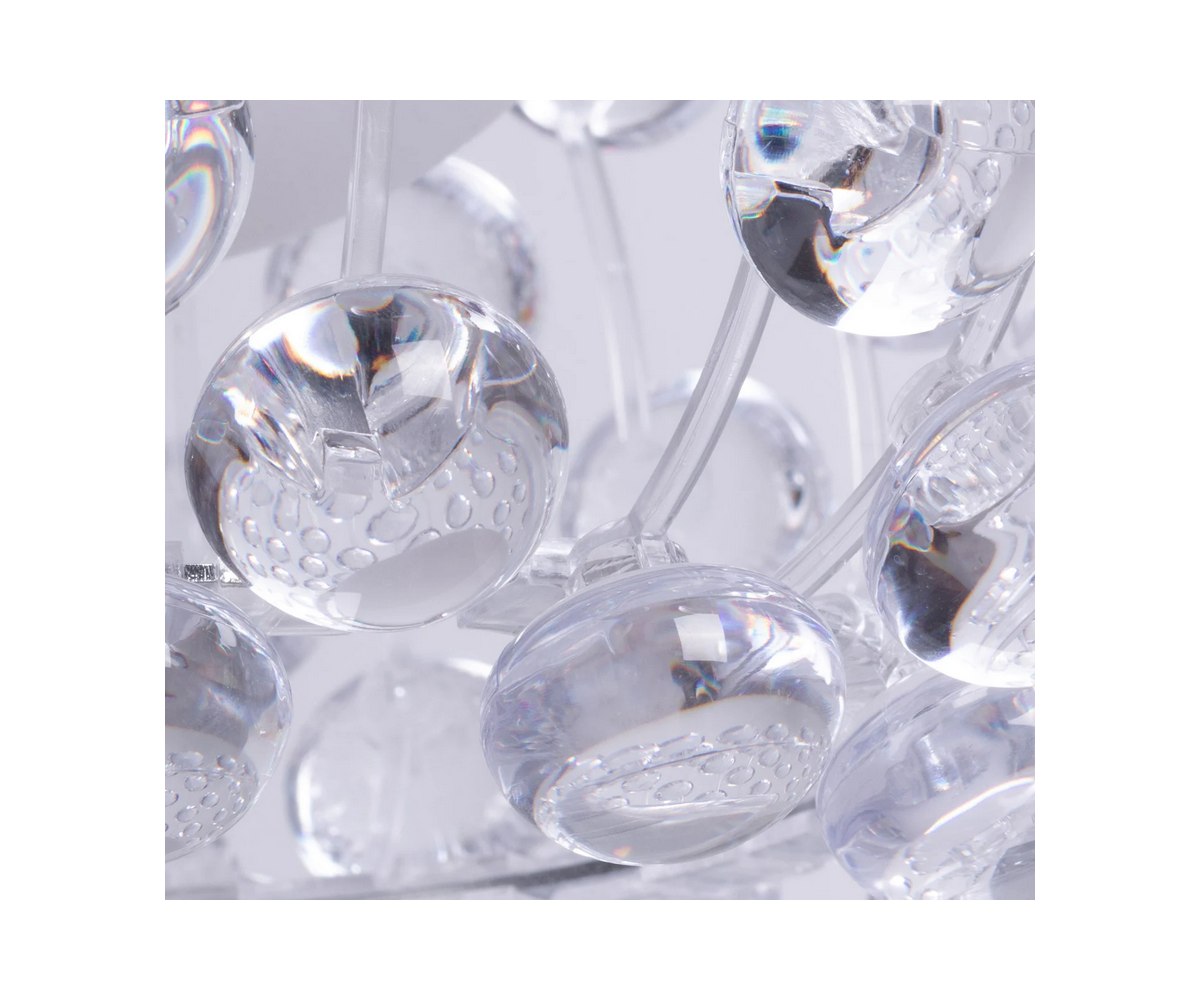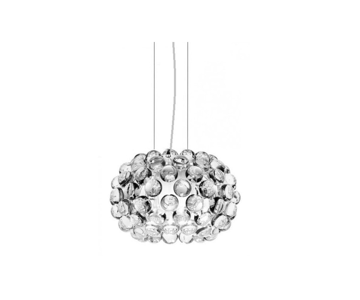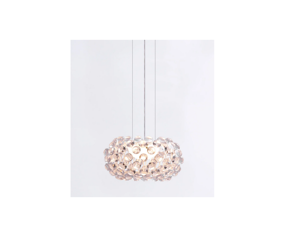 Lámpara suspendida circular, inspirada en un diseño de Patricia Urquiola y Eliana Gerotto. Realizada con esferas de metracrilato-acrílic y vidrio circular terminación transparente. Modelo de bombilla E27. Largo del cable 1.5 cm. Se entrega desmontda. Réplica exacta con materiales originales de máxima calidad.