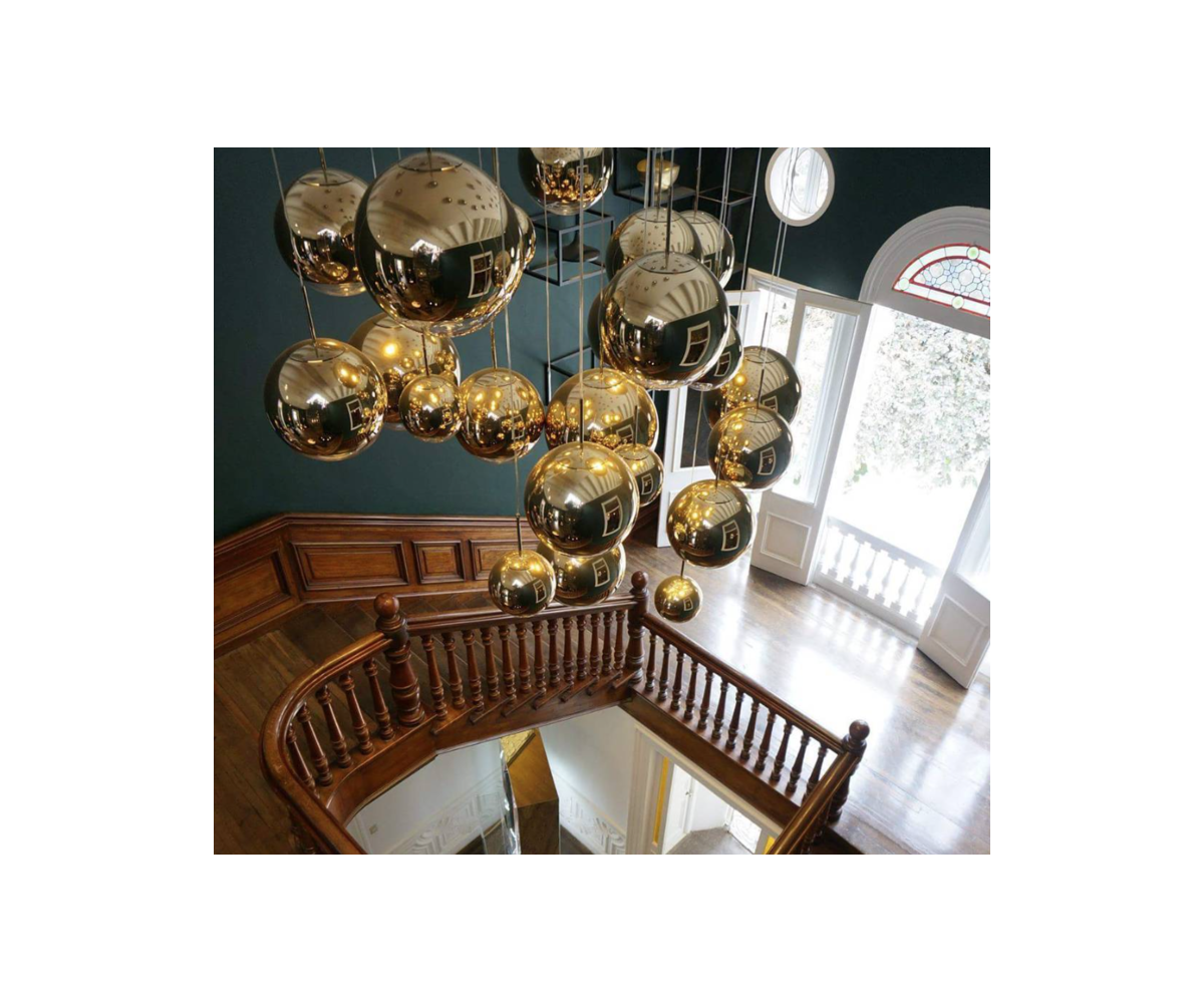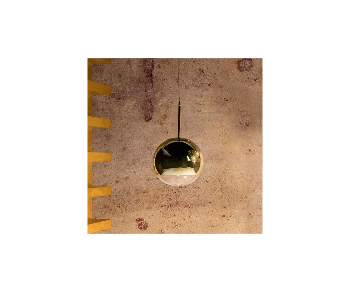Lámpara suspendida circular, inspirada en un diseño de Tom Dixon. Fabricada en acero y cristal, terminación dorado y transparente. Modelo de bombilla E27. Réplica exacta con materiales originales de máxima calidad.