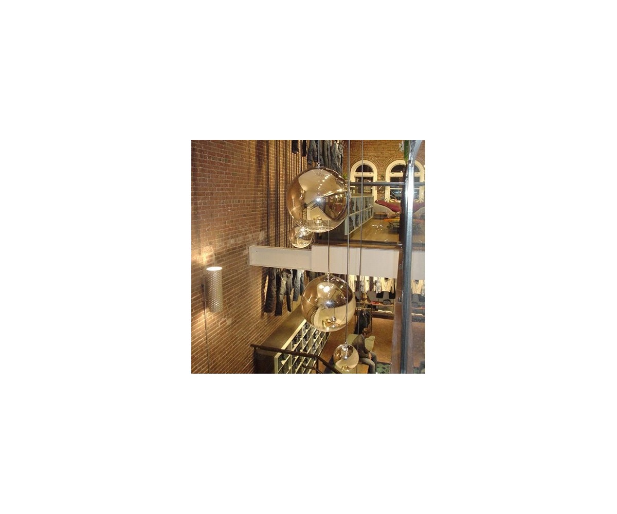 Lámpara suspendida circular, inspirada en un diseño de Tom Dixon. Fabricada en acero y cristal, terminación dorado y transparente. Modelo de bombilla E27. Réplica exacta con materiales originales de máxima calidad.