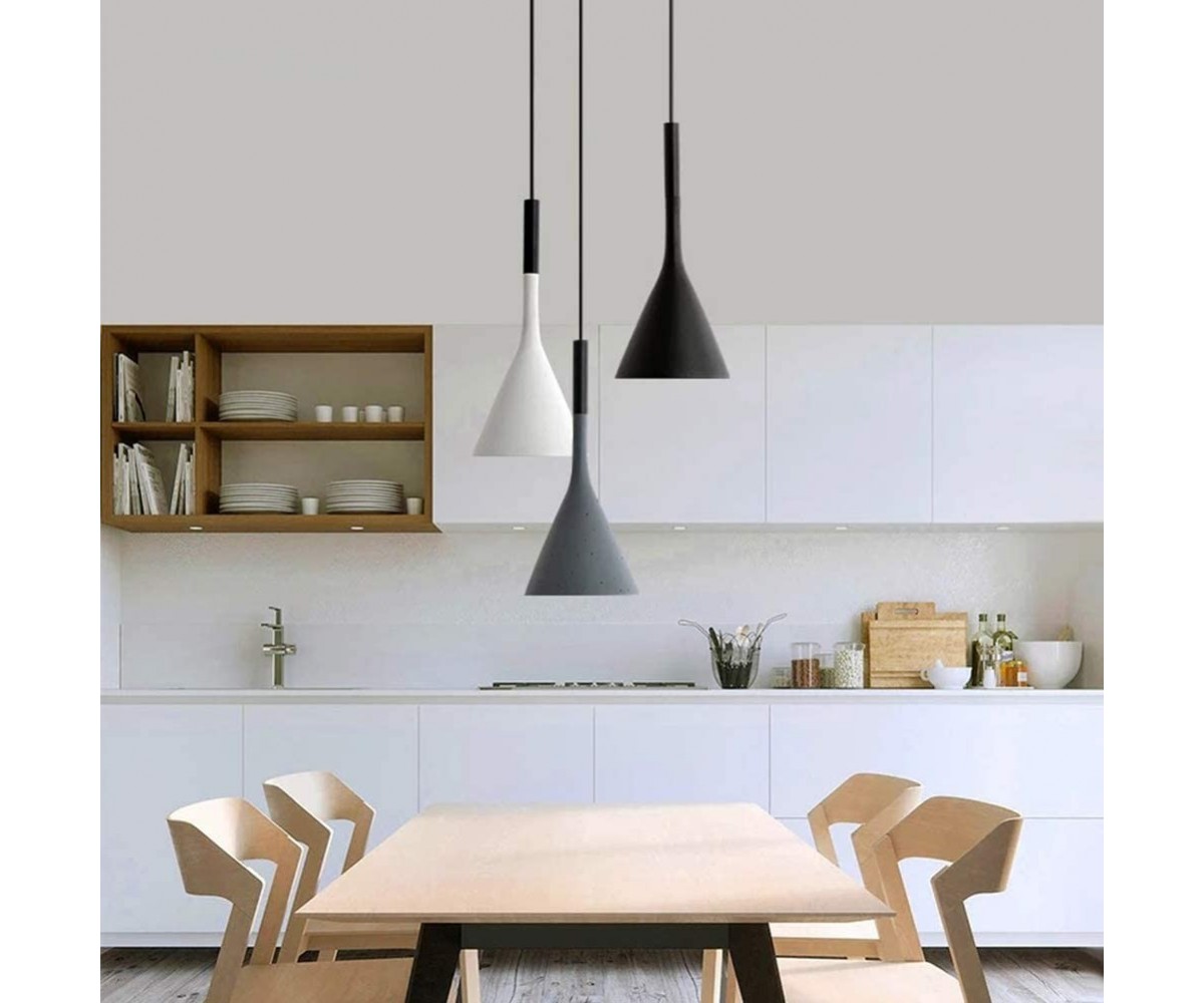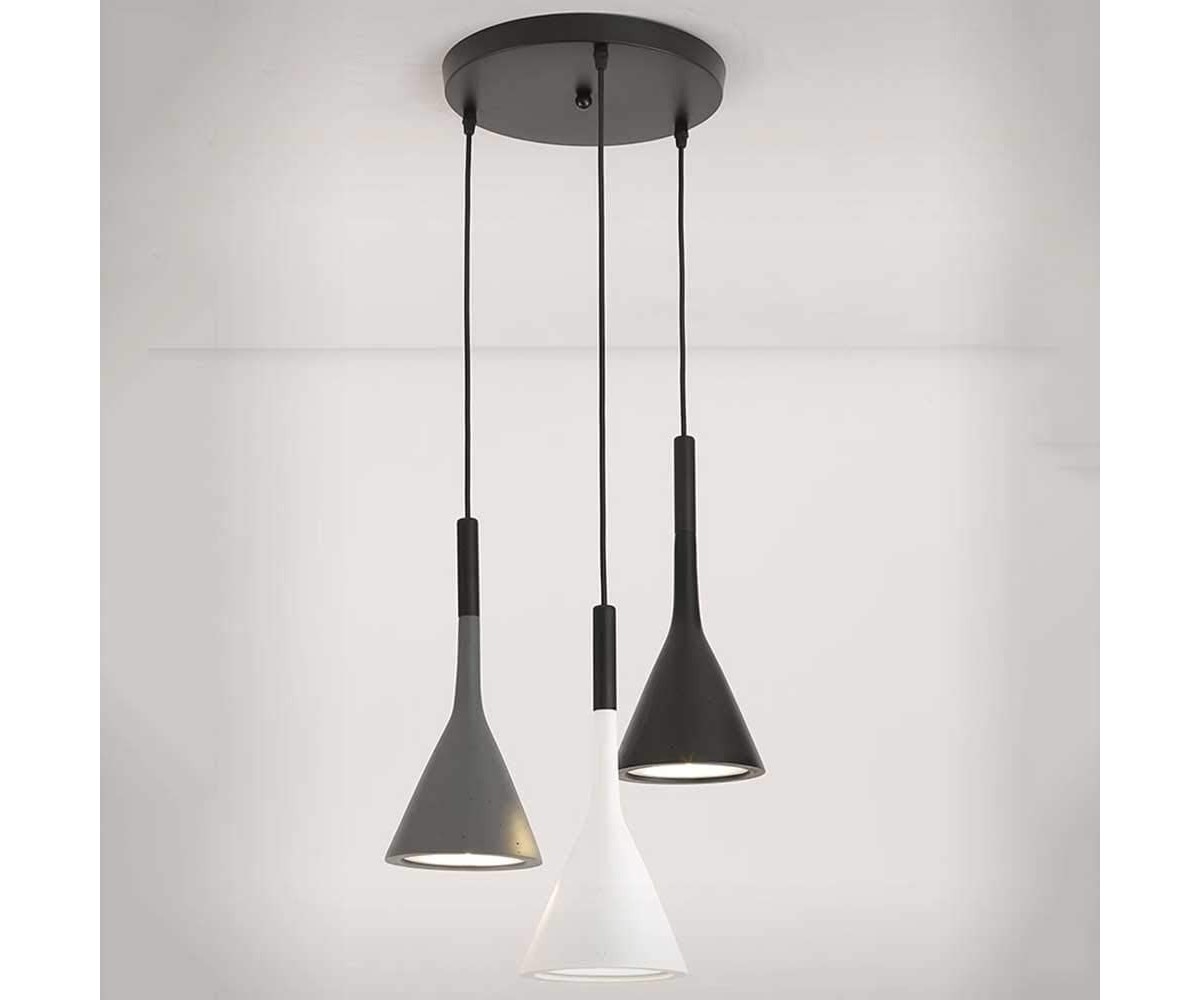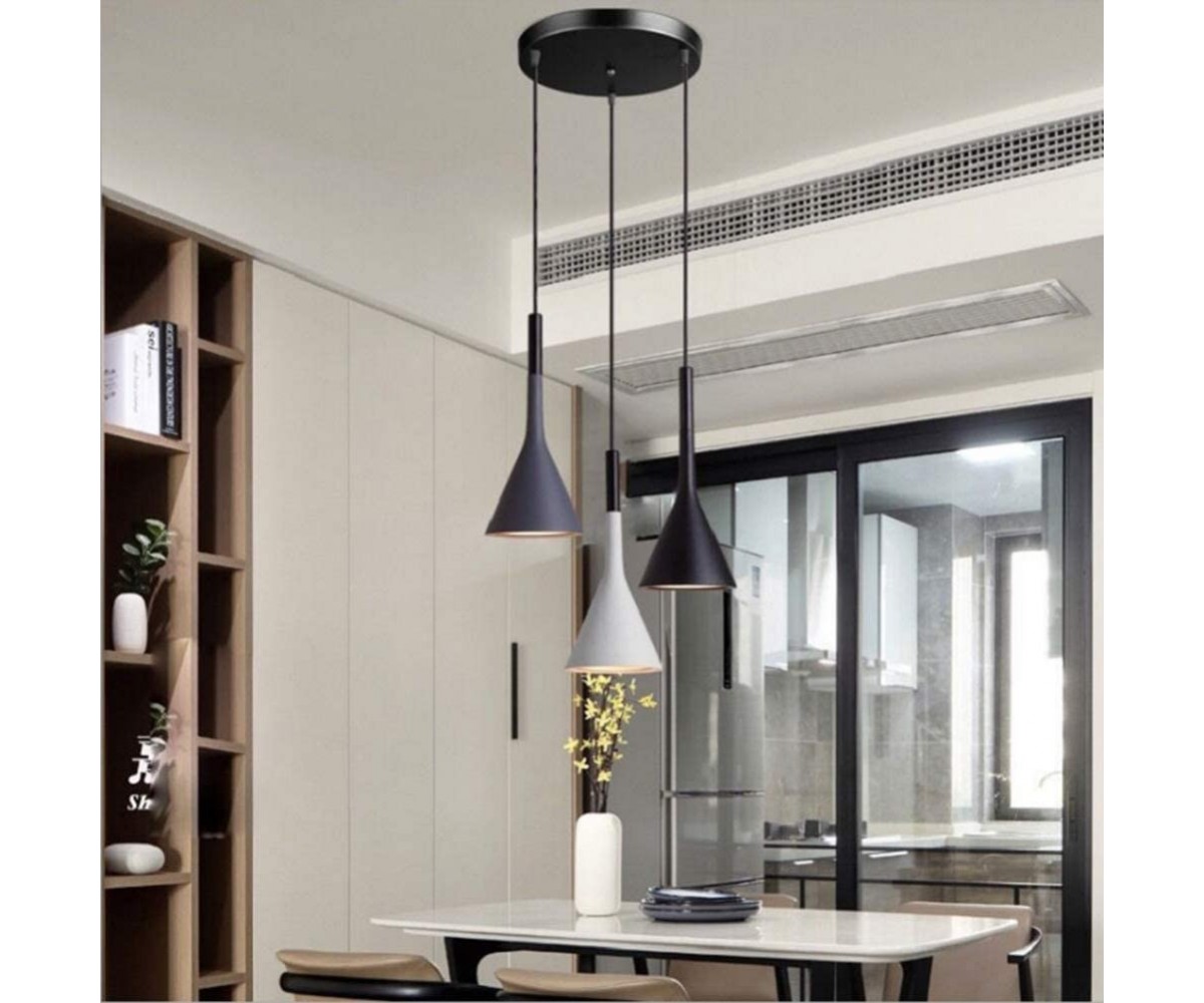 Lámpara suspendida de 3 focos, inspirada en un diseño de Luca Pevere y Paolo Lucidi. Tulipas fabricadas en acero color gris, negro o blanco. rosetón circular negro lacado al horno en color negro. Máxima calidad. Modelo de bombilla 3 x E27 (no incluida). Ajustable en altura. Réplica exacta con materiales originales de máxima calidad.