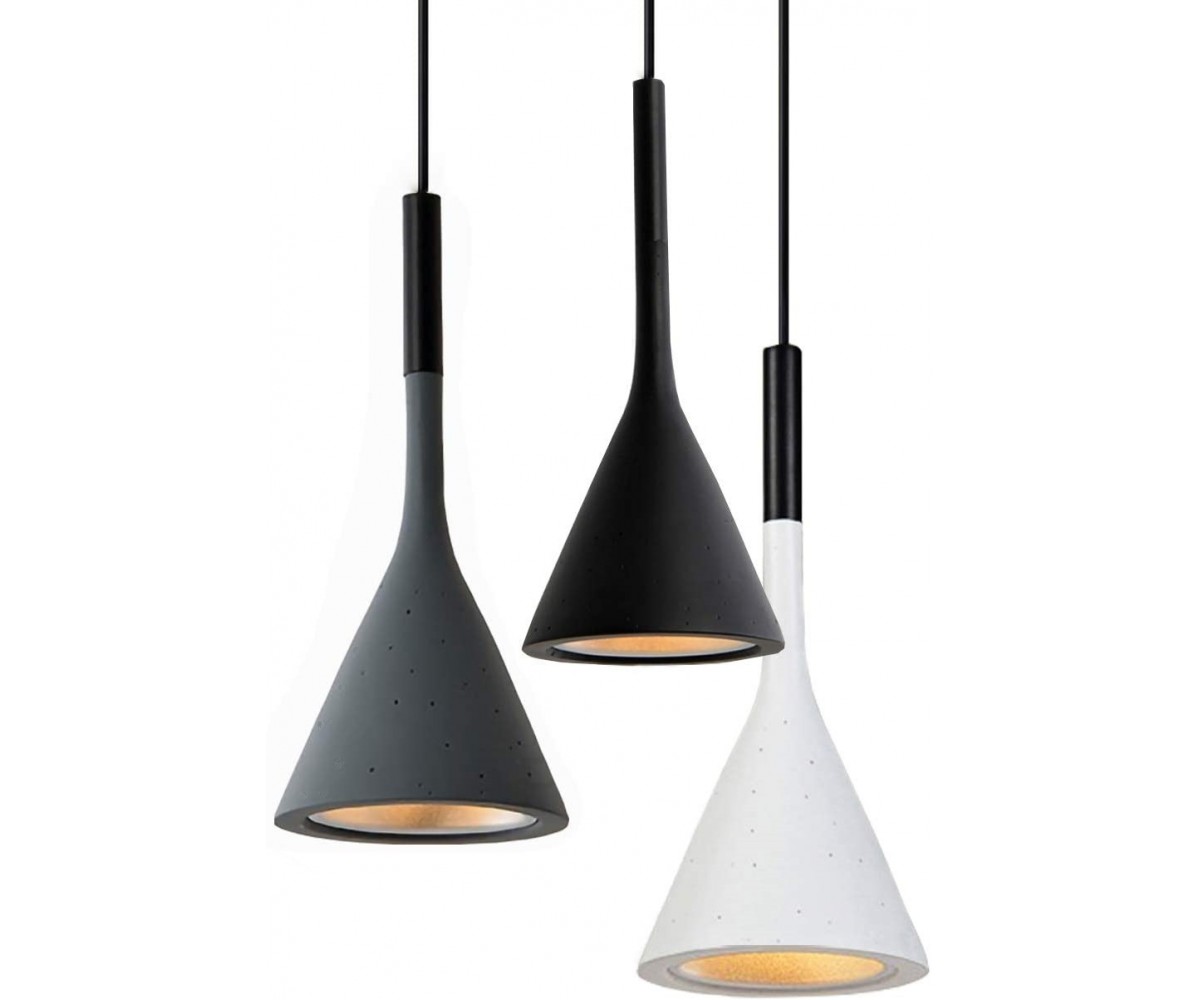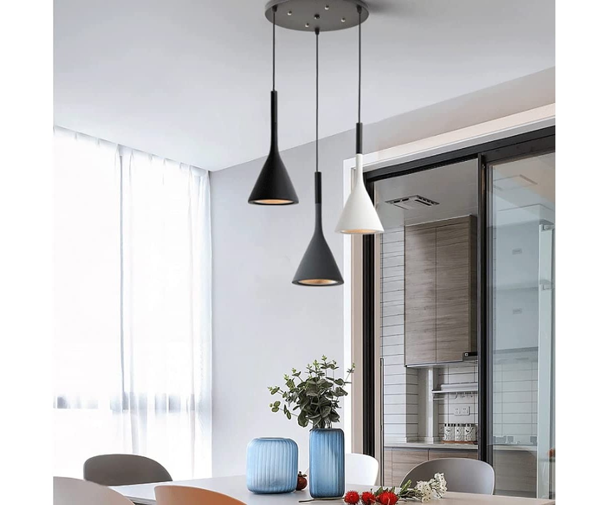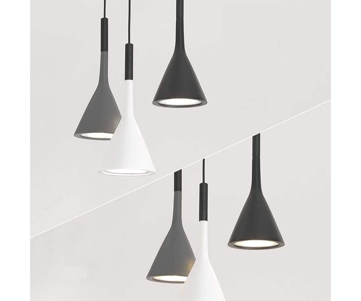 Lámpara suspendida de 3 focos, inspirada en un diseño de Luca Pevere y Paolo Lucidi. Tulipas fabricadas en acero color gris, negro o blanco. rosetón circular negro lacado al horno en color negro. Máxima calidad. Modelo de bombilla 3 x E27 (no incluida). Ajustable en altura. Réplica exacta con materiales originales de máxima calidad.