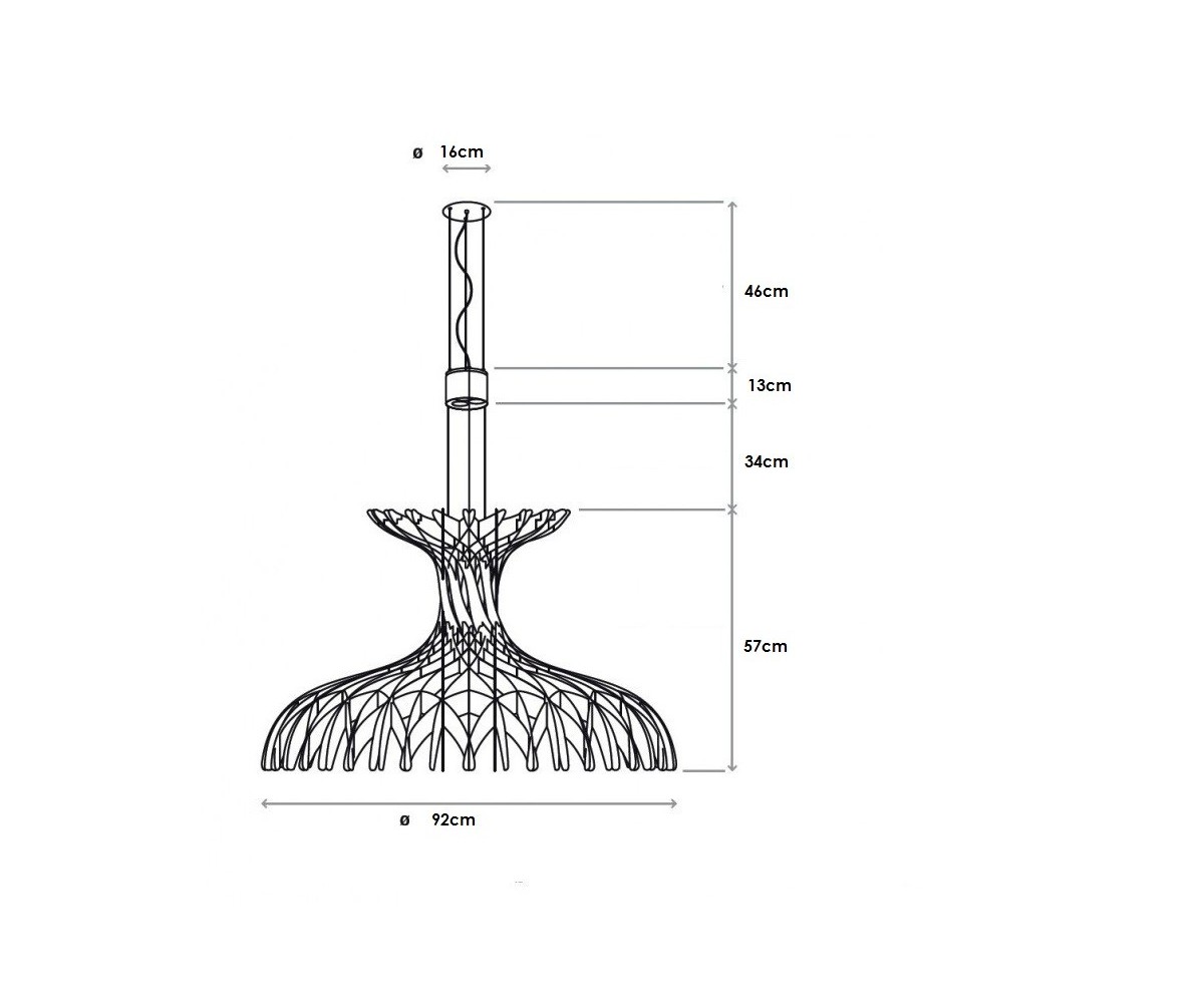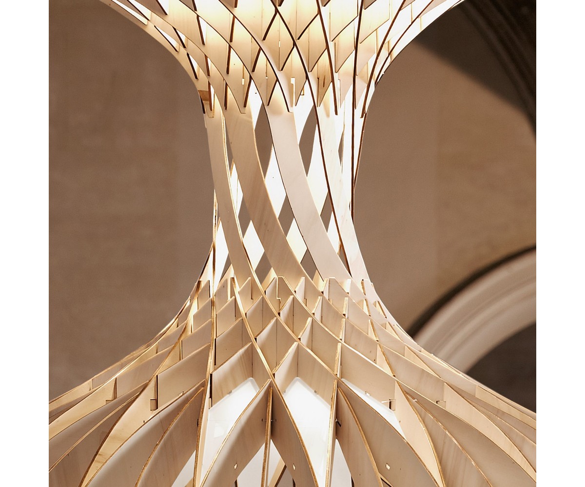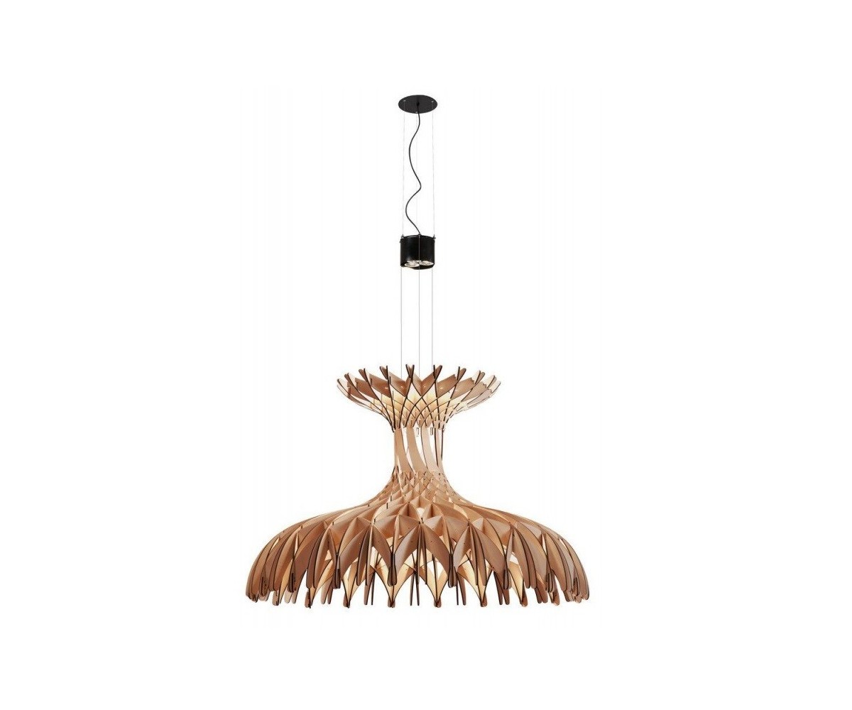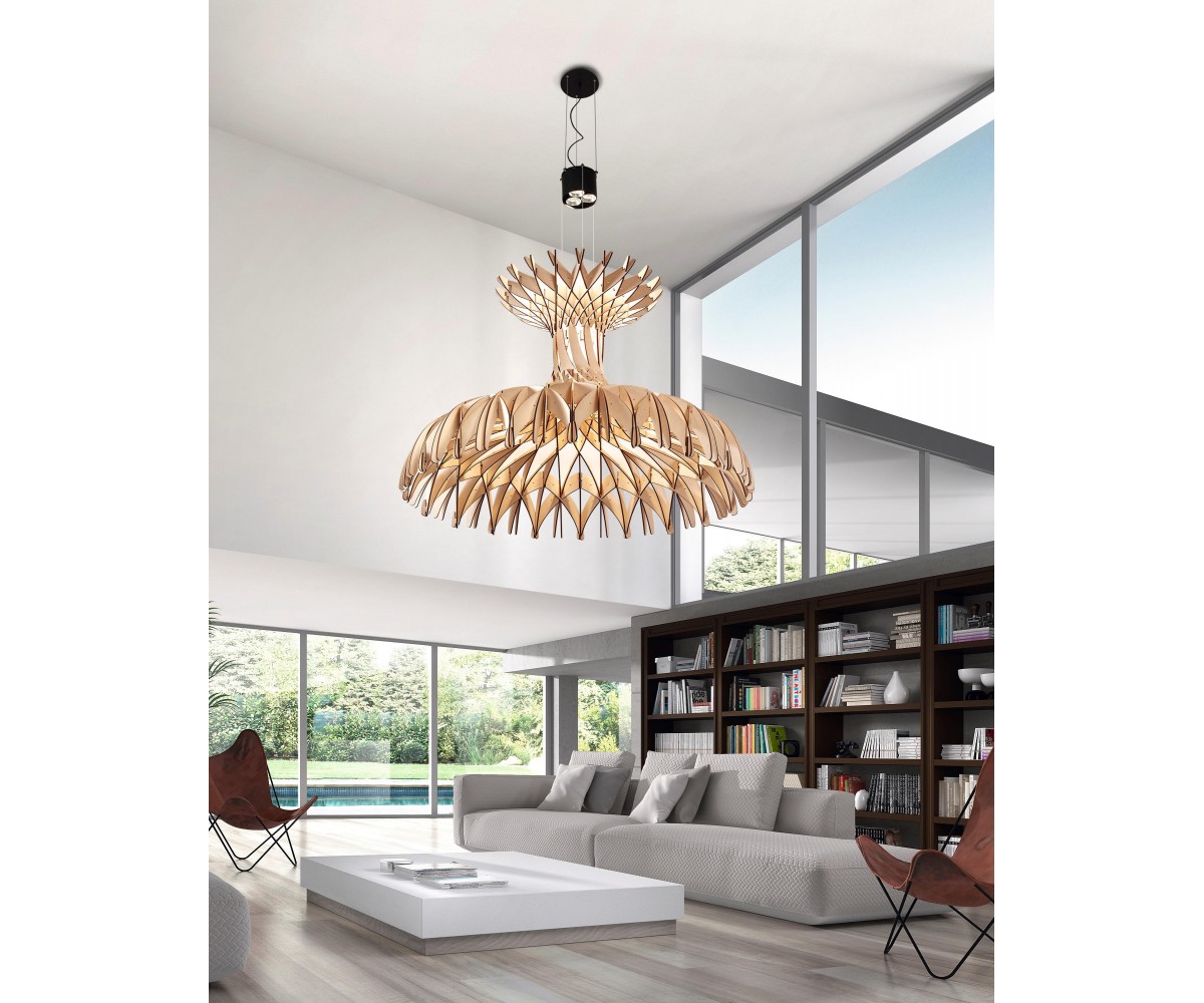 Lámpara de techo circular de gran formato y impacto visual, inspirada en un diseño de Benedetta Tagliabue. Fabricada a base de laminas elaboradas manualmente en madera de roble perfectamente ensambladas formando una escultura al aire, reproduciendo un juego de sombras y luces. También disponible L de diámetro 60cm, consultar. Réplica con materiales originales de máxima calidad.