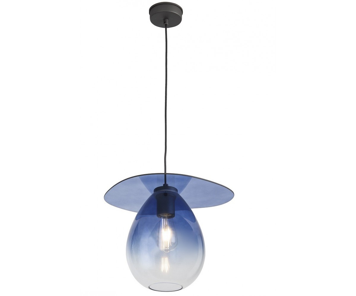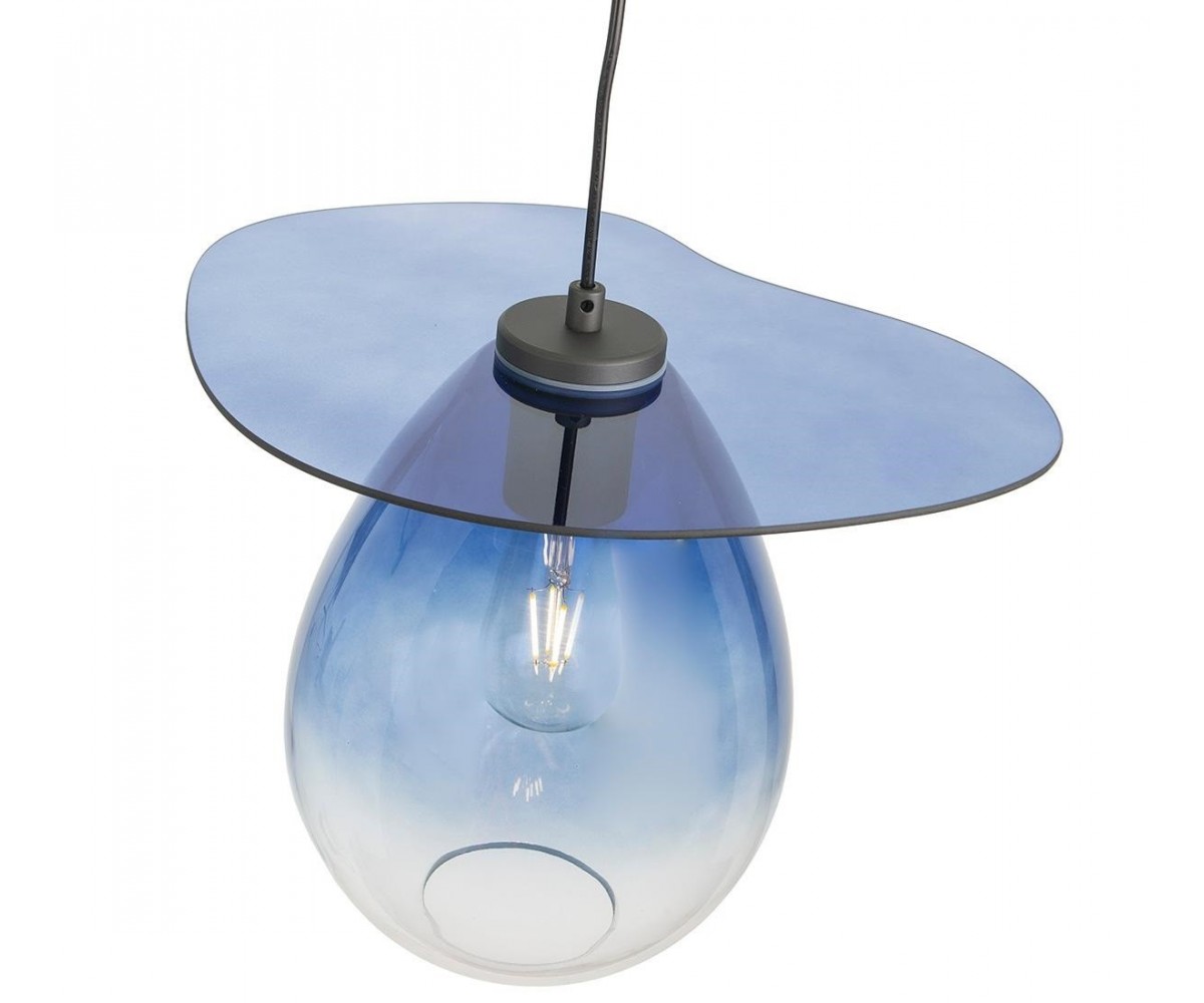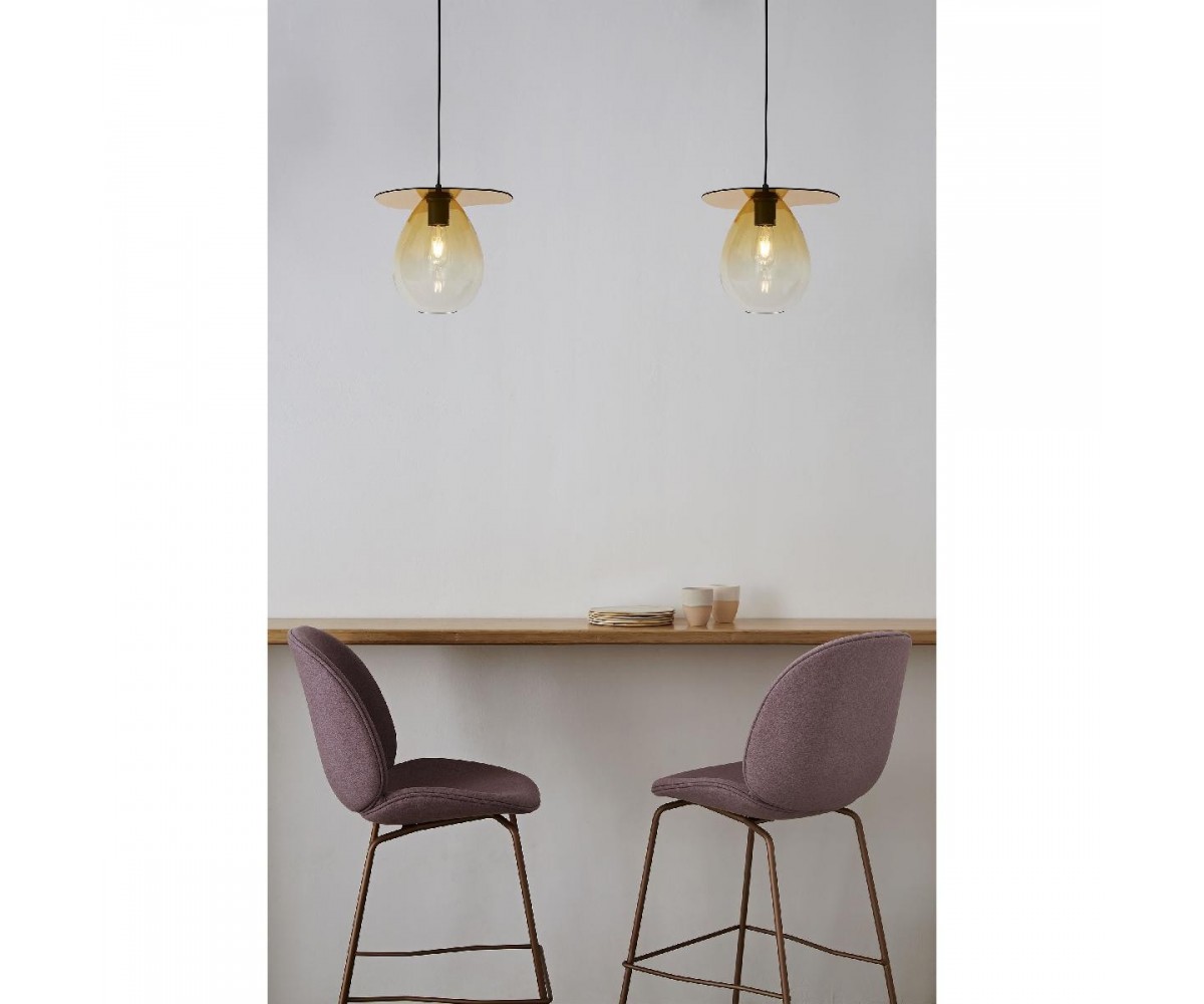 Lámpara suspendida inspirado en un diseño de Wilhelm Wagenfeld. Tulipa en cristal soplado color ambar o azul, carcasa en acero lacado al horno en color negro. También disponible en lámpara de suelo. Casquillo para bombilla E27 Led, no incluida. Réplica con materiales originales de máxima calidad