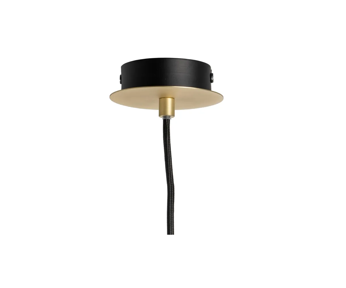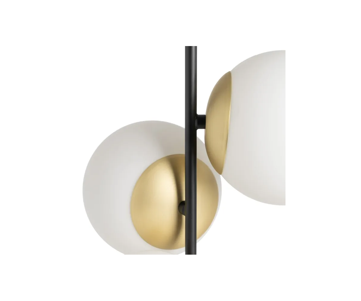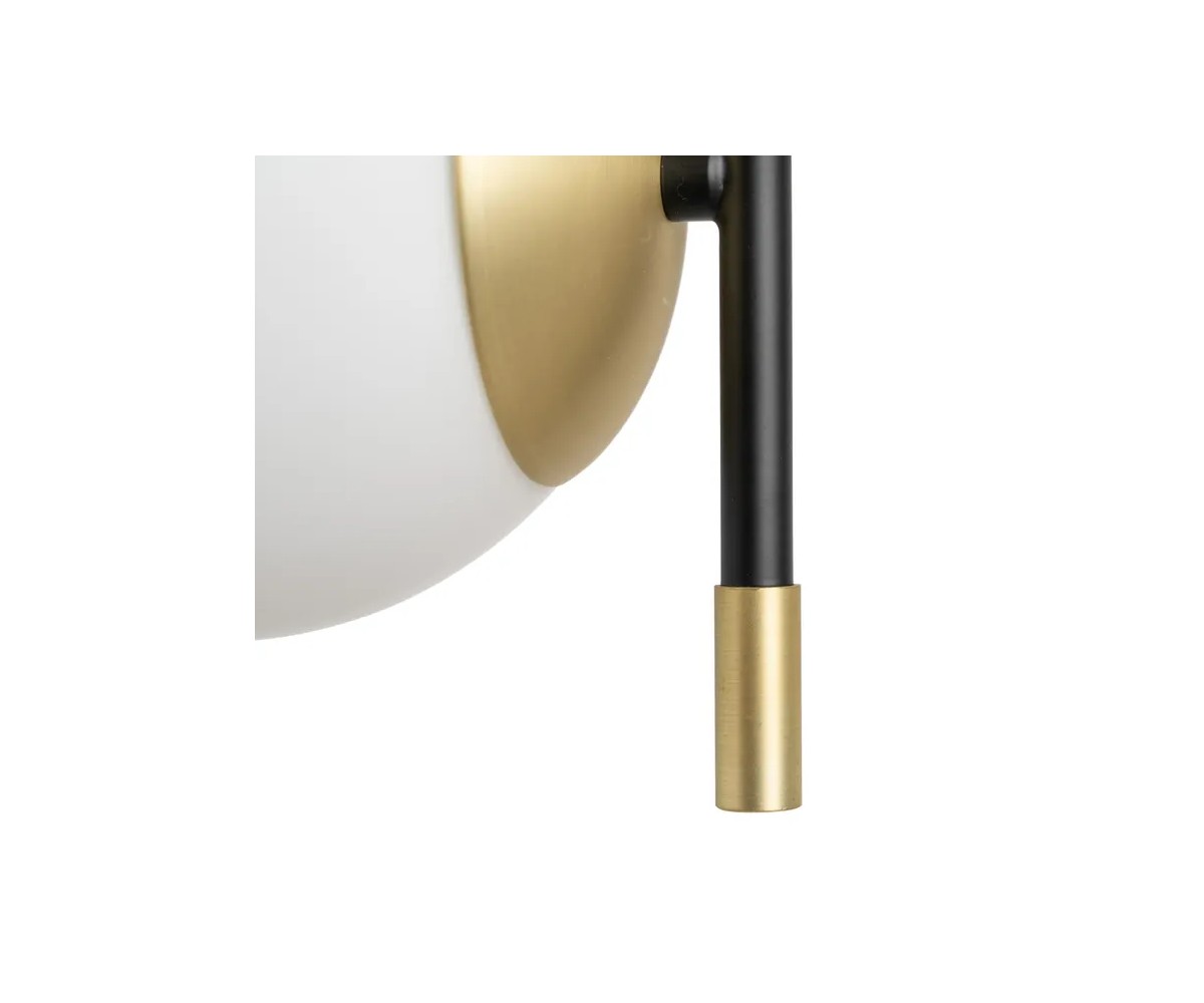 Lámpara de techo inspirada en un diseño de Eichholtz. El «art déco» y el estilo Mid Century moderno se aúnan en la impresionante lámpara Senso. Tres pantallas esféricas de vidrio blanco esparcen una luz suave y cálida por toda la habitación, mientras que el acabado en acero negro y dorado completan el conjunto con un intenso contraste. Serie compuesta por lámpara de techo, aplique y sobremesa. Réplica con materiales originales de máxima calidad.