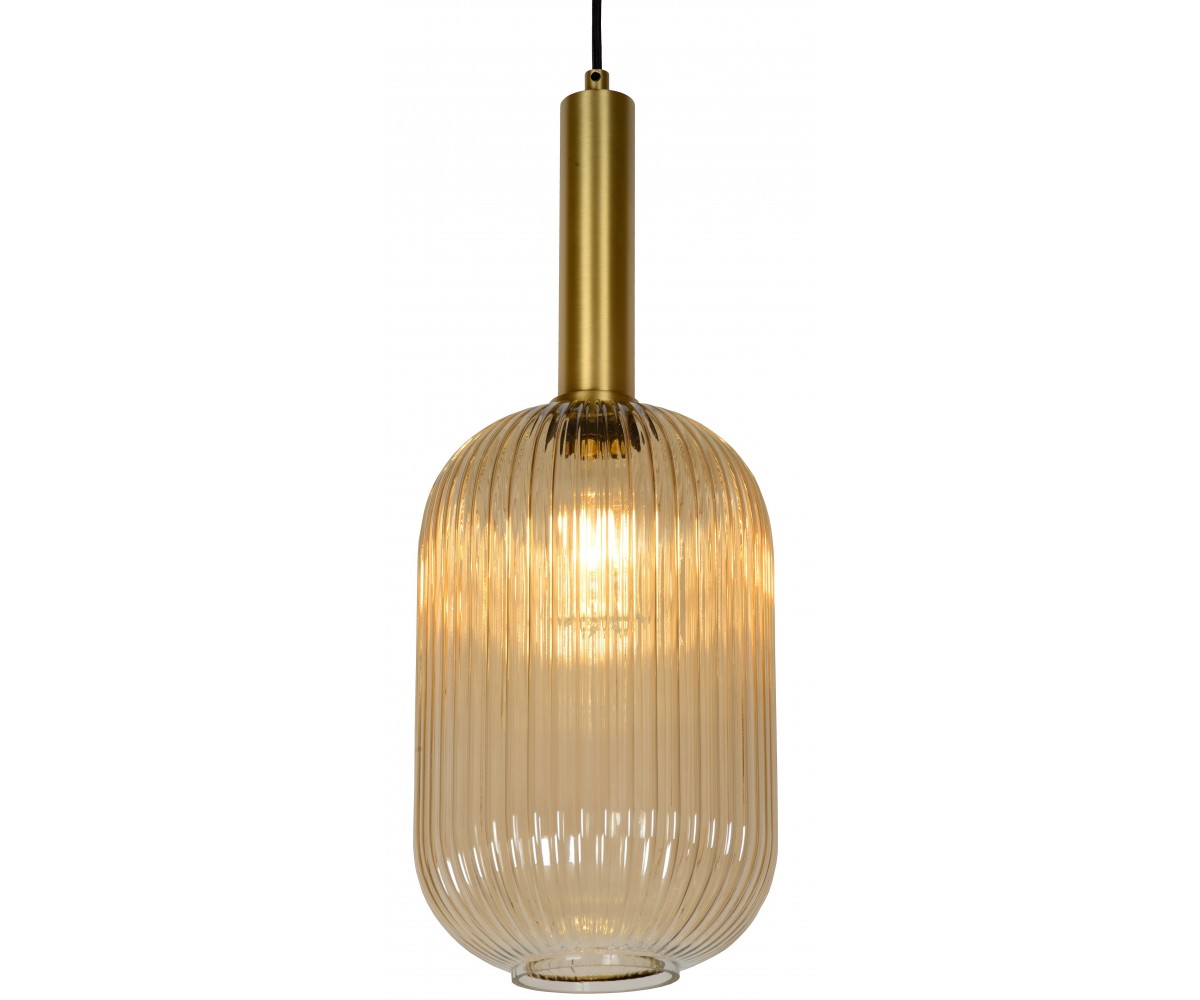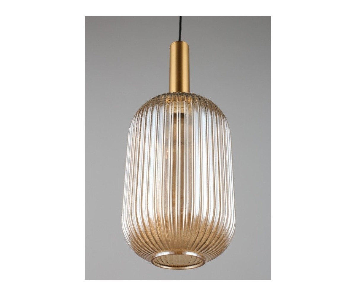 Lámpara de techo estilo vintage, inspirado en un diseño de Valaisin Grönlund. Estructura en acero acabado oro con tulipa es de cristal tono ámbar efecto espejo. Modelo regulable en altura a la hora de su instalación. Rosca para bombille E27 LED, no incluida. Altura máxima del cable 120cm. Réplica con materiales originales de máxima calidad.