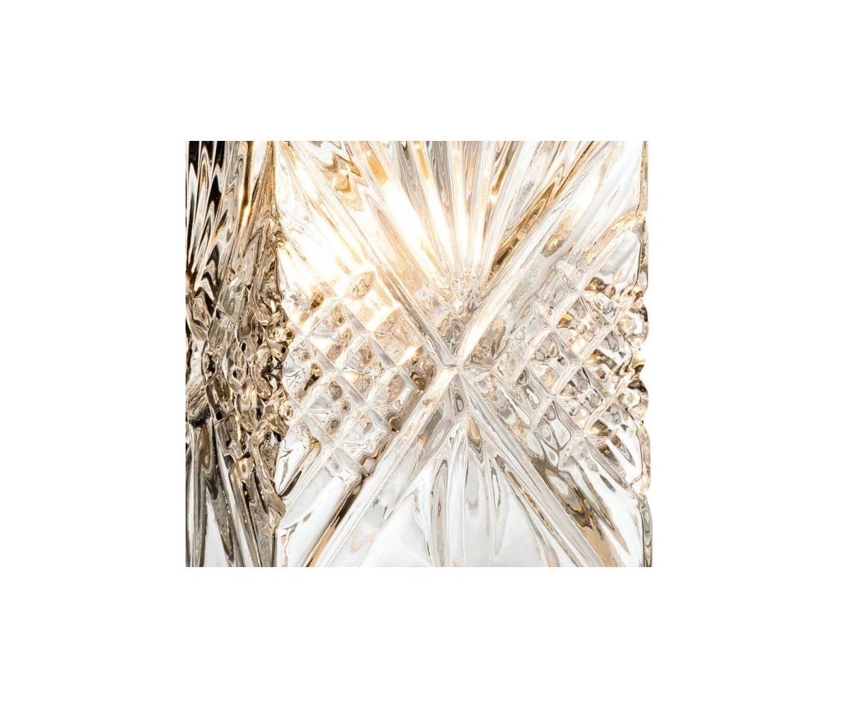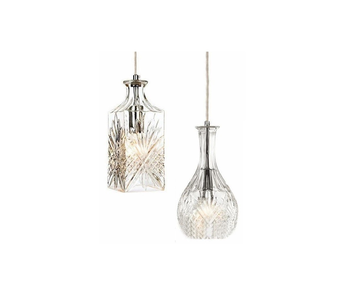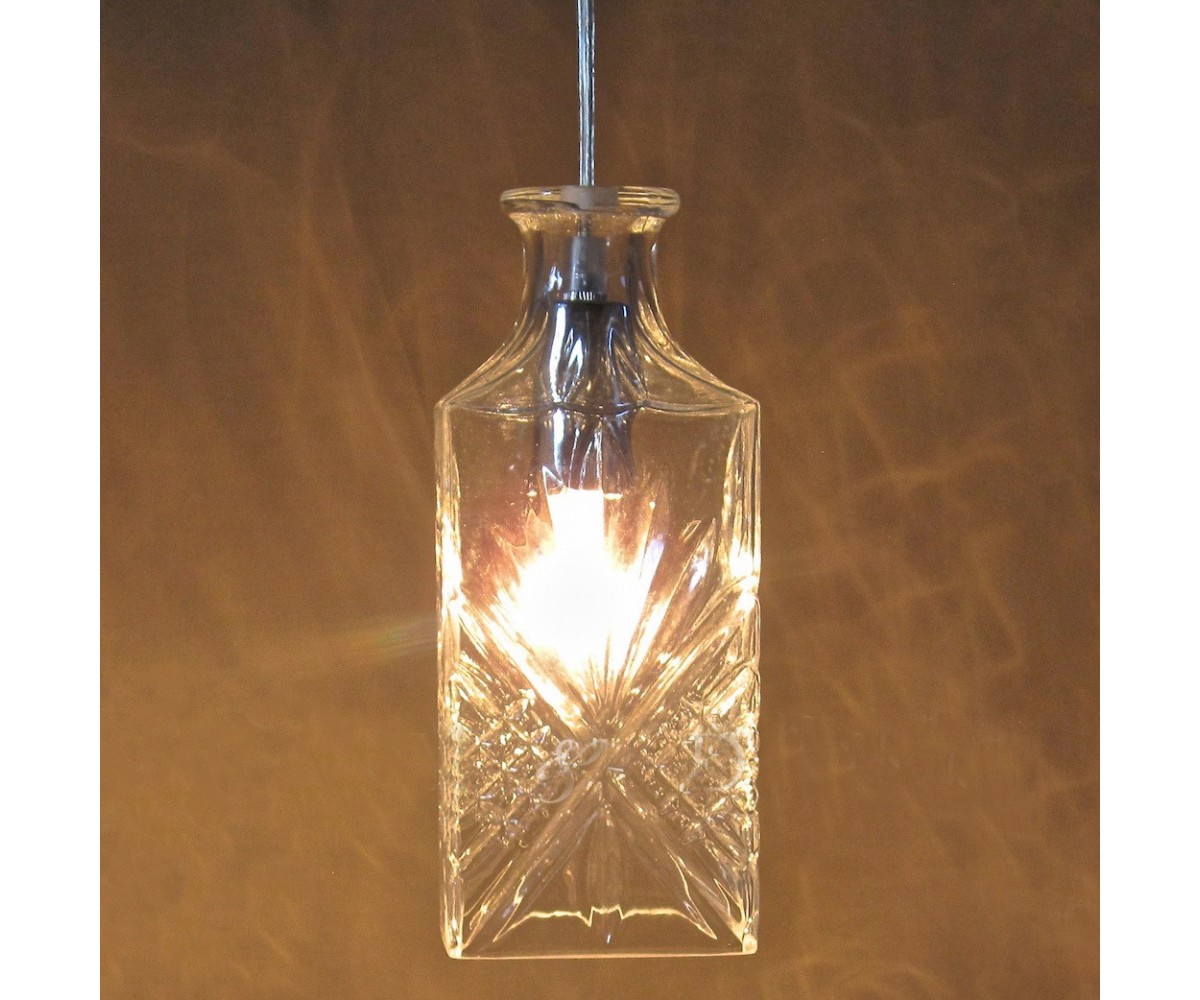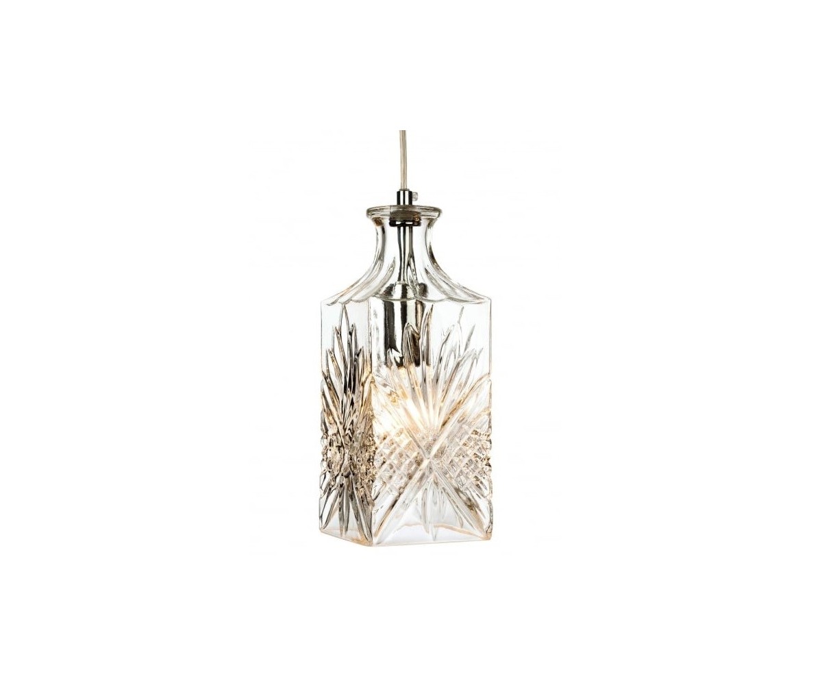 Lámpara de techo Chandelier inspirada en un diseño de Lee Broom. Fabricada en vidrio tallado hecho a mano recordando a la botella Scotch. Nuestra serie está compuesta por dos modelos rematada por herraje en acero cromado inoxidable con cable de alambre recubierto por cable transparente, puede ajustar cuando se instala para adaptarse a sus requisitos de techo, entre 40cm a 120cm. Rosca para bombilla E14 LED no incluida. Réplica con materiales originales de máxima calidad.