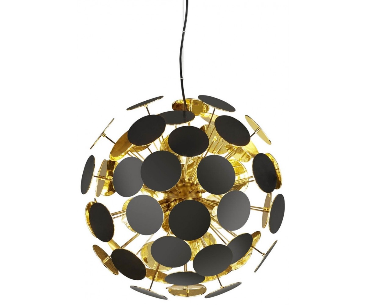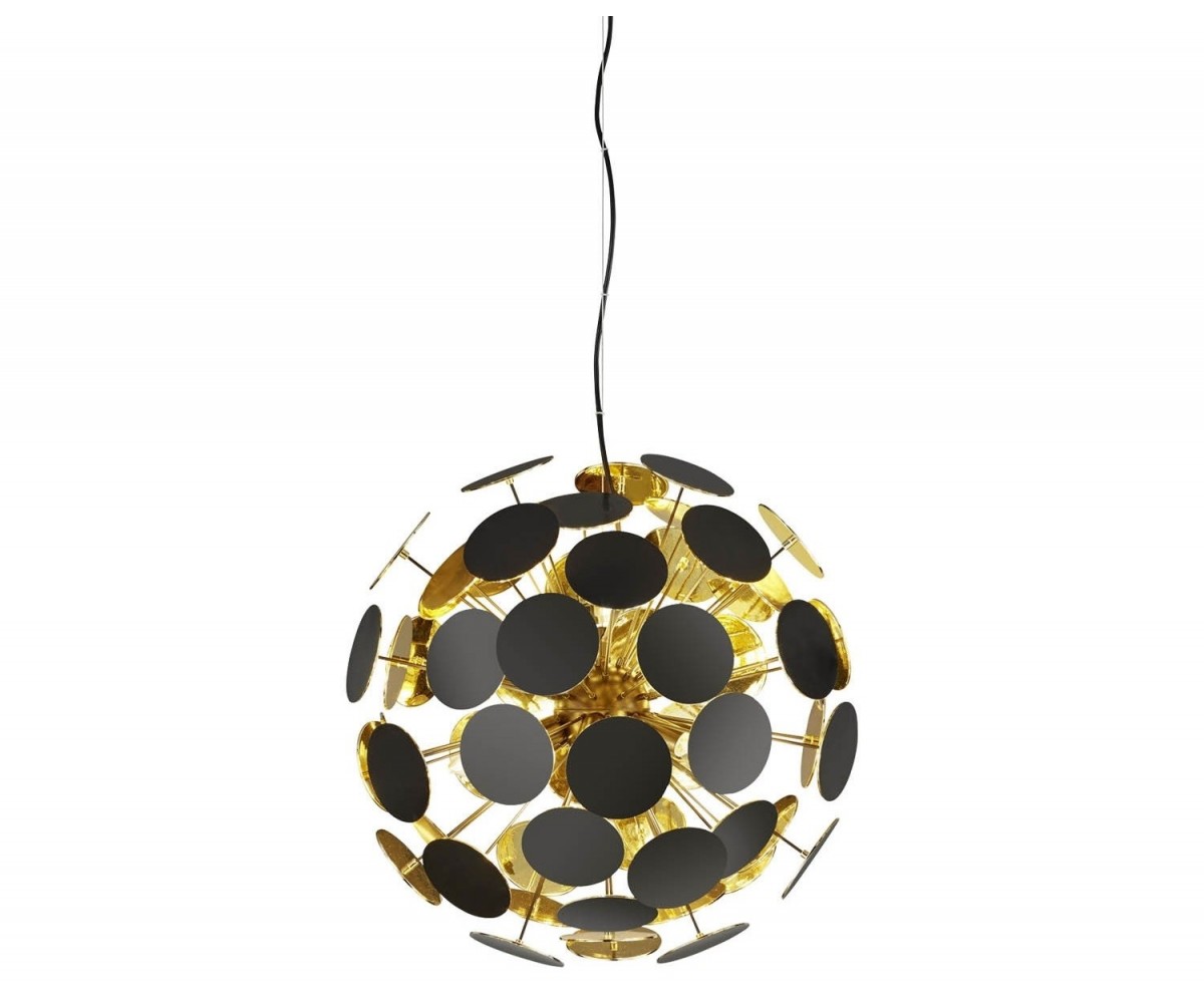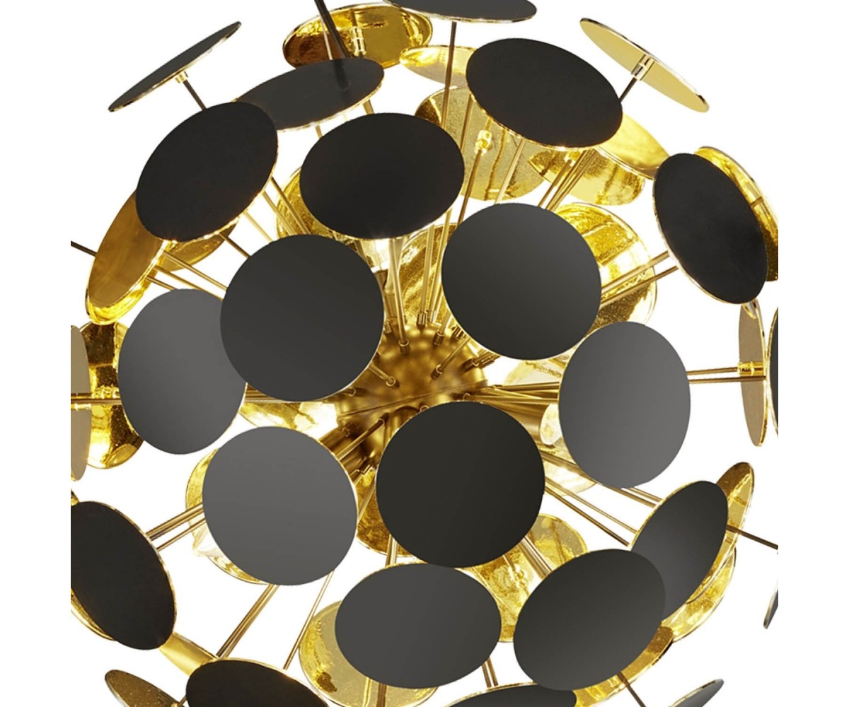 Lámpara de techo colgante inspirada en un diseño de Rydéns. Fabricada por círculos de acero exterior lacado en color negro, interior oro o exterior blanco con interior plata, formando la imagen de un sistema solar. Las placas circulares van unidas con varillas de metal cortas y largas para completar la lámpara entera. Voltaje Alta tensión 220V/230V. Casquillo para bombilla E14, necesita 6 unidades, no incluidas. Réplica con materiales originales de máxima calidad.
