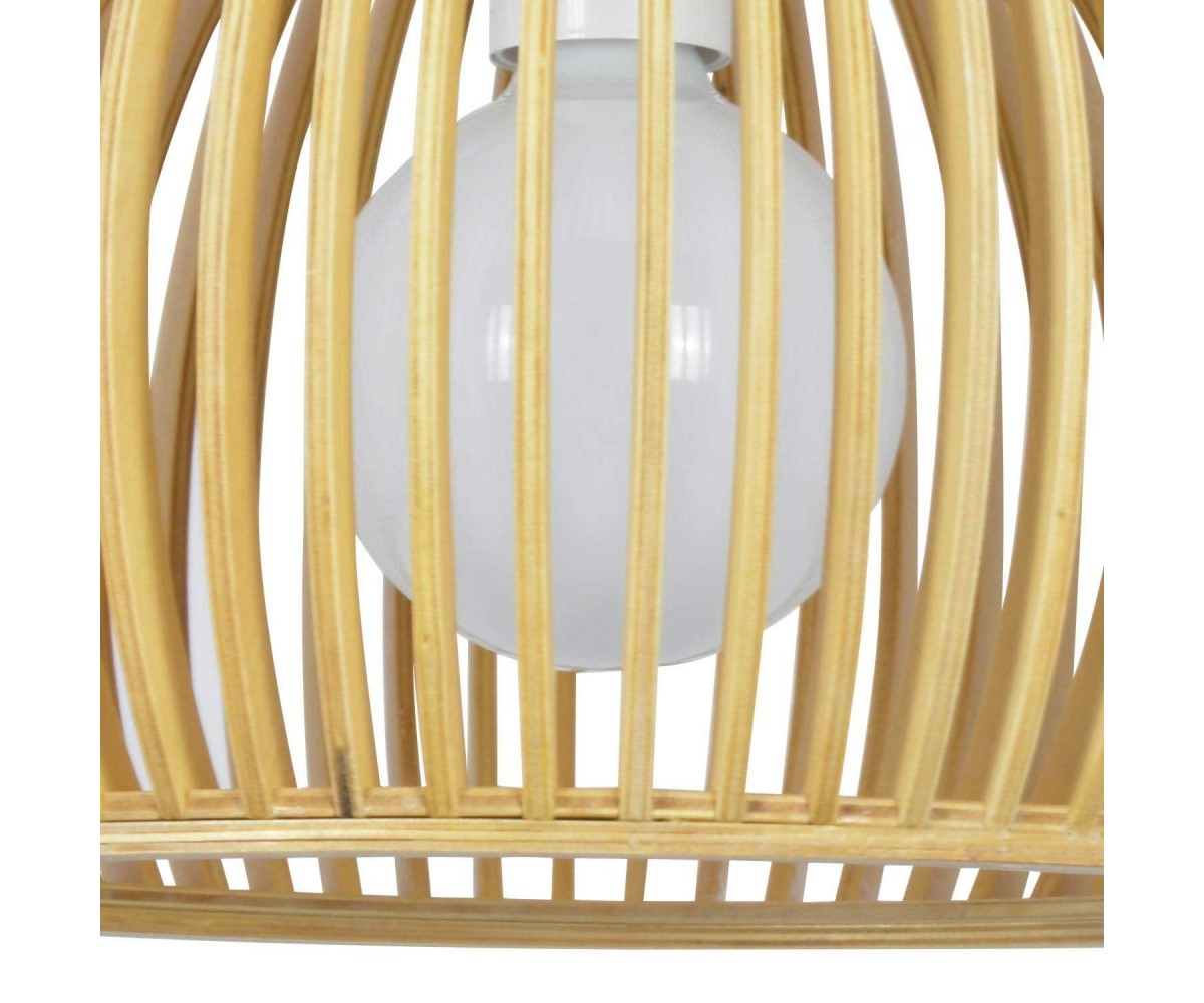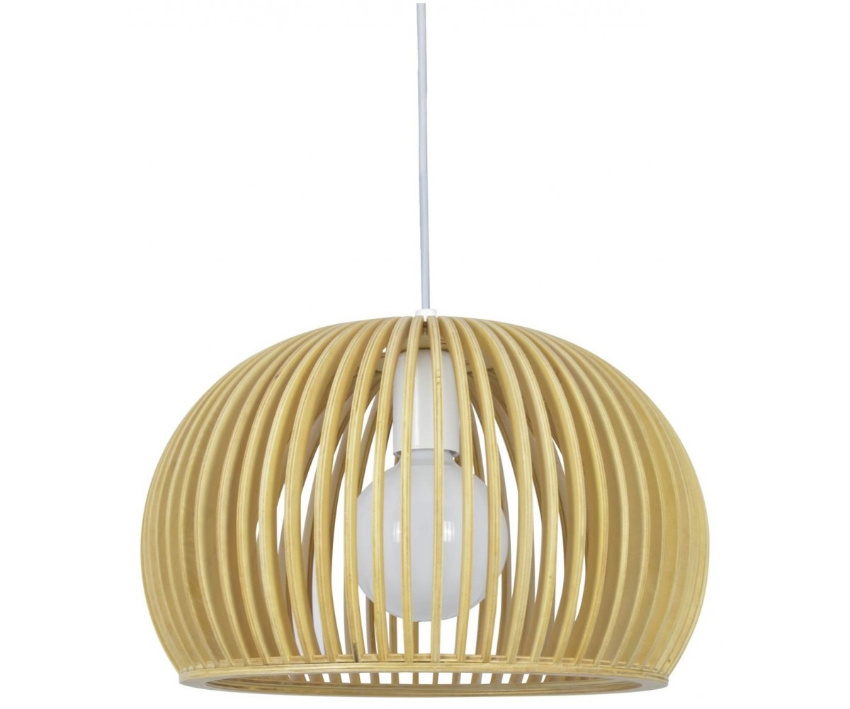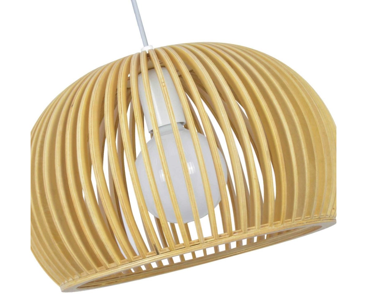 Lámpara suspendida creada en Finlandia, inspirada en un diseño de Seppo Koho. Fabricada artesanalmente en madera de abedul prensado, terminación natural. Produce una luz que se filtra entre las barras sin deslumbrar. Voltaje Alta tensión 220V/230V. Casquillo para rosca E27, 40W máximo, no incluido. Esta lámpara forma parte de una serie de tres formatos. Réplica con materiales originales de máxima calidad.
