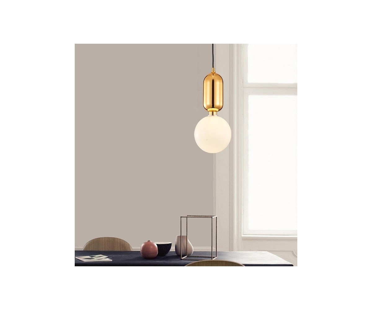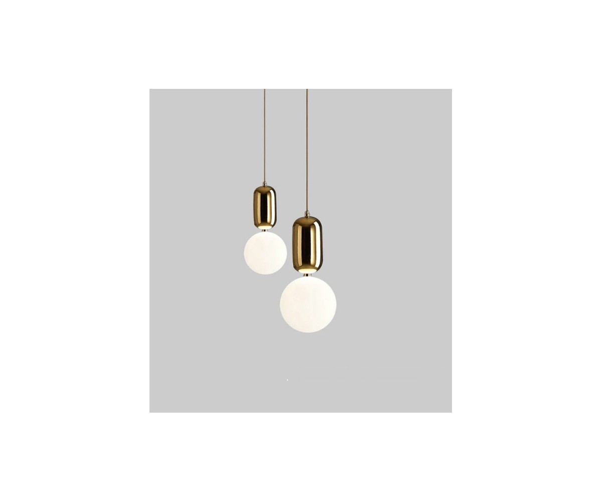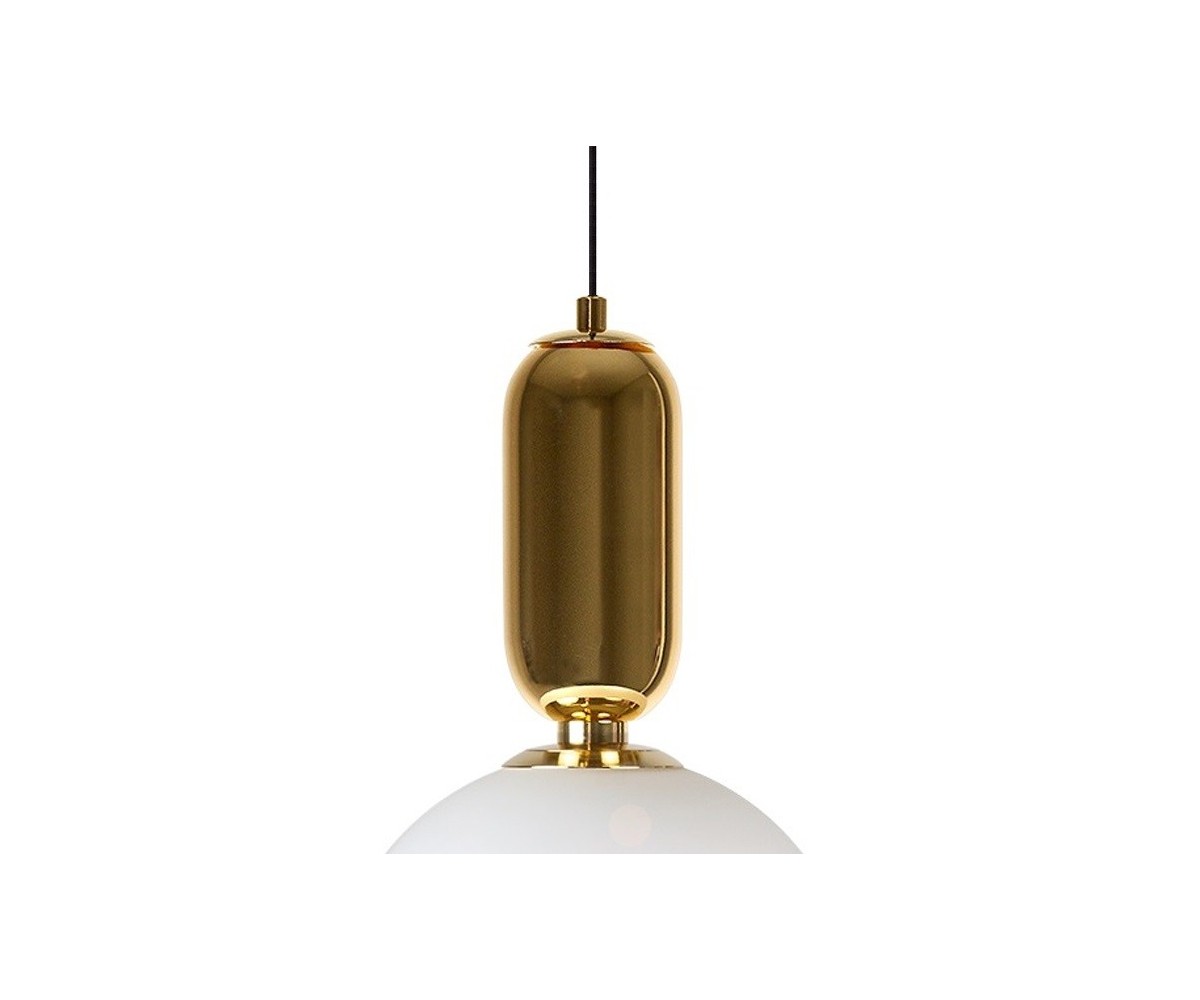 Lámpara de techo inspirada en un diseño de Jaime Hayón. Cuerpo fabricado en acero con terminación dorado brillo, cable color negro. Difusor circular en vidrio soplado opal blanco. Casquillo para bombilla E27 no incluida. Largo máximo 150 cm. La familia de lámparas Aballs están compuestas por sobremesa, aplique y suspensión. Es una pieza de un gran impacto visual, se puede utilizar tanto para lugares domésticos, como contract. Réplica con materiales originales de máxima calidad.