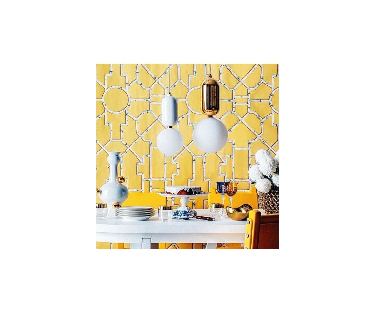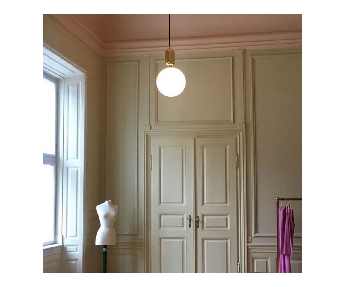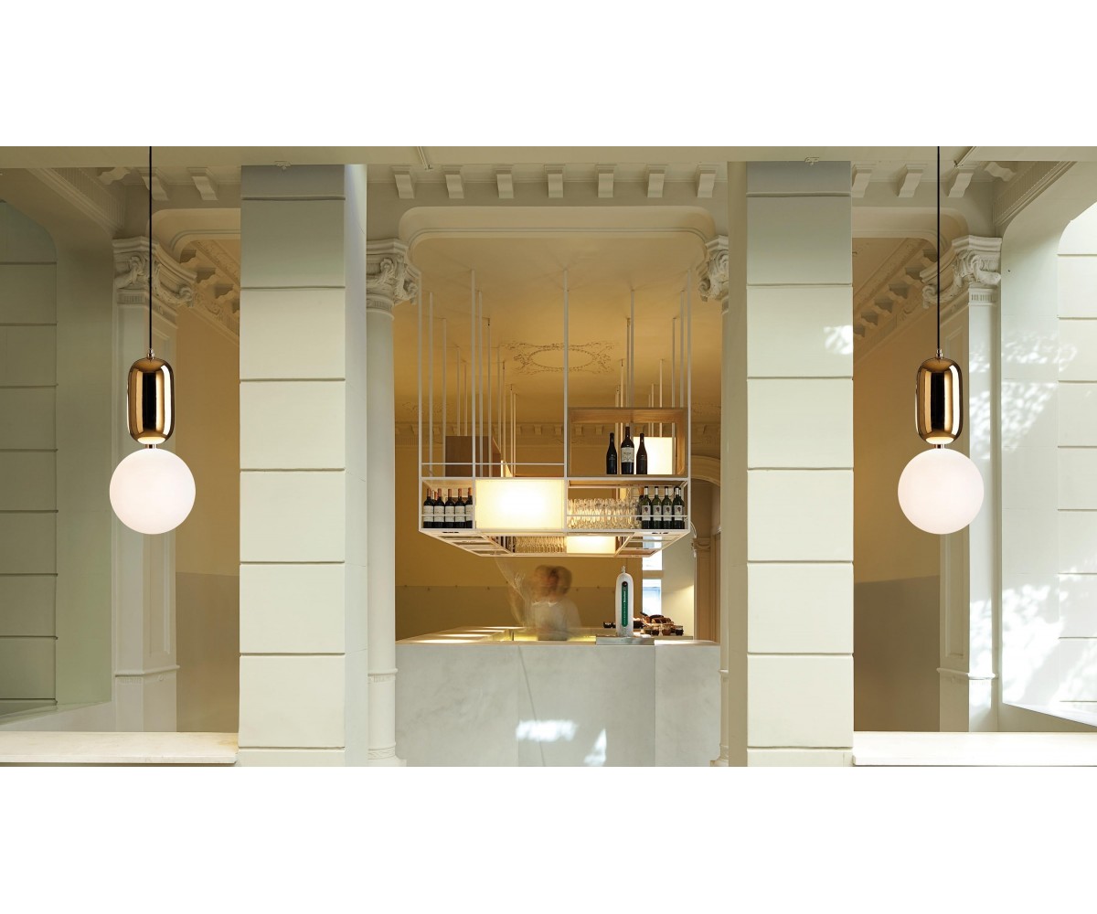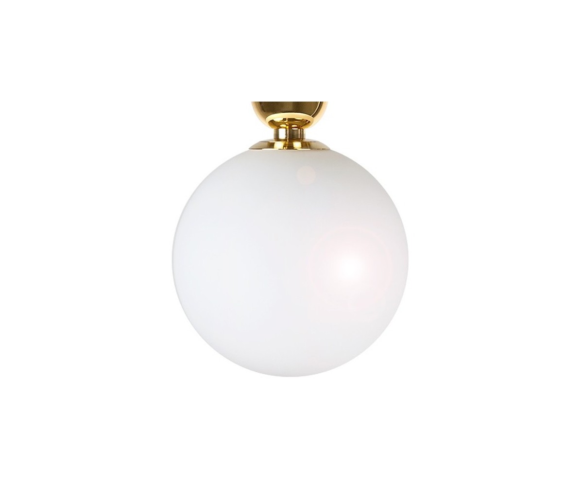 Lámpara de techo inspirada en un diseño de Jaime Hayón. Cuerpo fabricado en acero con terminación dorado brillo, cable color negro. Difusor circular en vidrio soplado opal blanco. Casquillo para bombilla E27 no incluida. Largo máximo 150 cm. La familia de lámparas Aballs están compuestas por sobremesa, aplique y suspensión. Es una pieza de un gran impacto visual, se puede utilizar tanto para lugares domésticos, como contract. Réplica con materiales originales de máxima calidad.