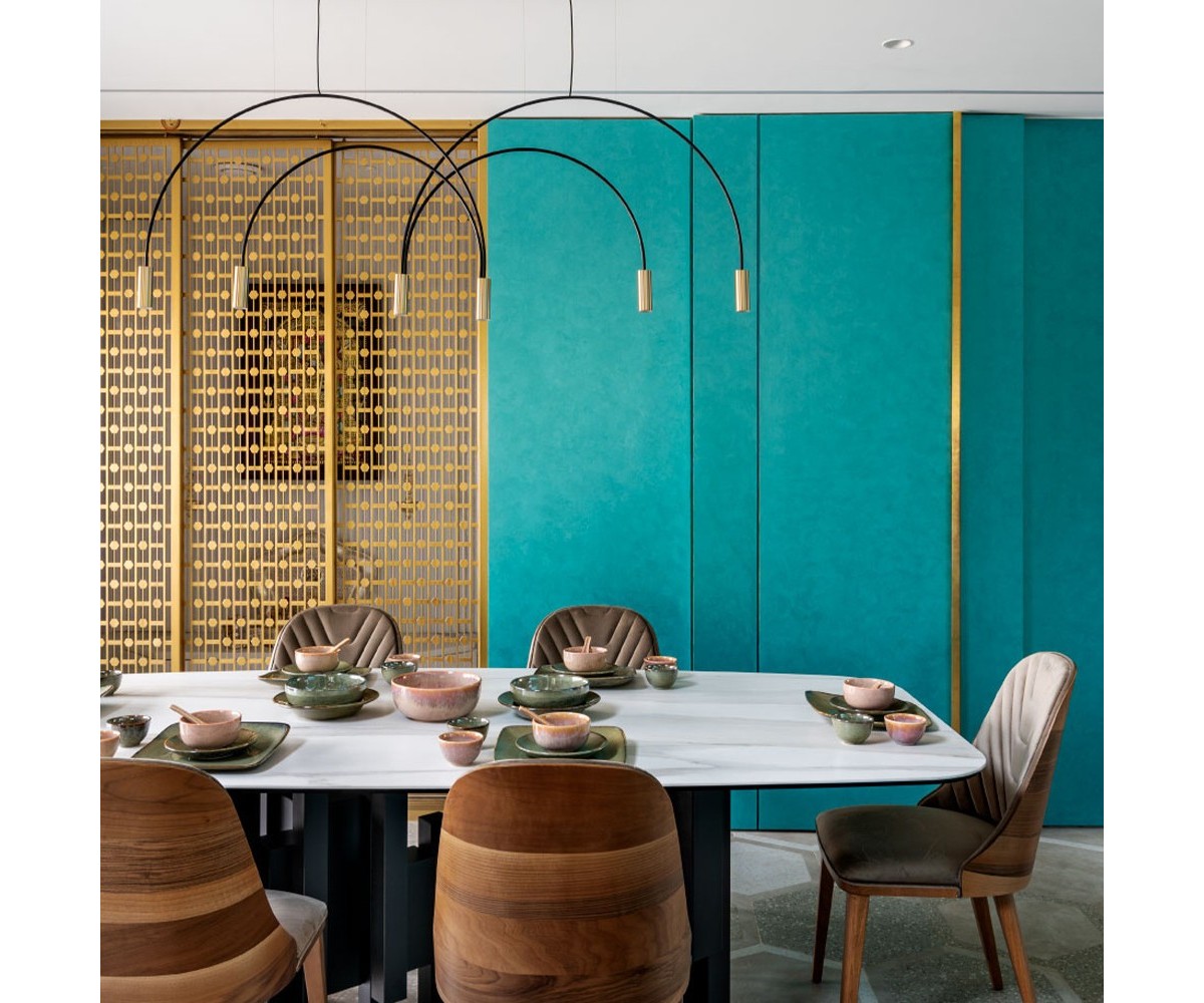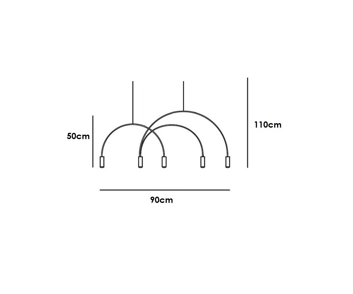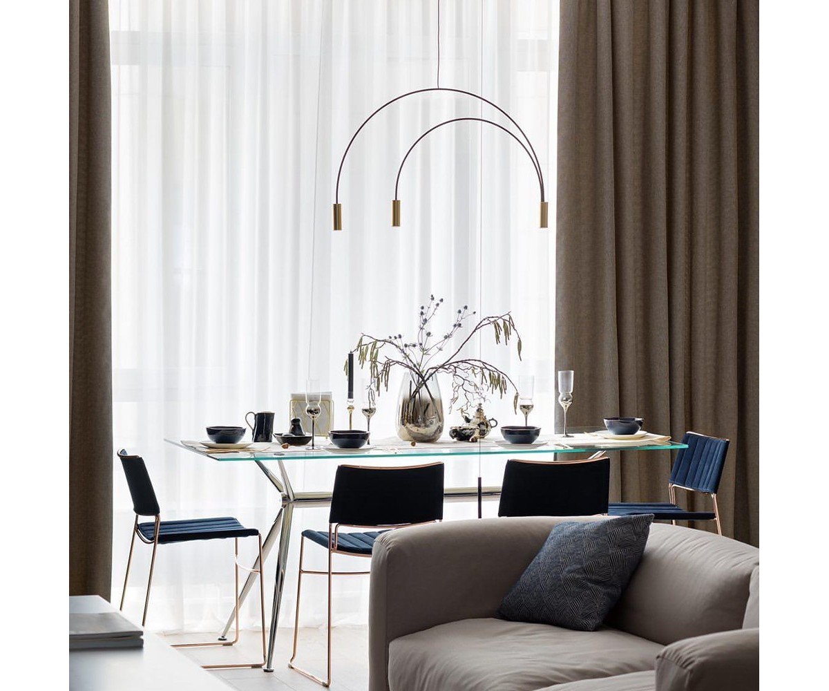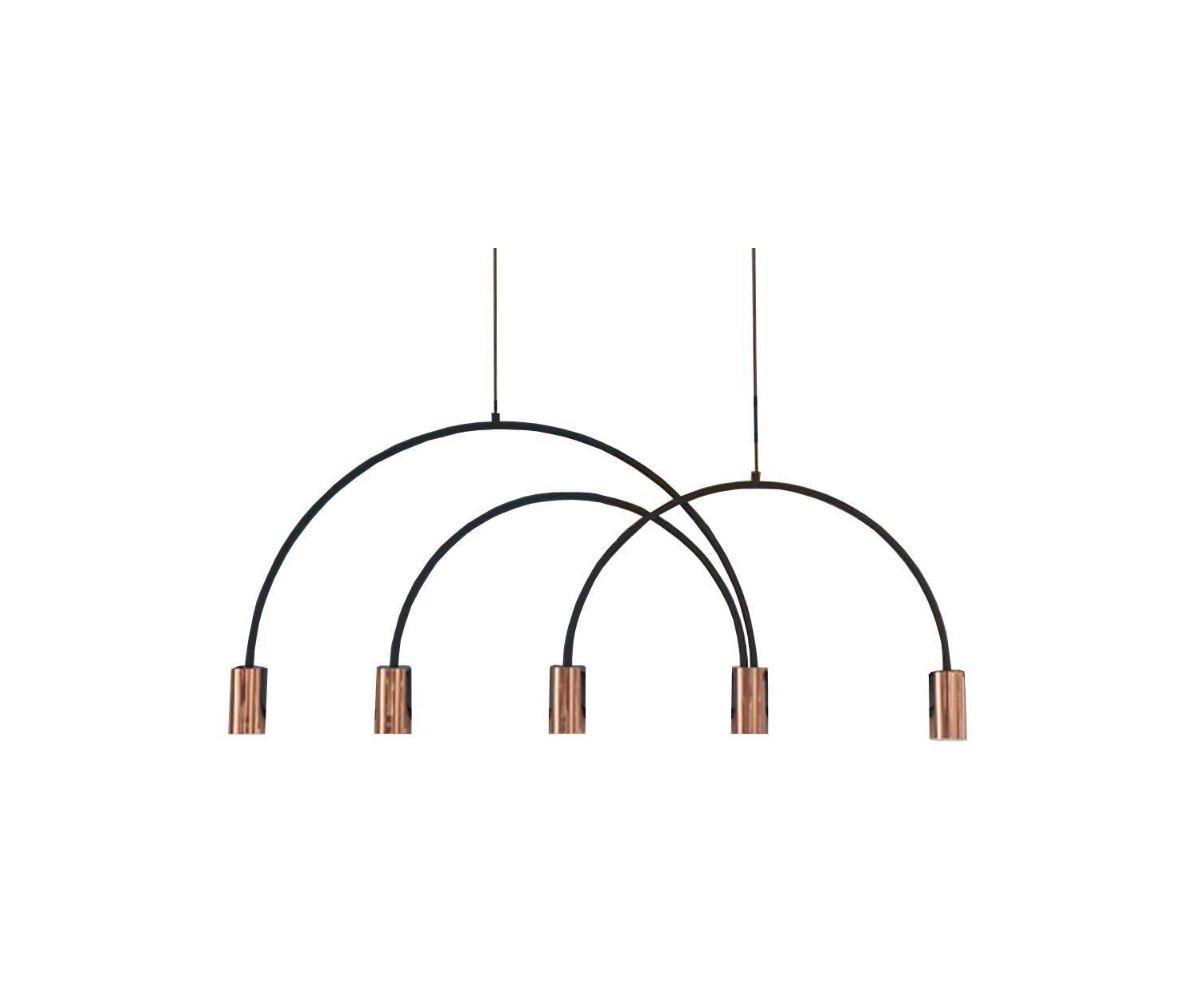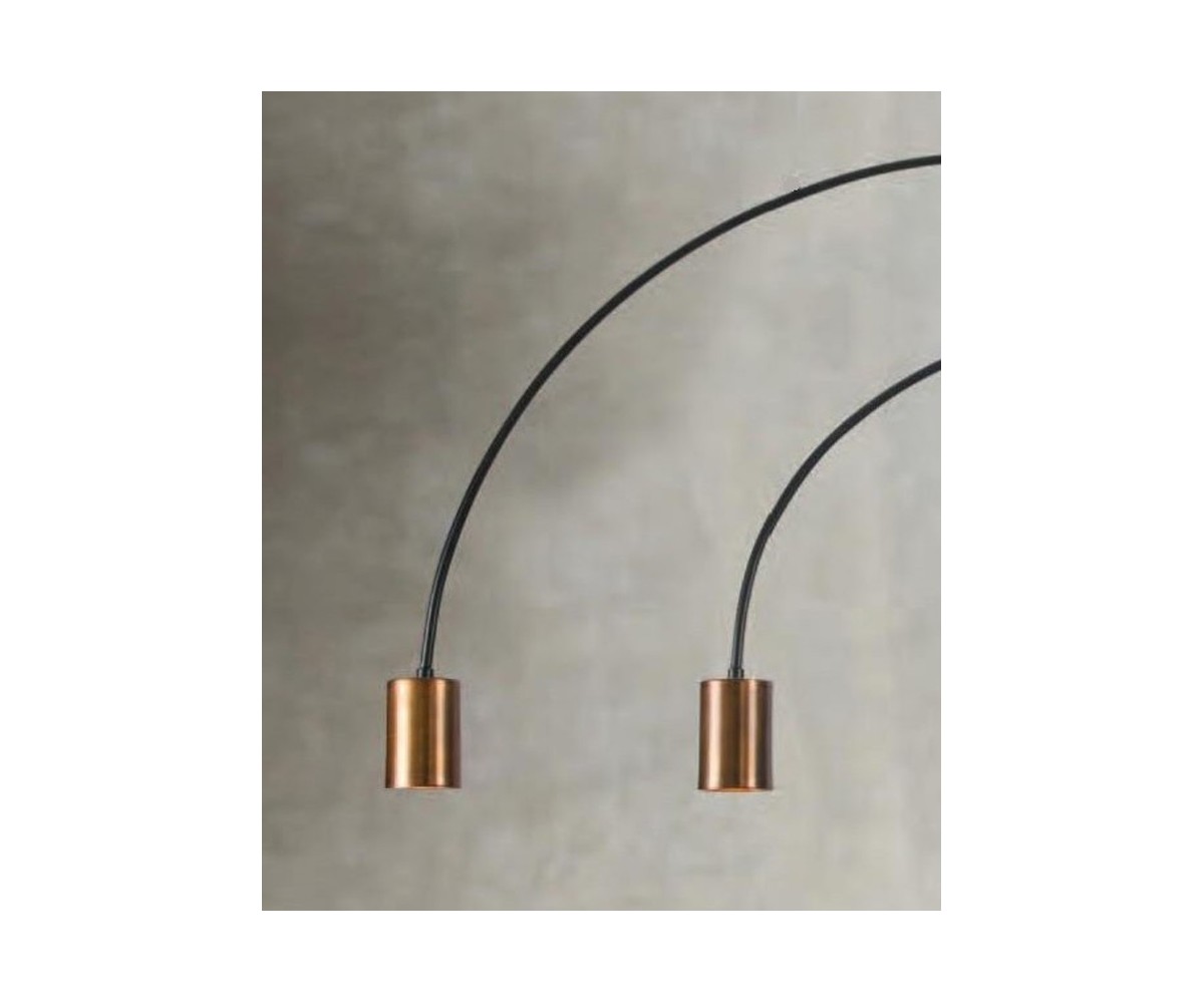 Lámpara de techo inspirada en un diseño de Nahtrang Studio. Realizada mediante tres arcos de acero lacado al horno color negro, terminando en cobre rosado brillo. Cada uno de sus brazos emite luz hacia abajo de tonalidad 3000k (luz cálida) y tiene integrado un led de 5w consumo. Los focos tienen un diámetro de 4.50 cm. Led integrada, protección IP20. Réplica exacta con materiales originales de máxima calidad.