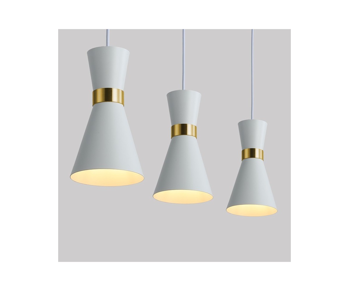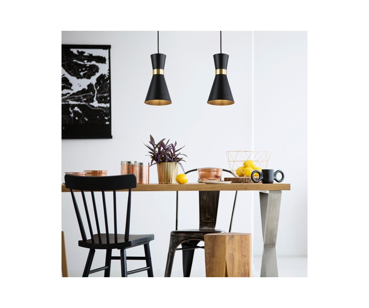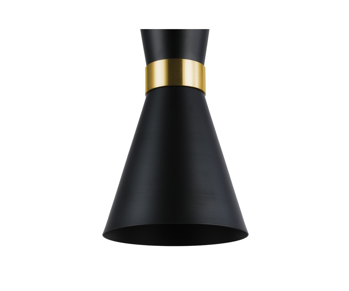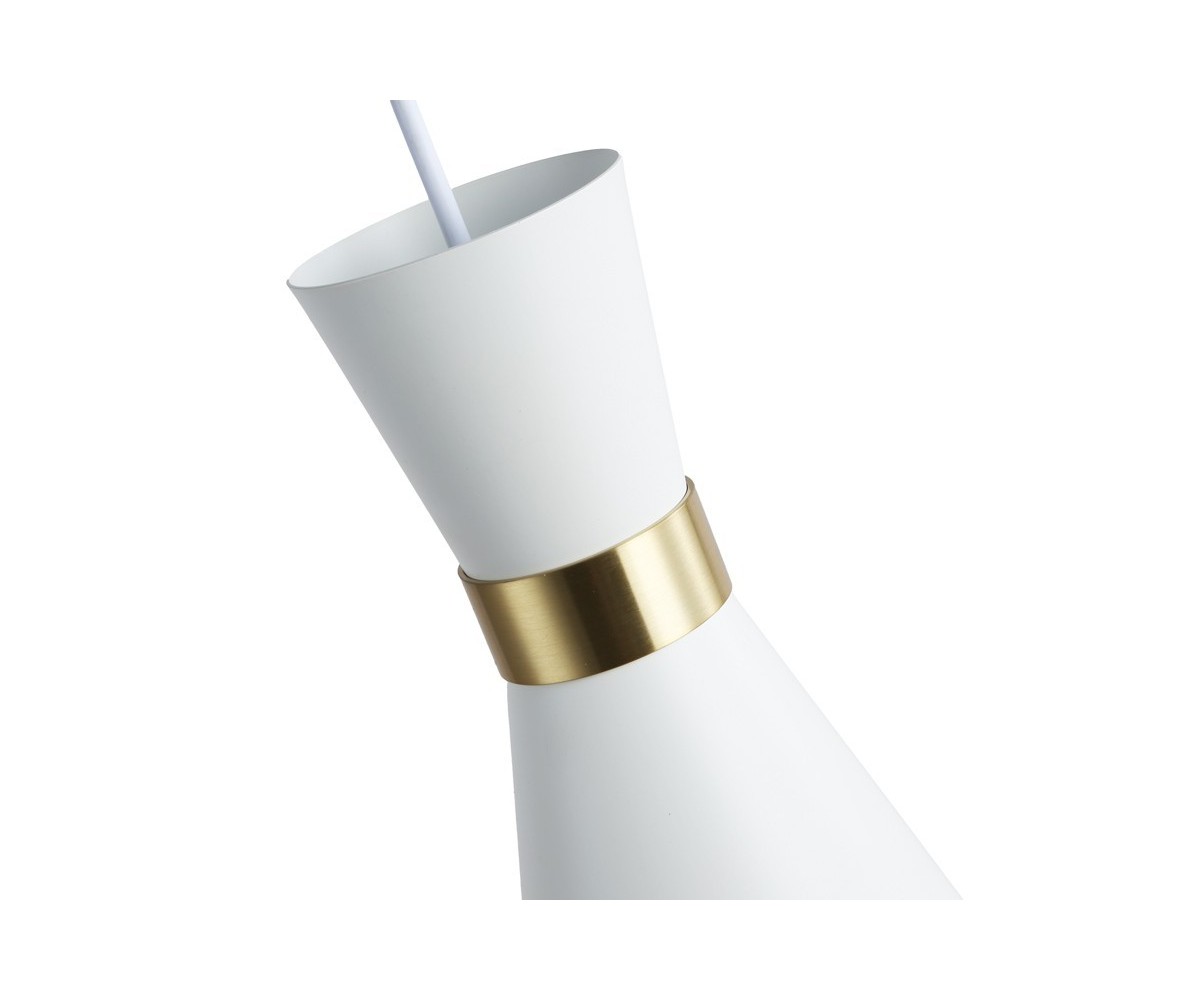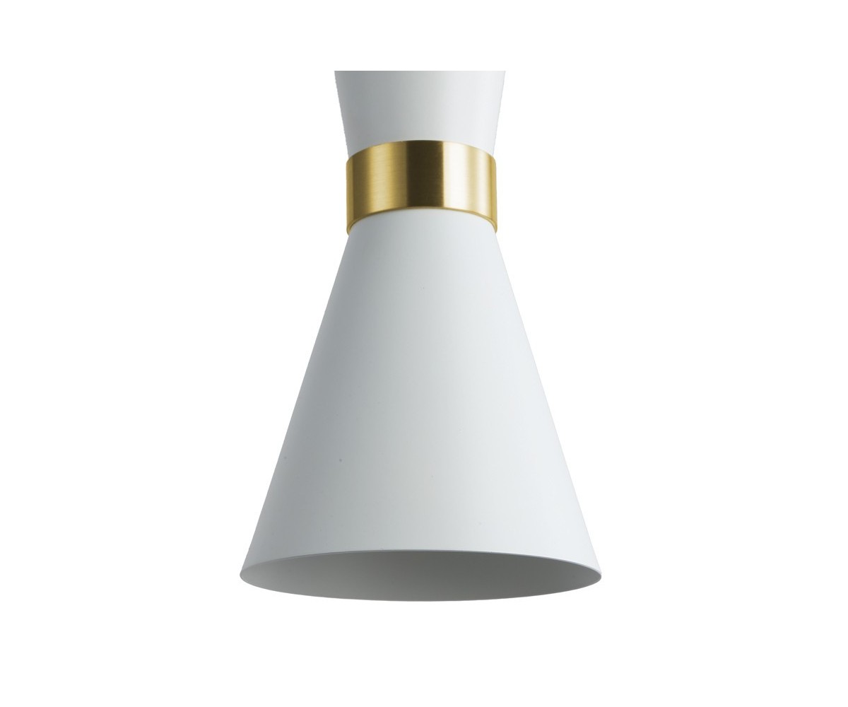 Lámpara de techo inspirada en un diseño de Mike Treanor. Doble pantalla en forma de cono en acero lacado color negro o blanco, agarre central en acero dorado. Largo del cable 100 cm, a la hora de su colocación se puede ajustar en altura. Rosca para bombilla E27, máximo 60w. Tensión nominal 220-240V/AC. Réplica con materiales originales de máxima calidad.