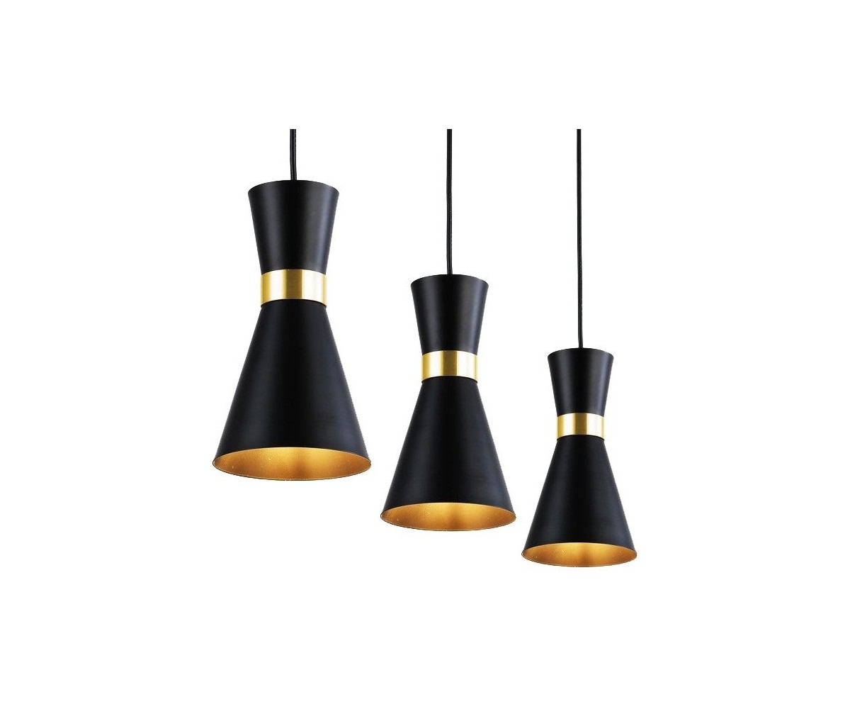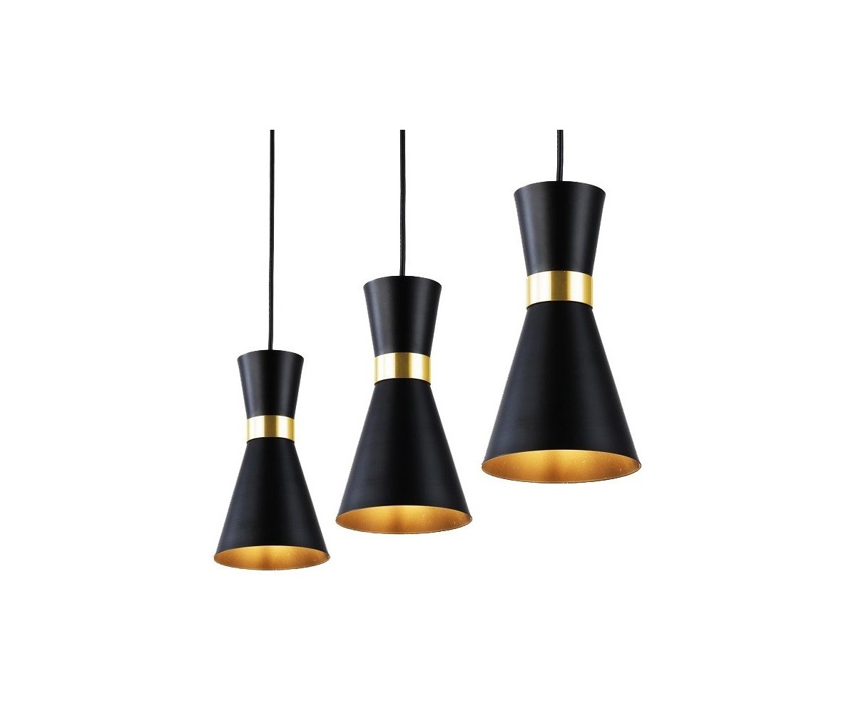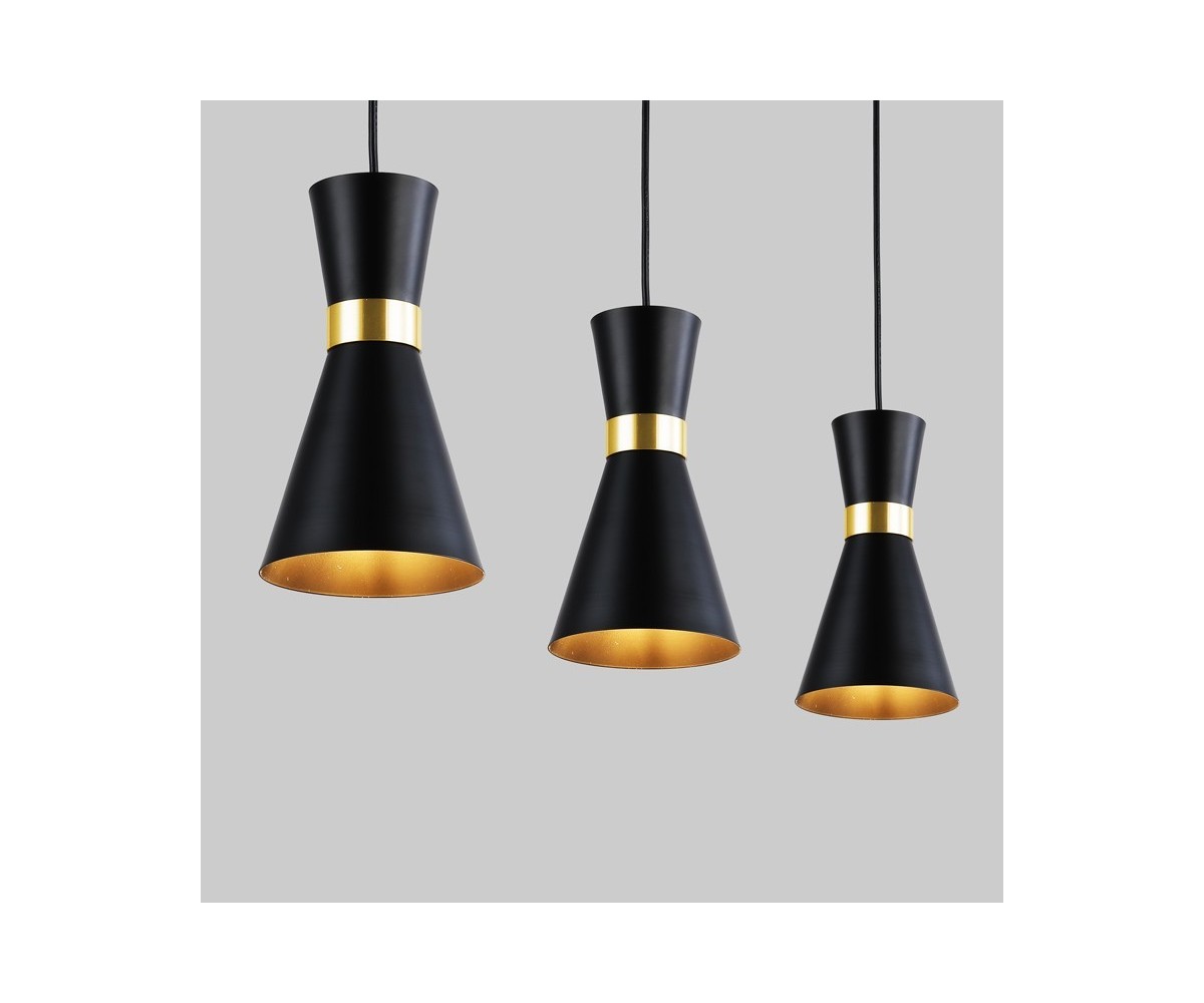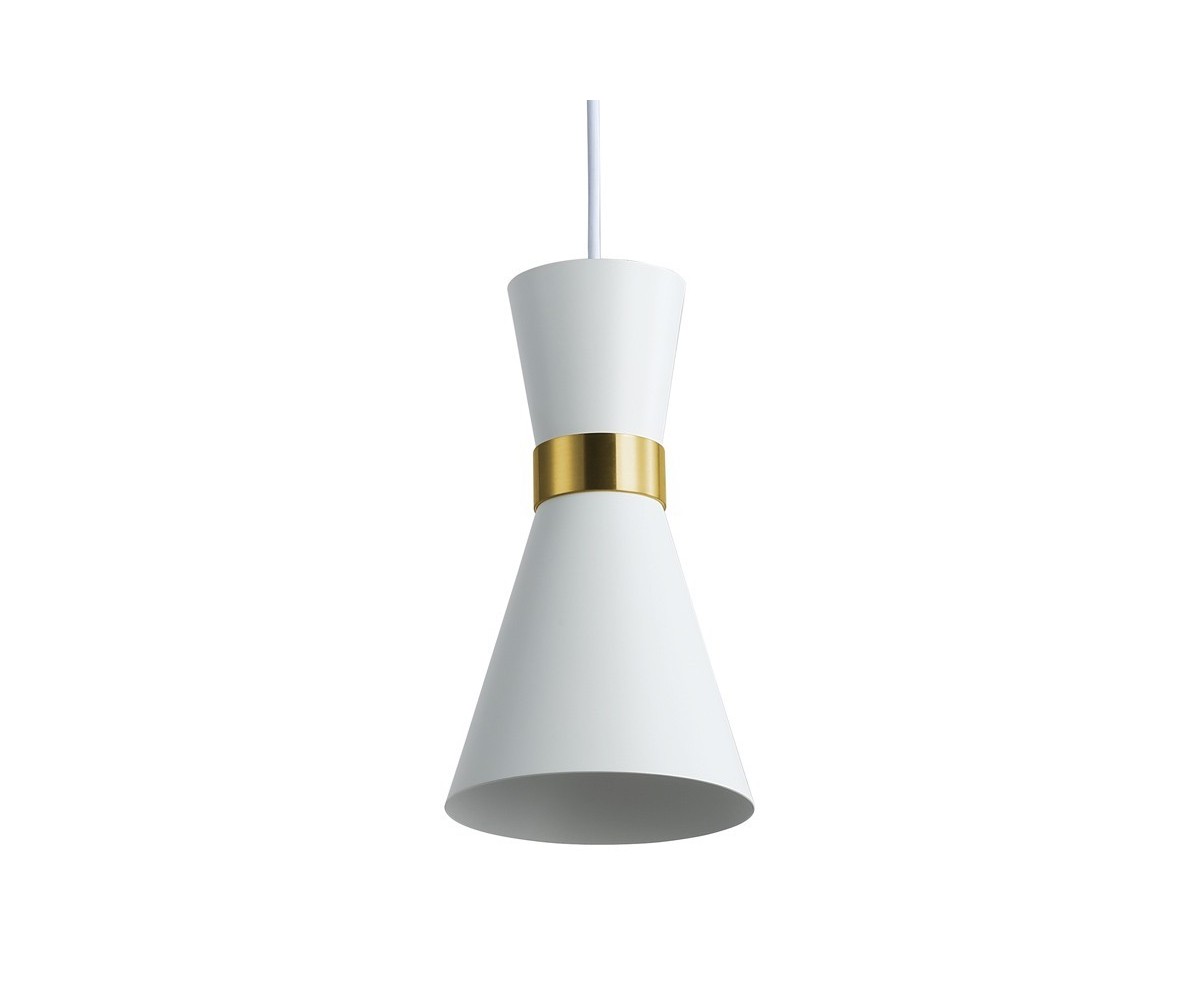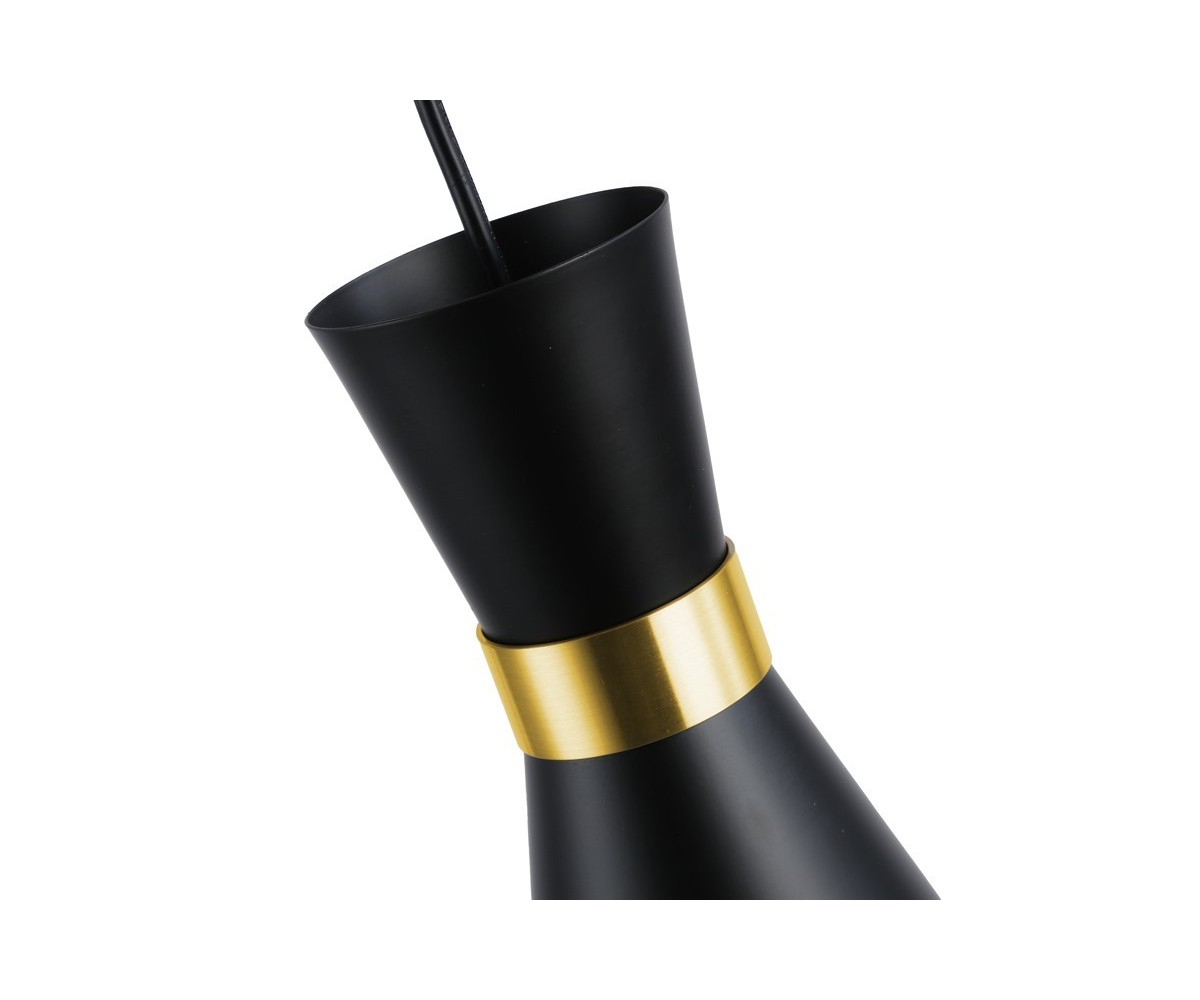 Lámpara de techo inspirada en un diseño de Mike Treanor. Doble pantalla en forma de cono en acero lacado color negro o blanco, agarre central en acero dorado. Largo del cable 100 cm, a la hora de su colocación se puede ajustar en altura. Rosca para bombilla E27, máximo 60w. Tensión nominal 220-240V/AC. Réplica con materiales originales de máxima calidad.