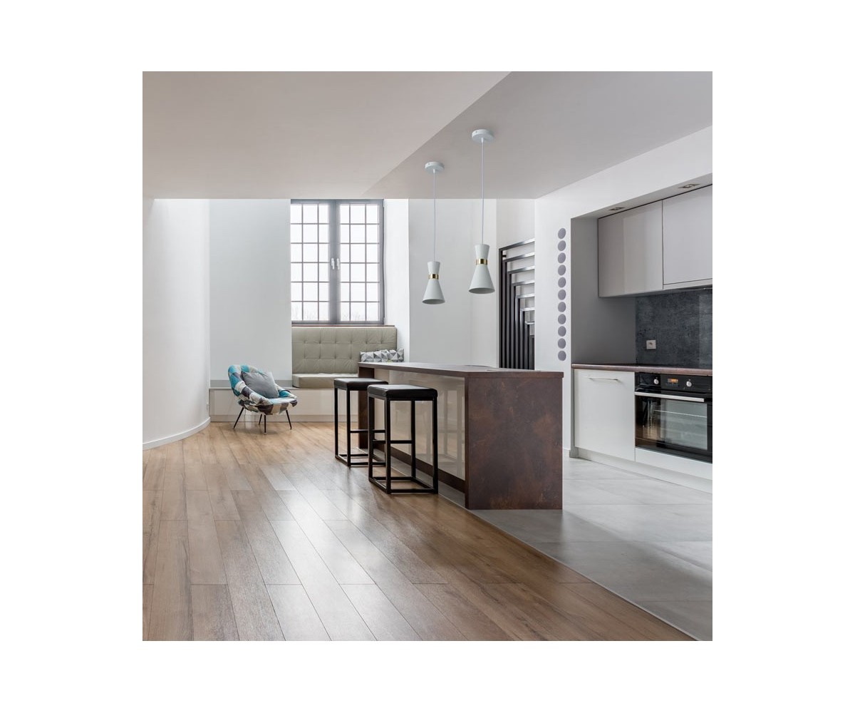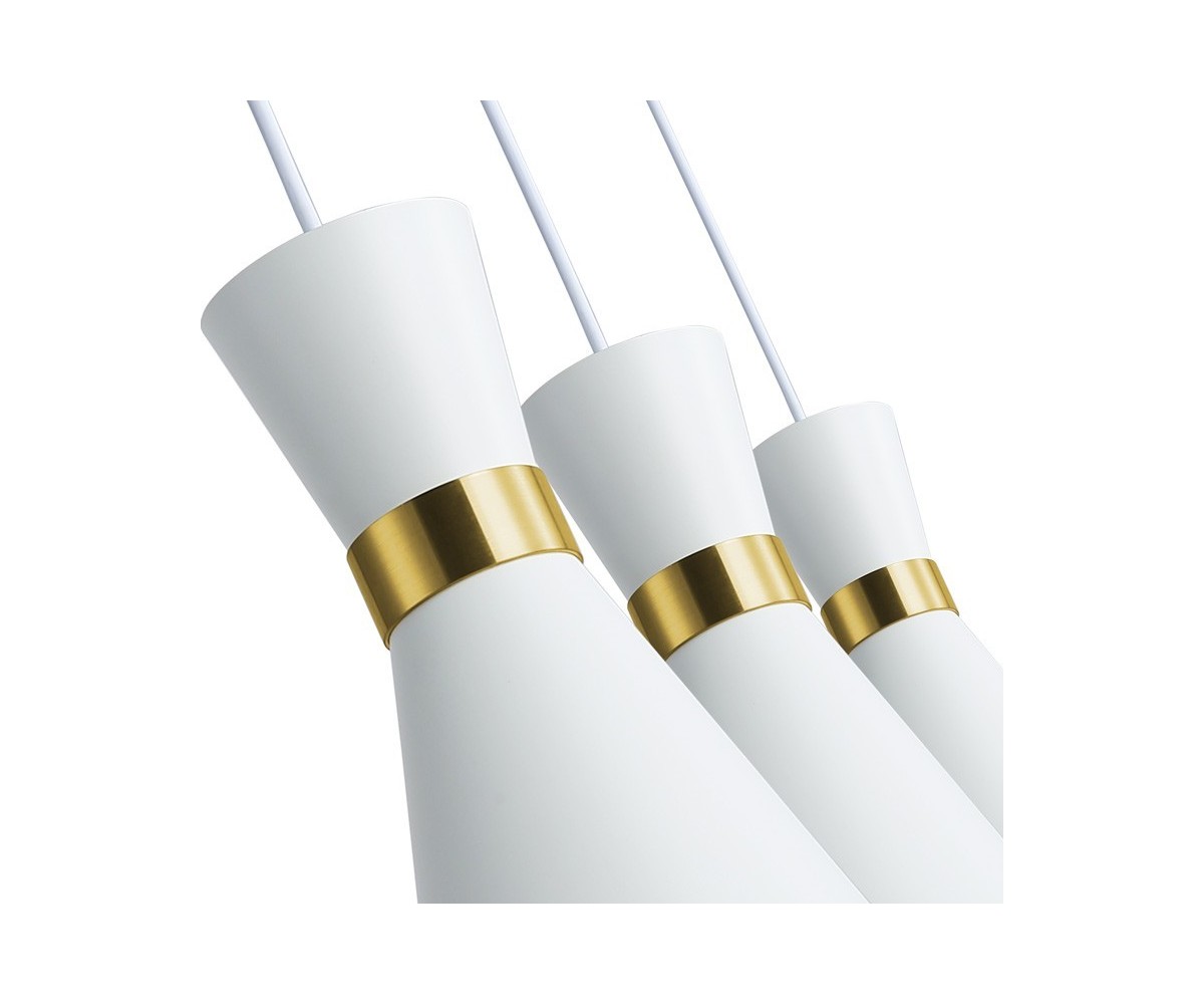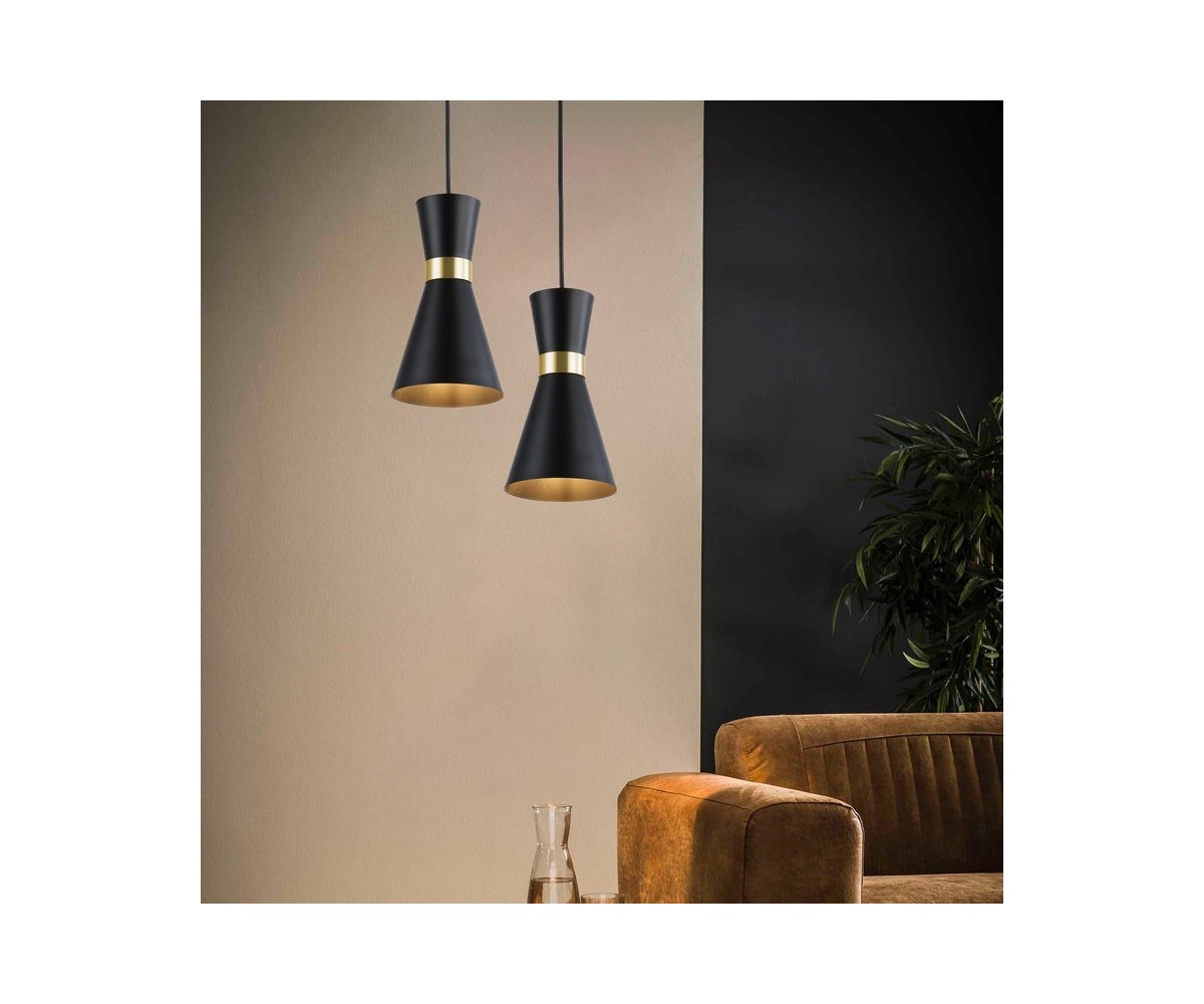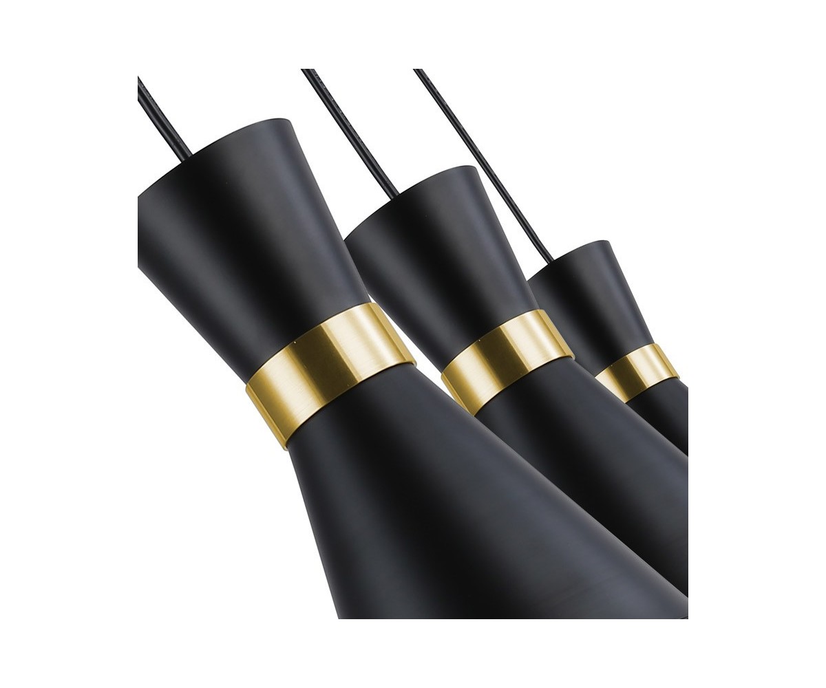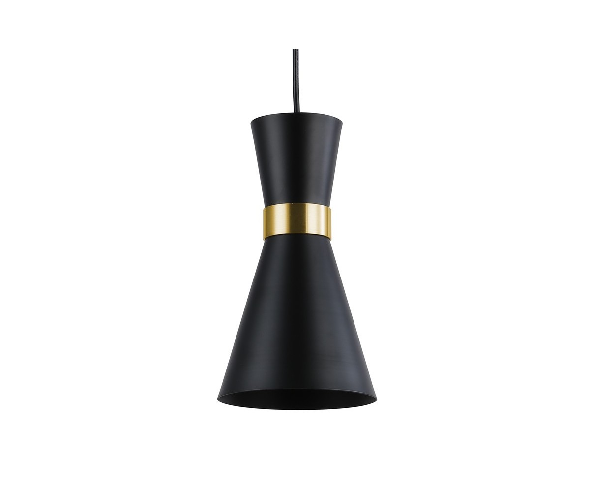 Lámpara de techo inspirada en un diseño de Mike Treanor. Doble pantalla en forma de cono en acero lacado color negro o blanco, agarre central en acero dorado. Largo del cable 100 cm, a la hora de su colocación se puede ajustar en altura. Rosca para bombilla E27, máximo 60w. Tensión nominal 220-240V/AC. Réplica con materiales originales de máxima calidad.