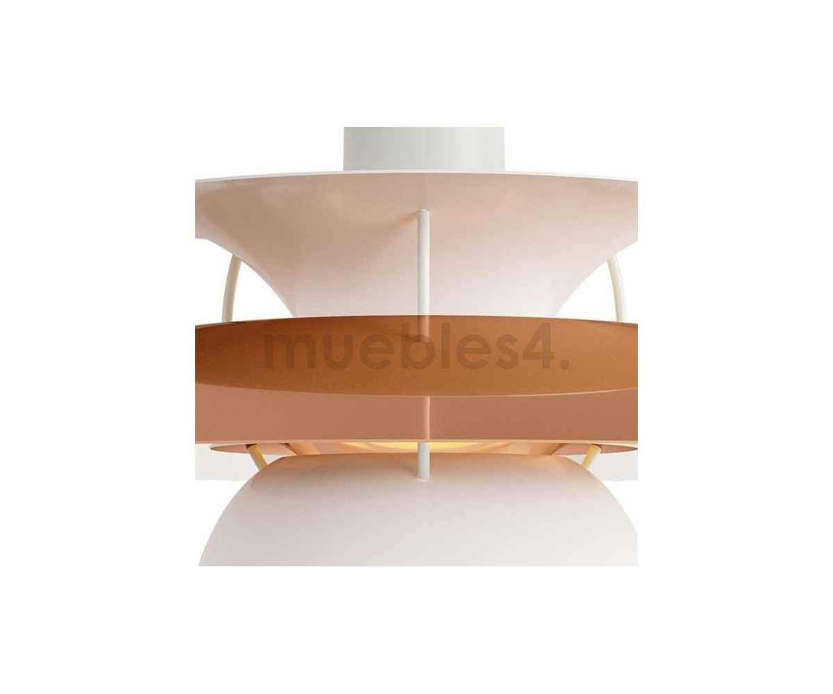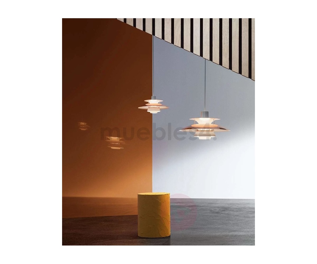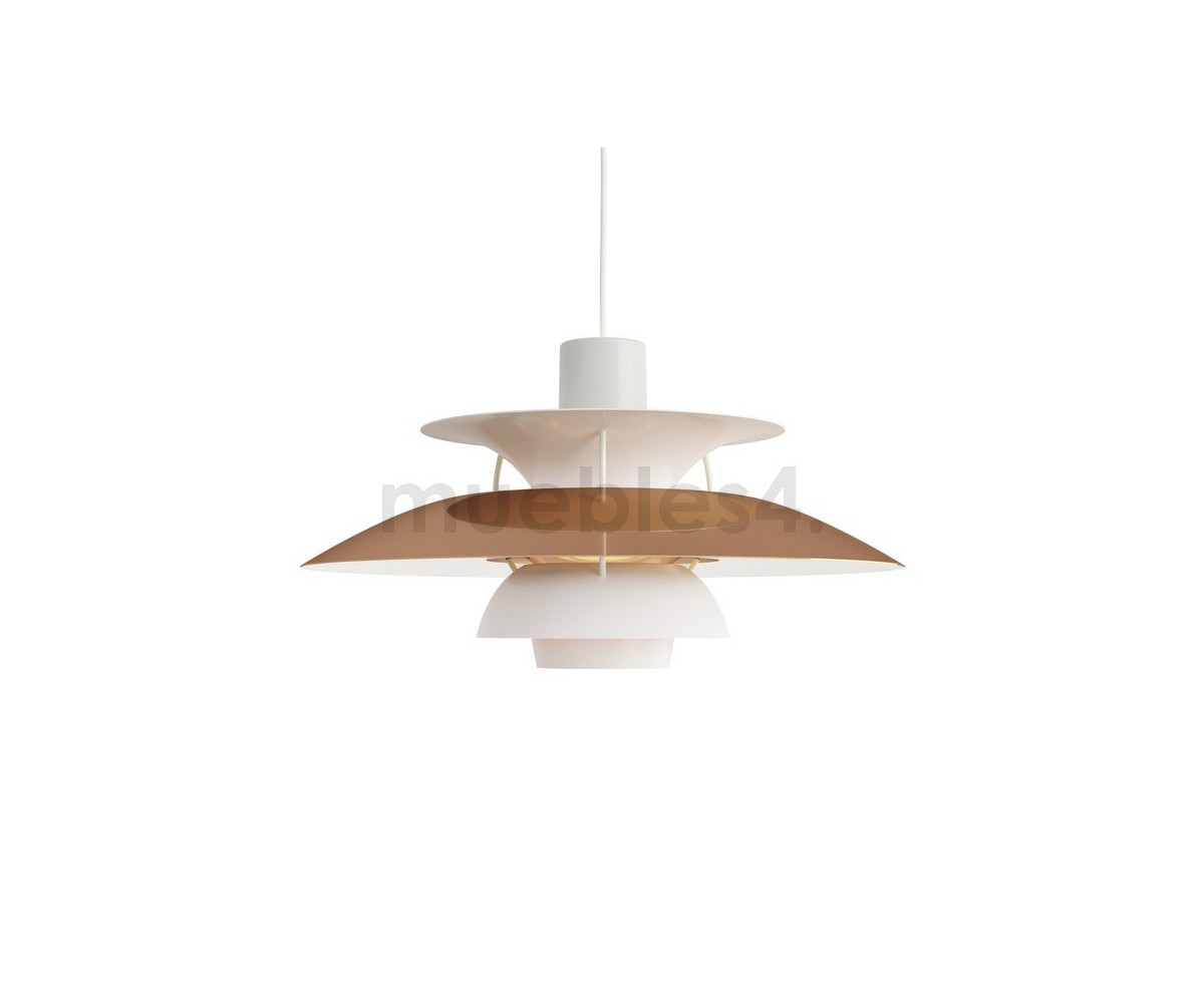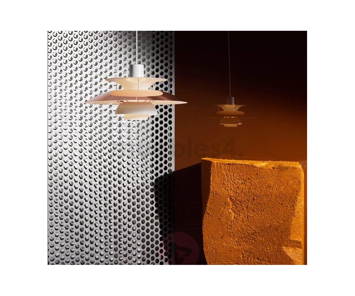Lámpara suspendida inspirada en un diseño de Poul Henningsen. La última versión en latón y cobre, combinado con blanco hace hincapié en el diseño del sistema de pantalla y le da a la luz una nueva dinámica gracias a las superficies de metal reflejado.