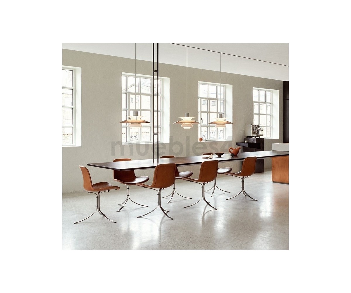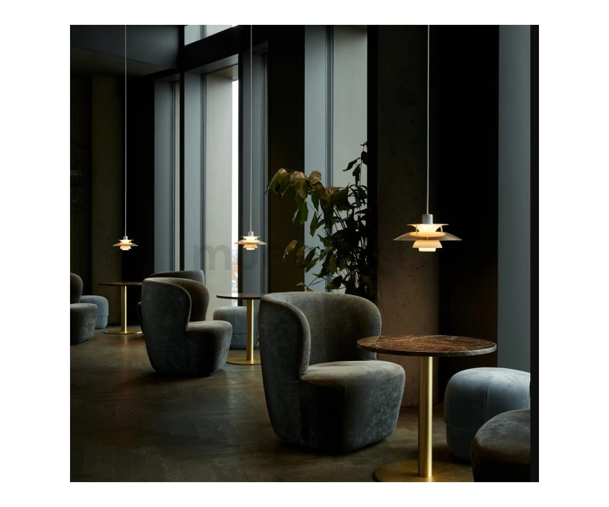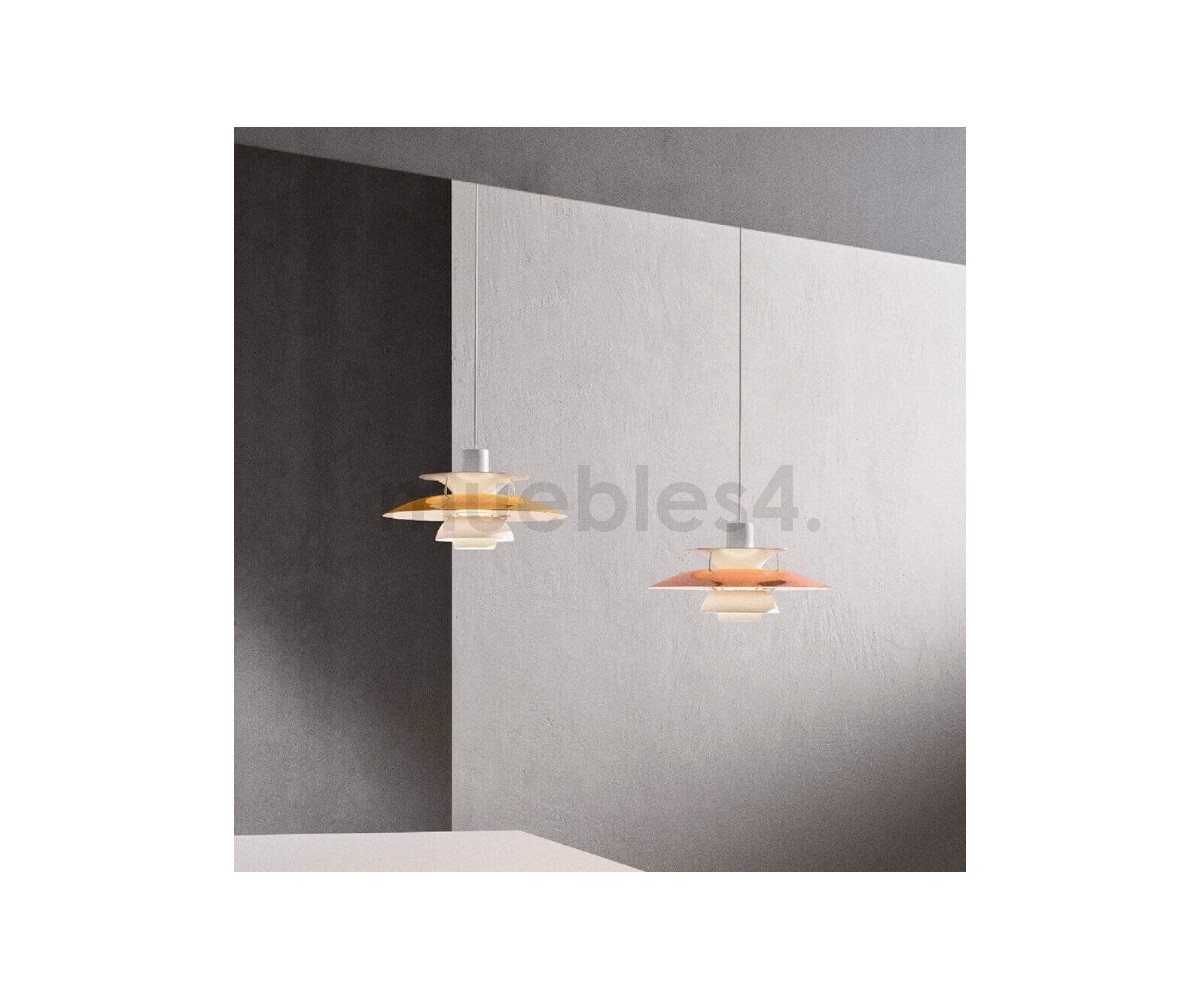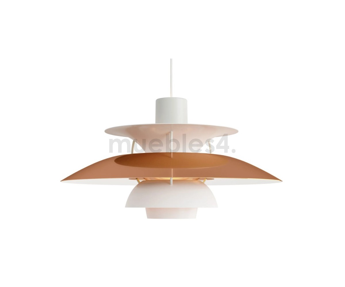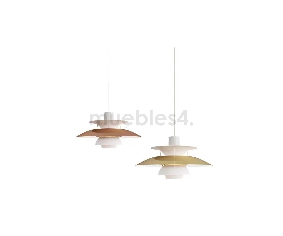 Lámpara suspendida inspirada en un diseño de Poul Henningsen. La última versión en latón y cobre, combinado con blanco hace hincapié en el diseño del sistema de pantalla y le da a la luz una nueva dinámica gracias a las superficies de metal reflejado.