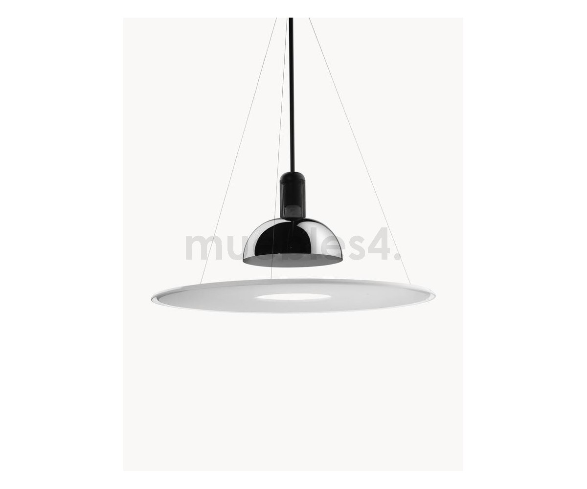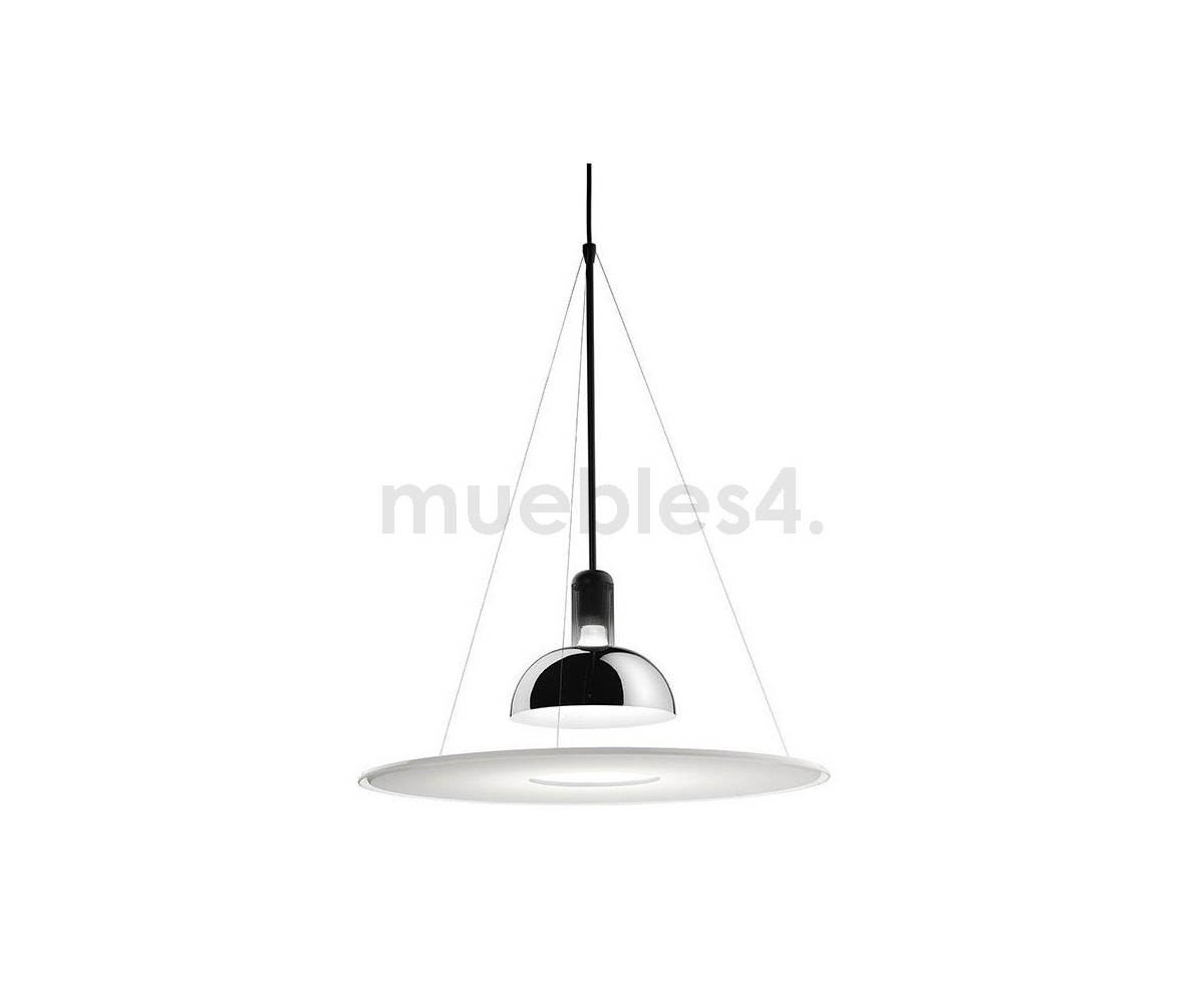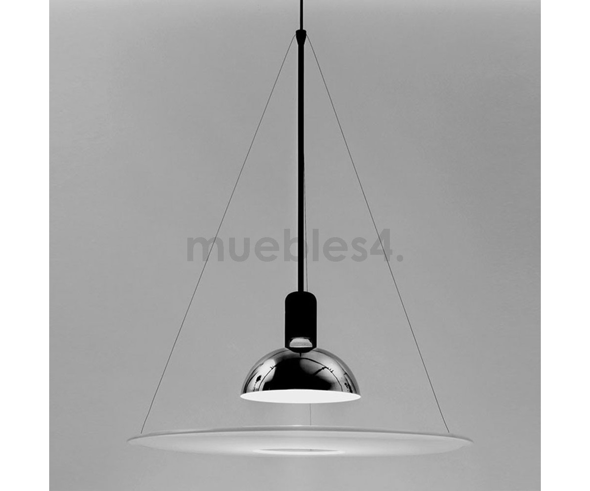 Lámpara de techo inspirada en un diseño de Achille Castiglioni. Luz directa/indirecta y difusa, esta lámpara es ideal para ambientar interiores. Su difusor está sostenido por tres cables finos en acero armónico, dando la ilusión de que está flotando, como un auténtico frisbee.
