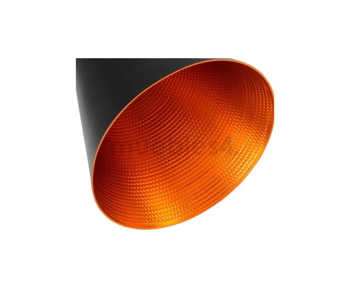 Lámpara suspendida inspirada en un diseño de Tom Dixon. Realizada en aluminio termolacado, color exterior en negro o blanco mate, color interior oro/dorado con grabado en relieve de escamas. Longitud de cable 120cm aprox. Modelo de bombilla E27 máximo 60w.  Réplica exacta con materiales originales de máxima calidad.