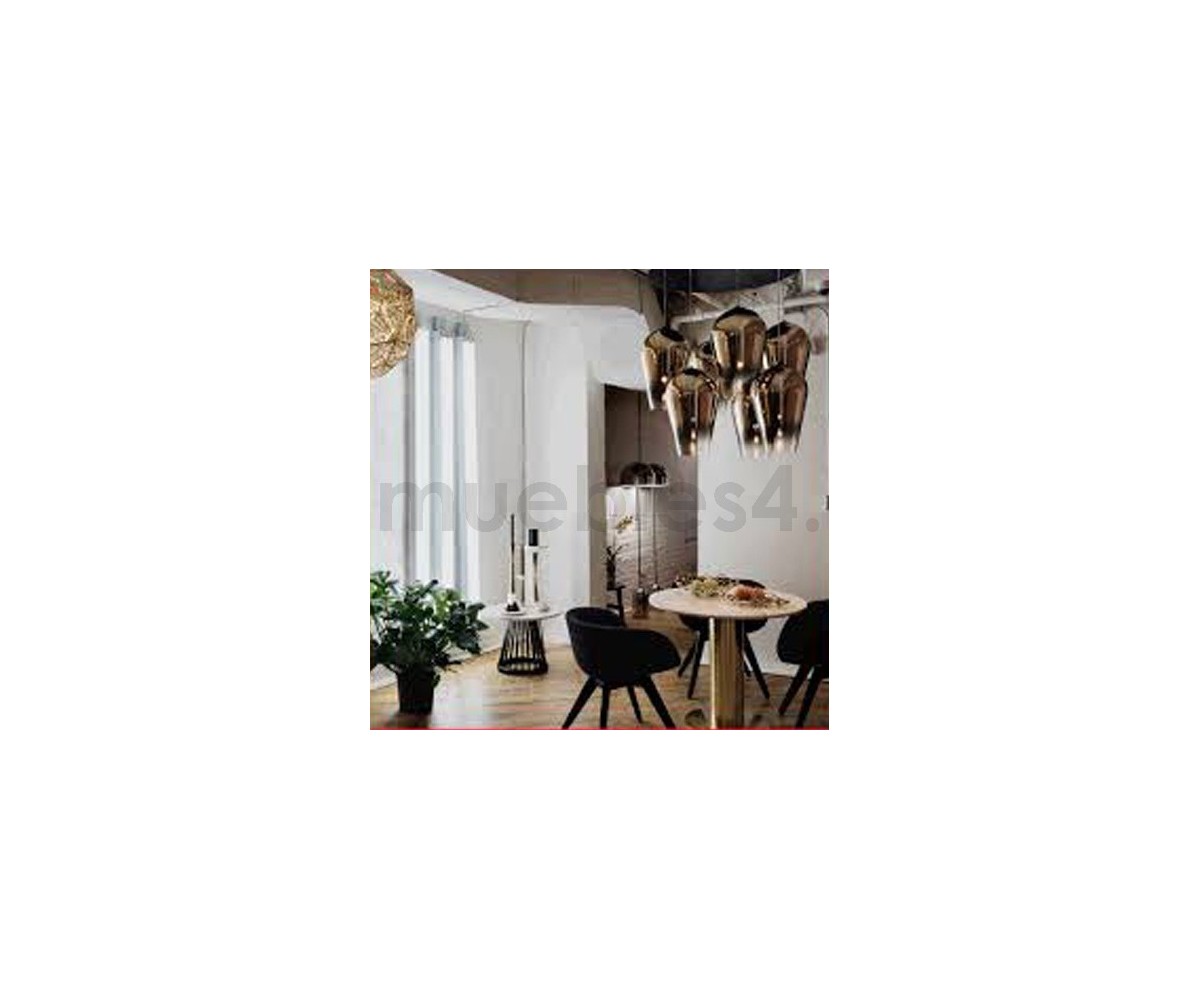 Lámpara suspendida inspirada en un diseño de Tom Dixon. Fabricada en cristal de una única pieza, teminación dorado o cobre. Modelo bombiella E27. Réplica exacta con materiales originales de máxima calidad.