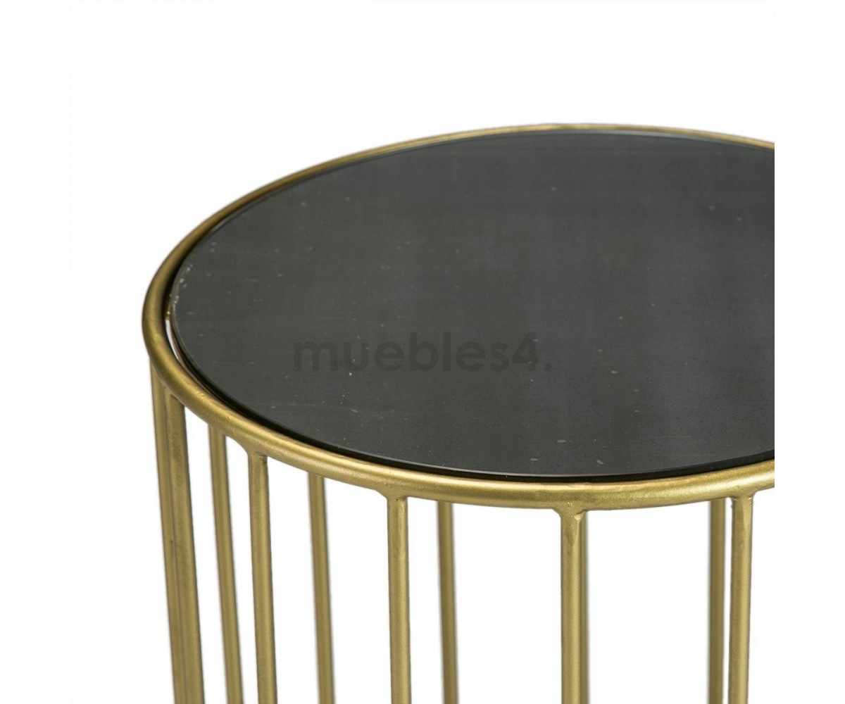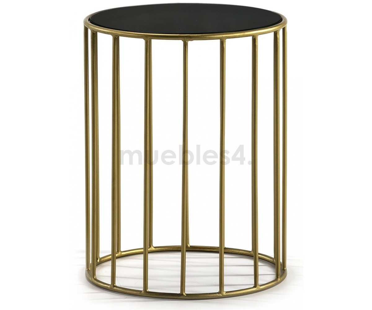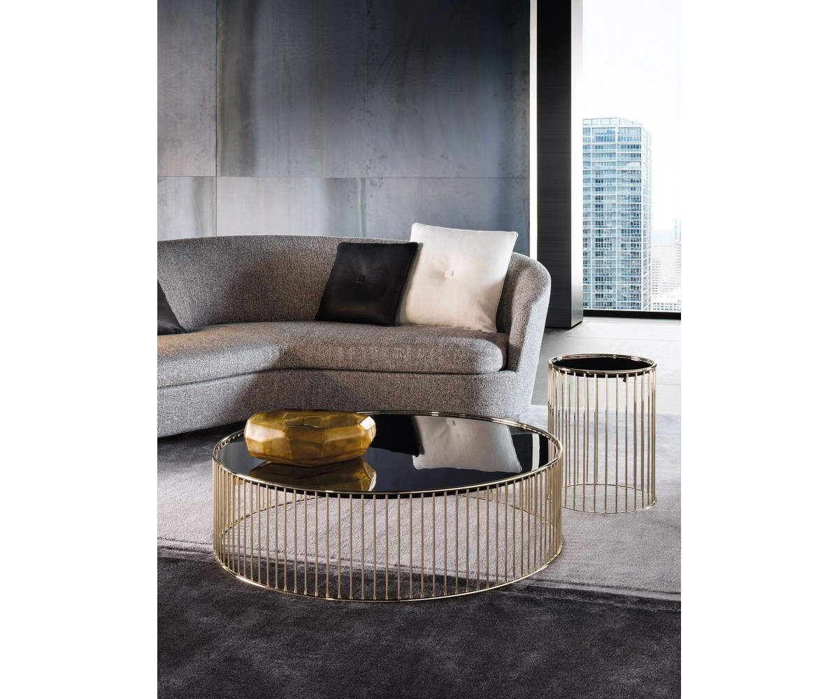 Mesa auxiliar inspirada en un diseño de Rodolfo Dordoni. Estructura fabriacada en acero con triple lacado dorado, sobre circular en espejo negro. También disponible en mesa de centro. Réplica exacta con materiales originales de máxima calidad.