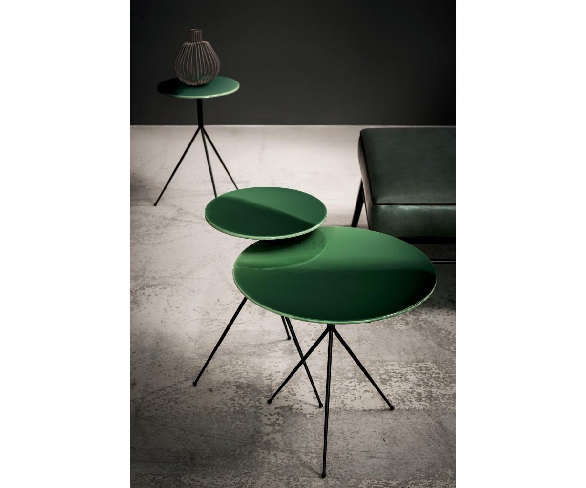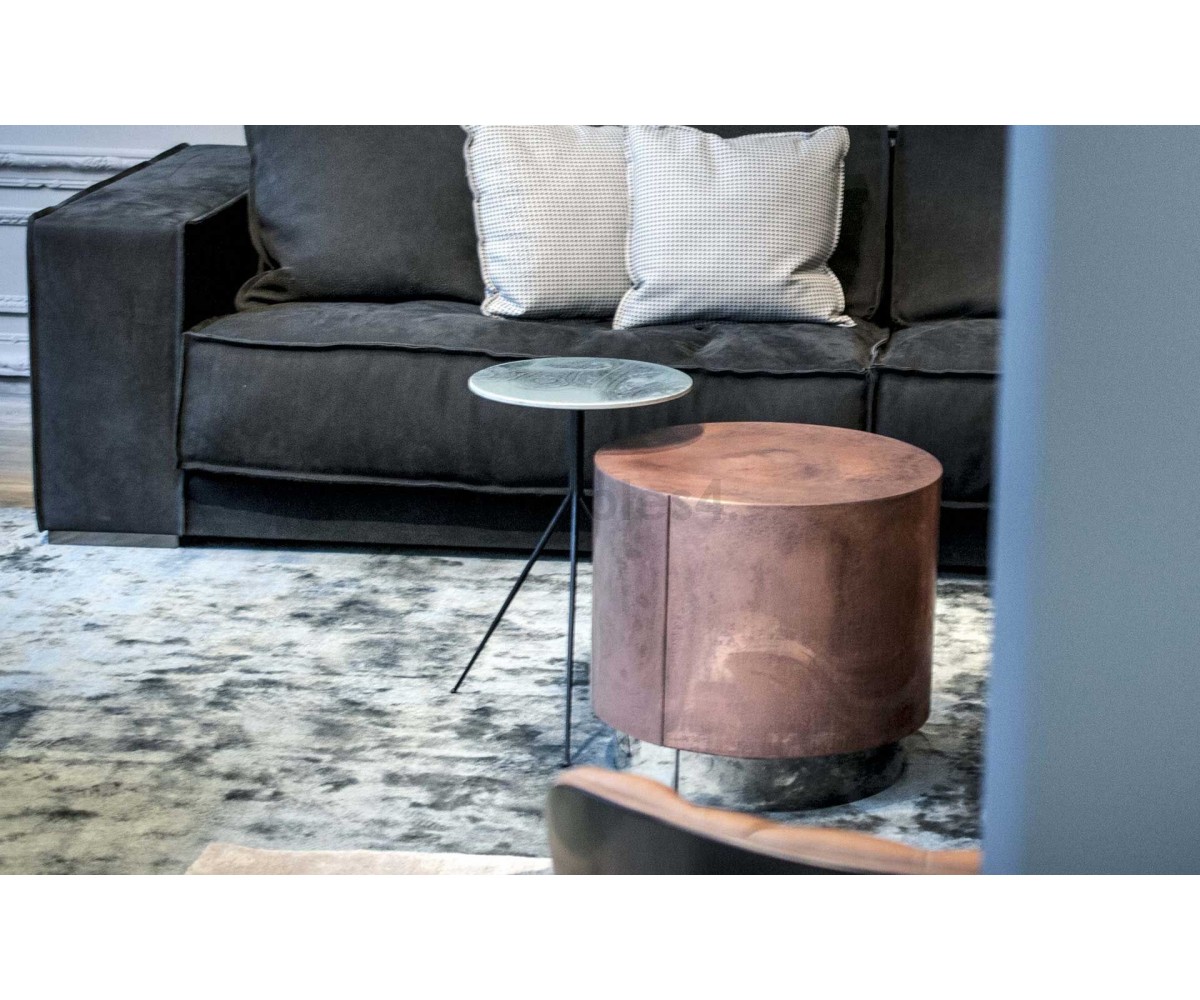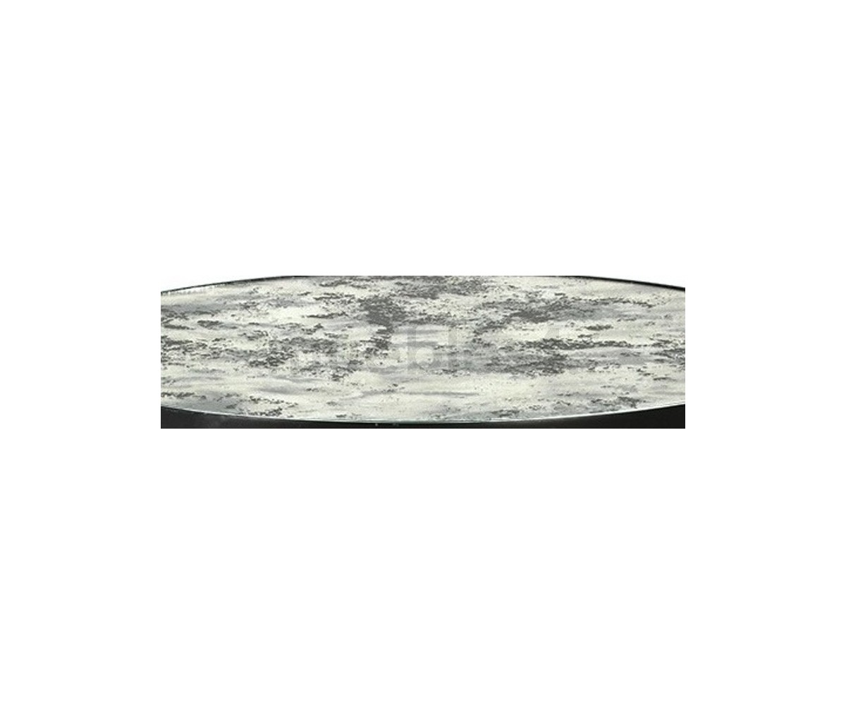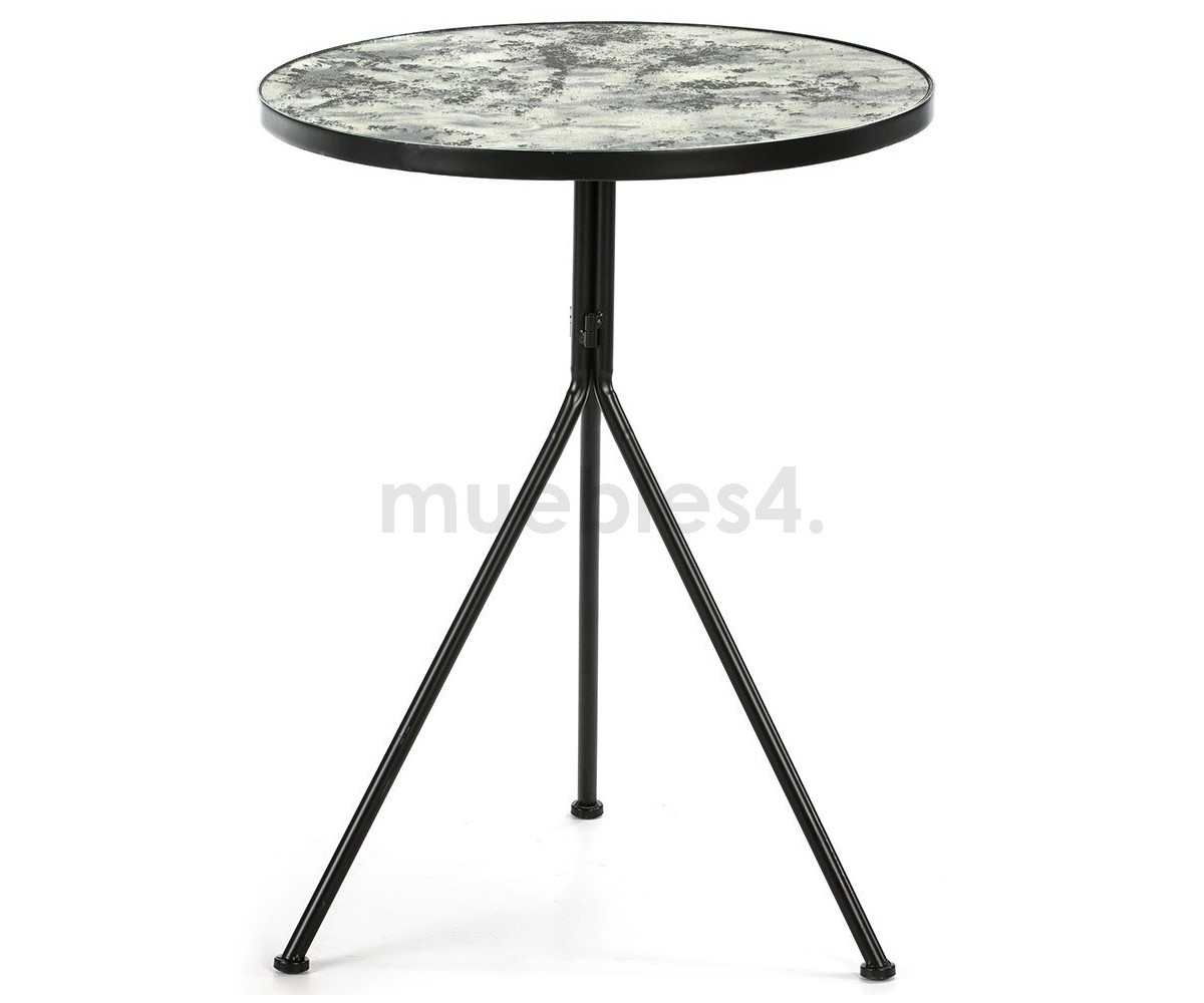 Mesa auxiliar inspirada en un diseño de Draga & Aurel. Estructura fabricada en forma de tripode en acero con triple lacado color negro, sobre circular en espejo envejecido. Réplica exacta con materiales originales de máxima calidad.