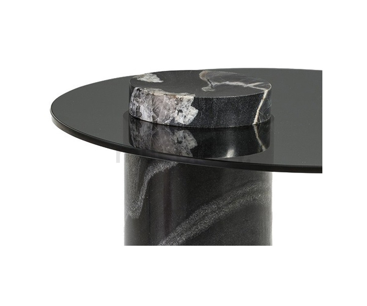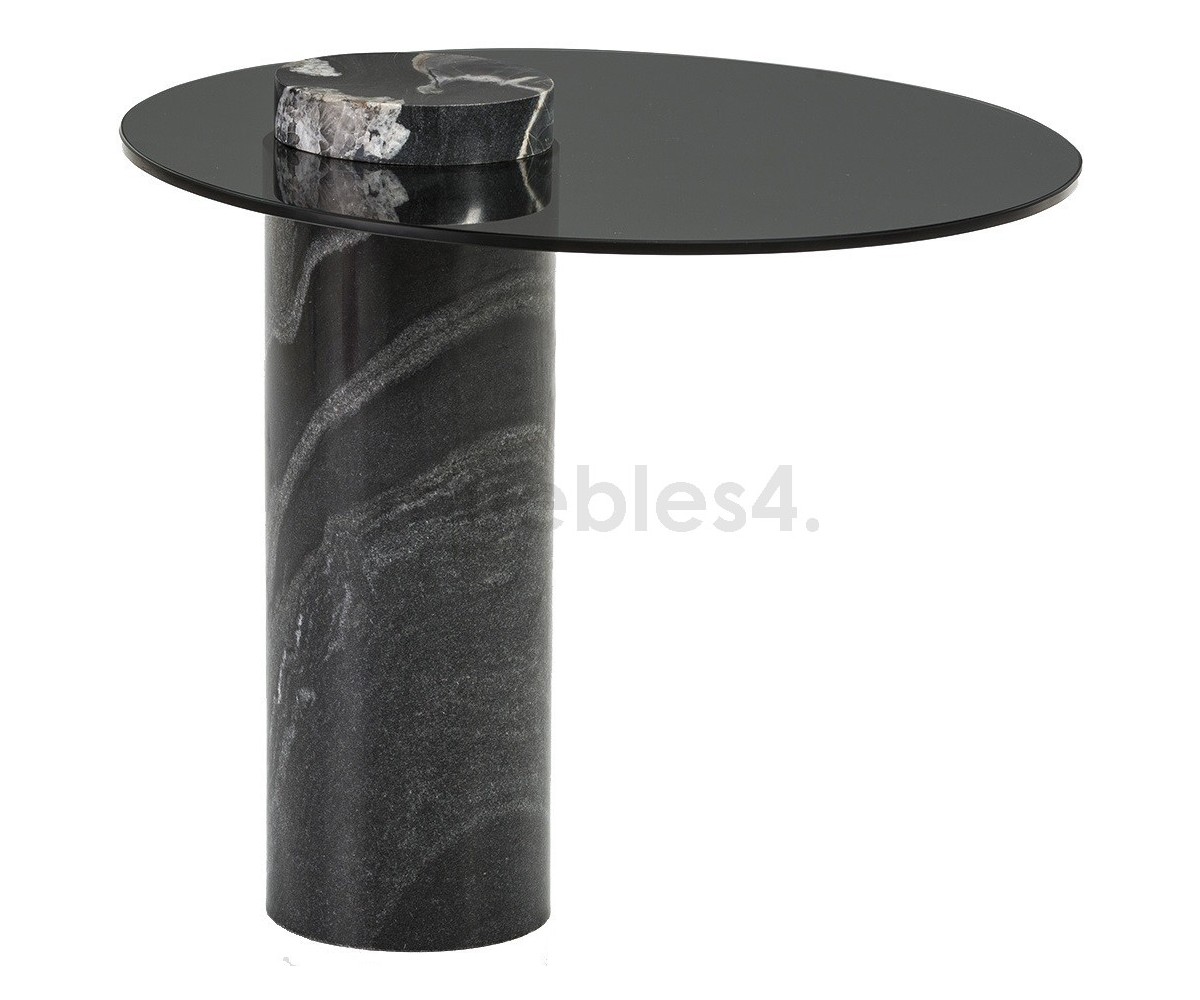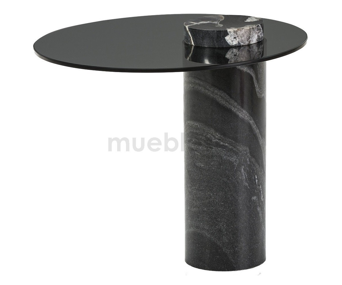 Mesa auxiliar inspirada en un diseño de Massimo Castagna. Cuerpo tubular de mármol negro veteado en blanco, sobre semicircular en cristal templado color negro, perforado por la base de la mesa. Peso 29kg. Réplica exacta con materiales originales de máxima calidad.