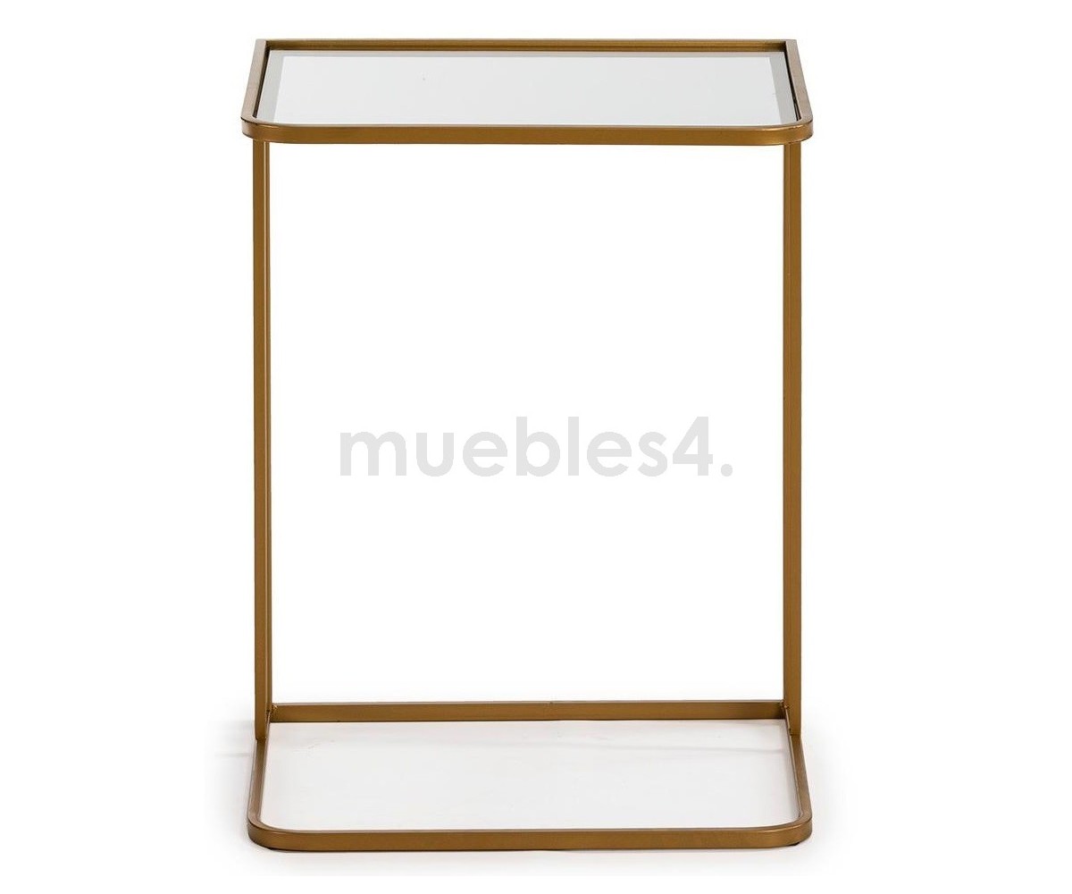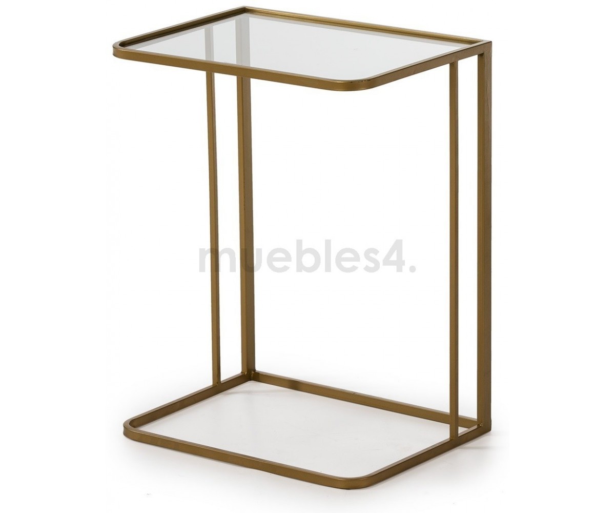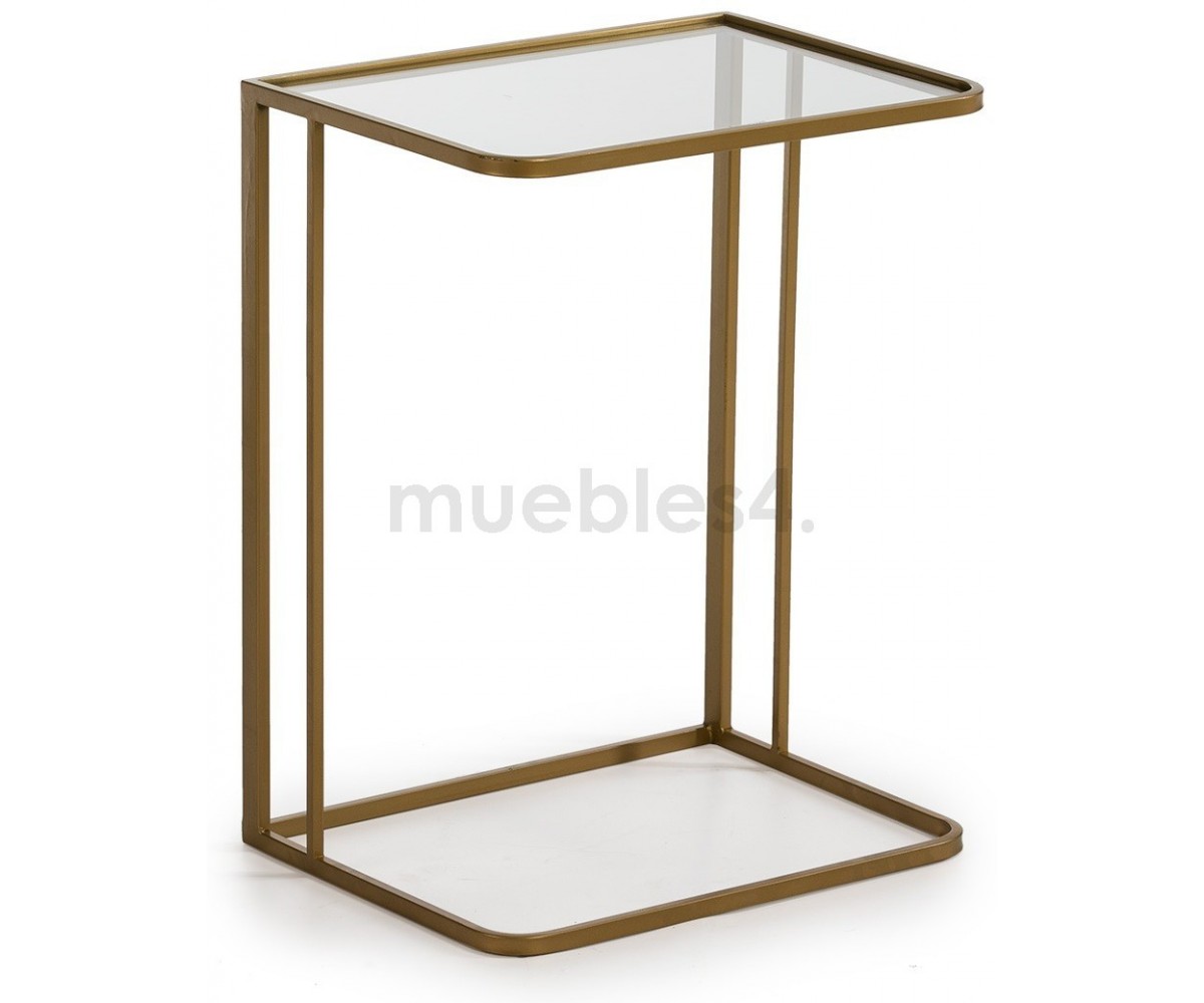 Mesa auxiliar inspirada en un diseño de Dietmar Joester. Armazón fabricado en acero con triple lacado terminación dorado mate, sobre de cristal transparente templado. Réplica exacta con materiales originales de máxima calidad
