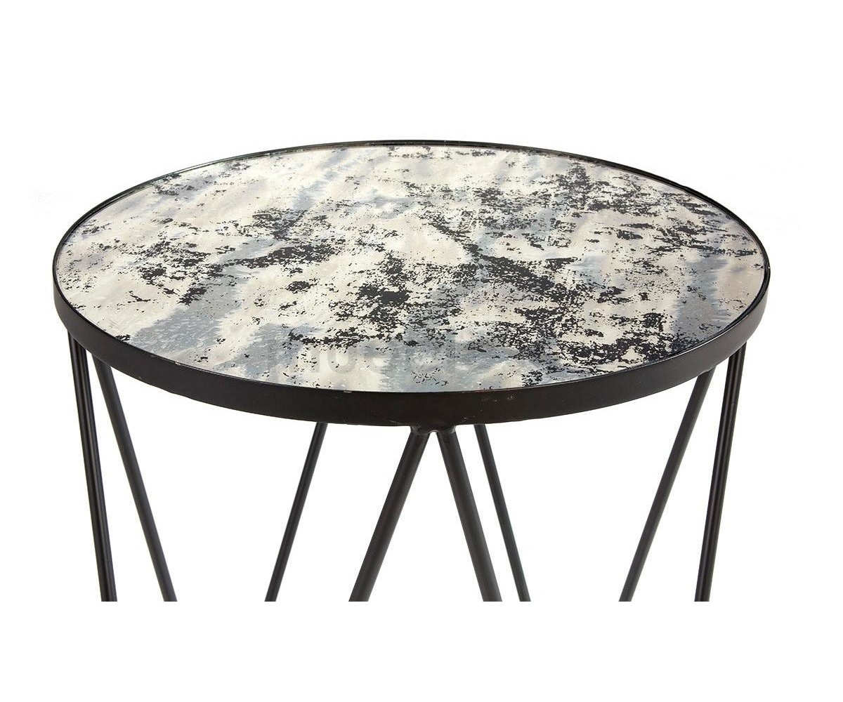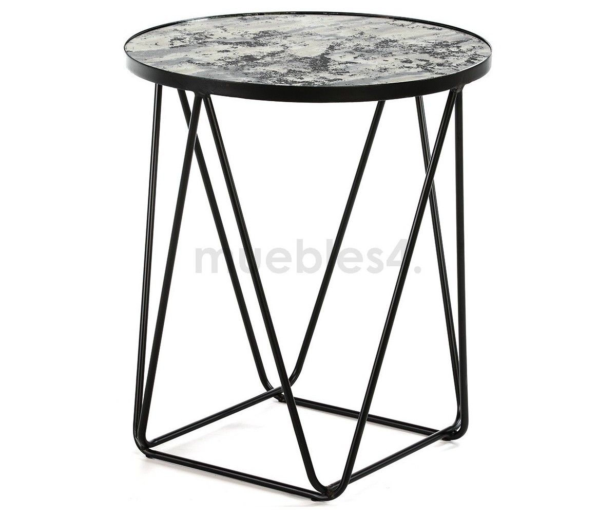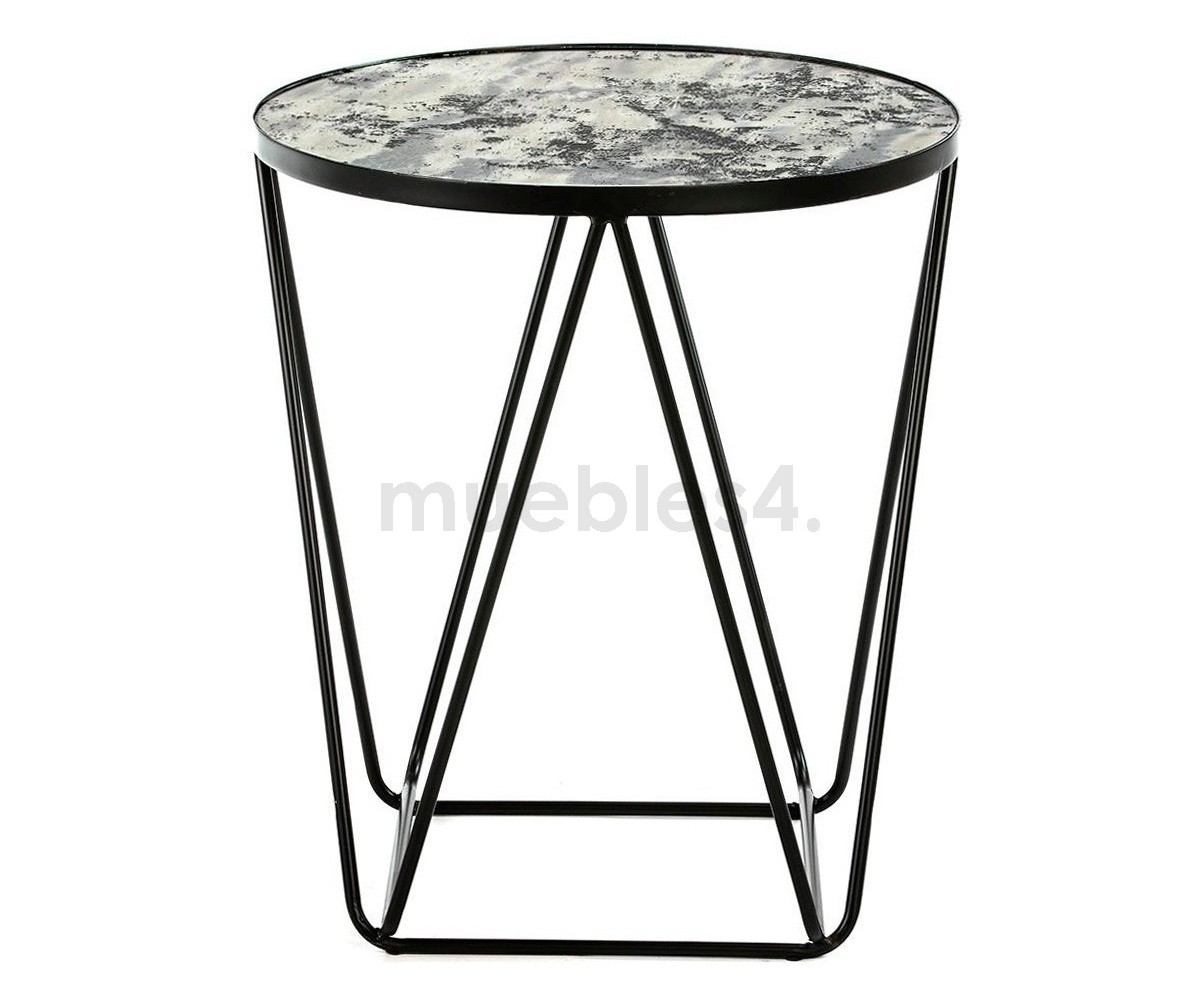 Mesa auxiliar inspirada en un diseño de Draga & Aurel. Estructura fabricada en forma de tripode en acero con triple lacado color negro, sobre circular en espejo envejecido. Réplica exacta con materiales originales de máxima calidad.