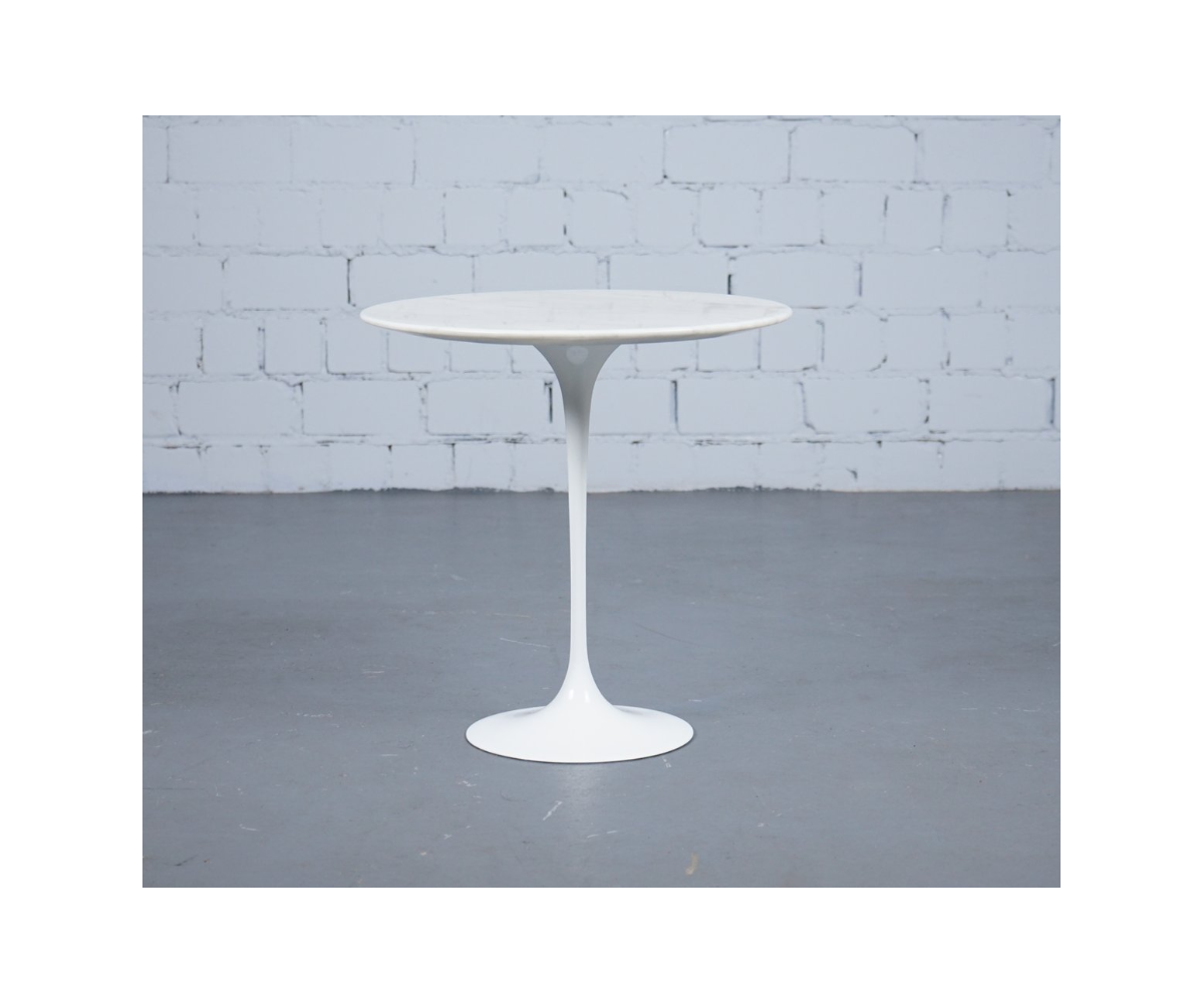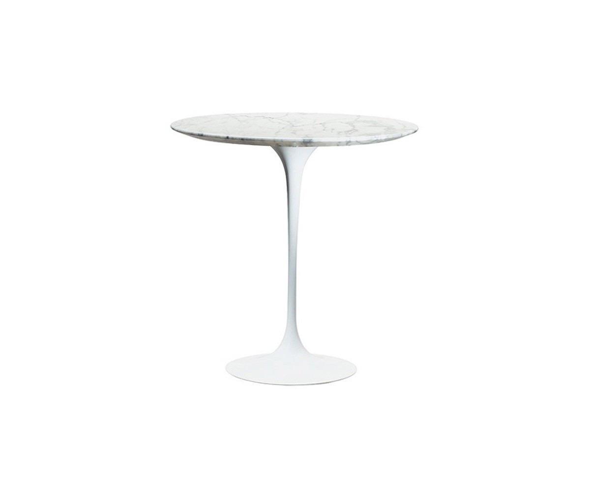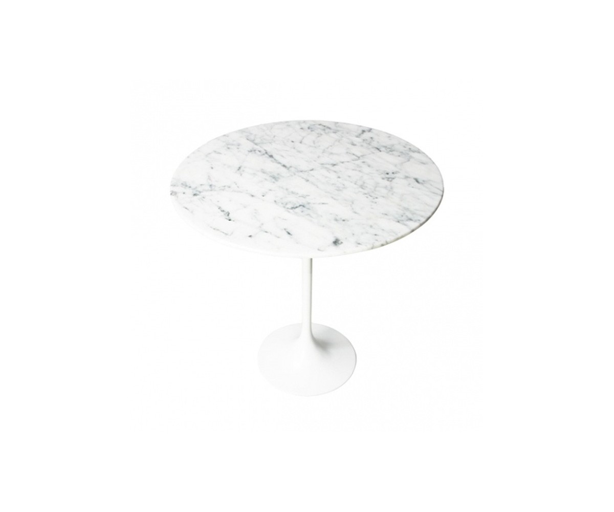 Mesa auxiliar inspirada en un diseño de Eero Saarinen. Base de aluminio triple lacado al horno en color blanco con terminación brillo, tapa en mármol marquina superior blanco borde biselado. La pieda al ser un material natural, puede cambiar ligéramente tono y dibujo. Réplica exacta con materiales originales de máxima calidad.