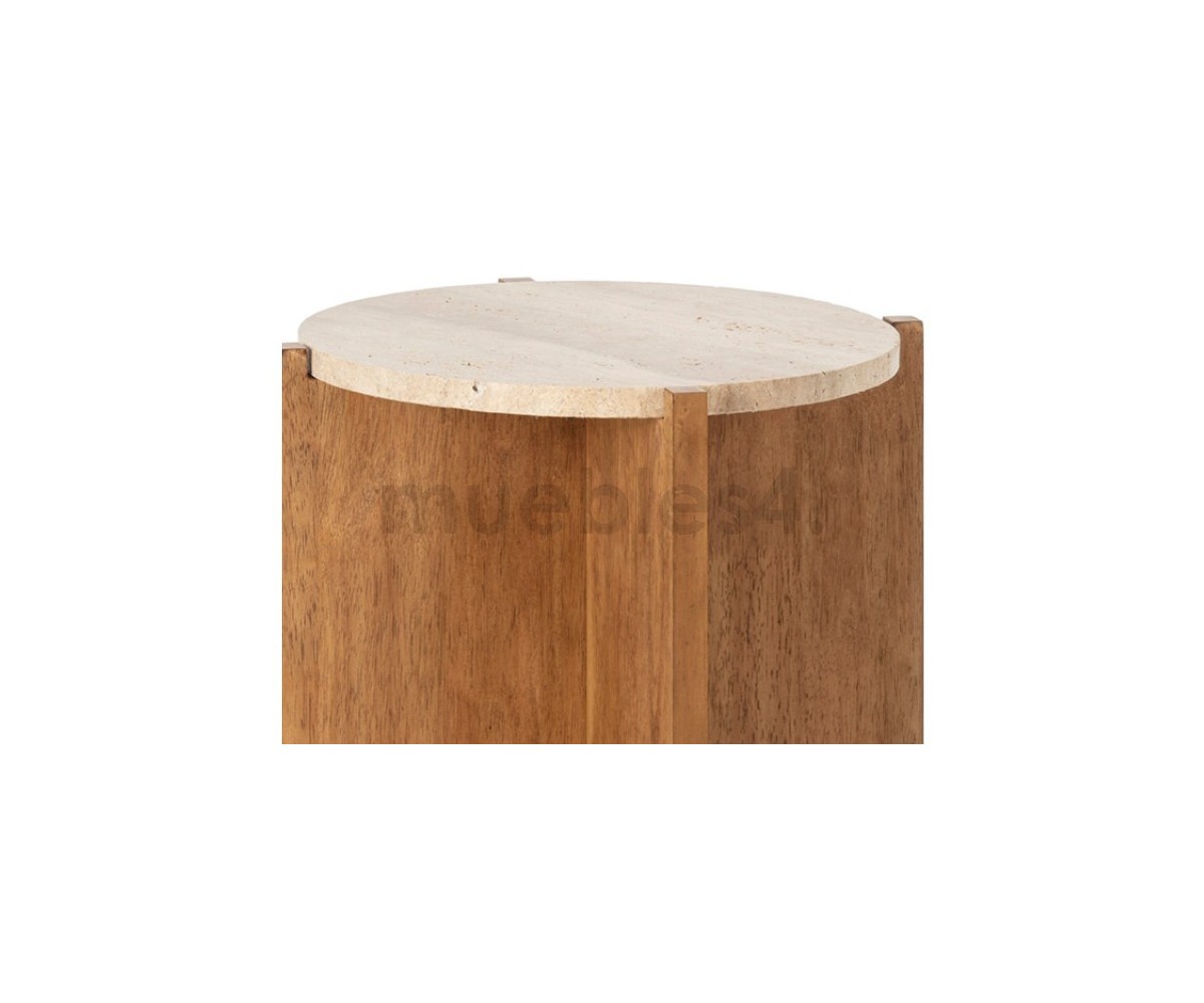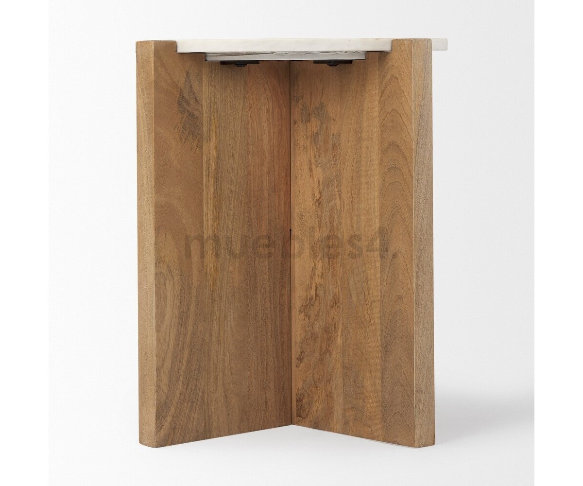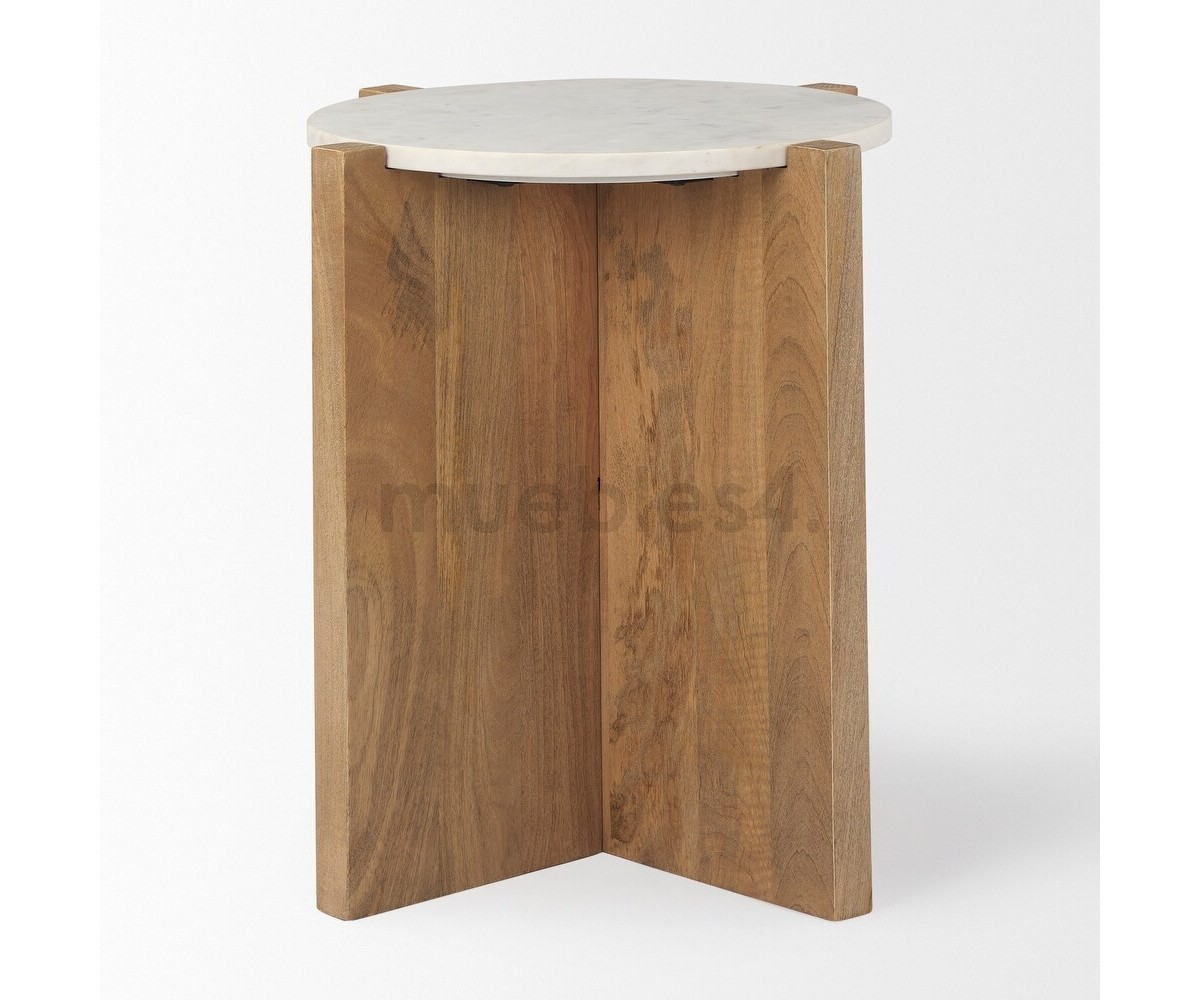 Mesa auxiliar inspirada en un diseño de Norm Architects. De diseño geométrico y modernista, formada por dos listones de madera maciza en forma de cruz para que encajen en un disco de mármol.