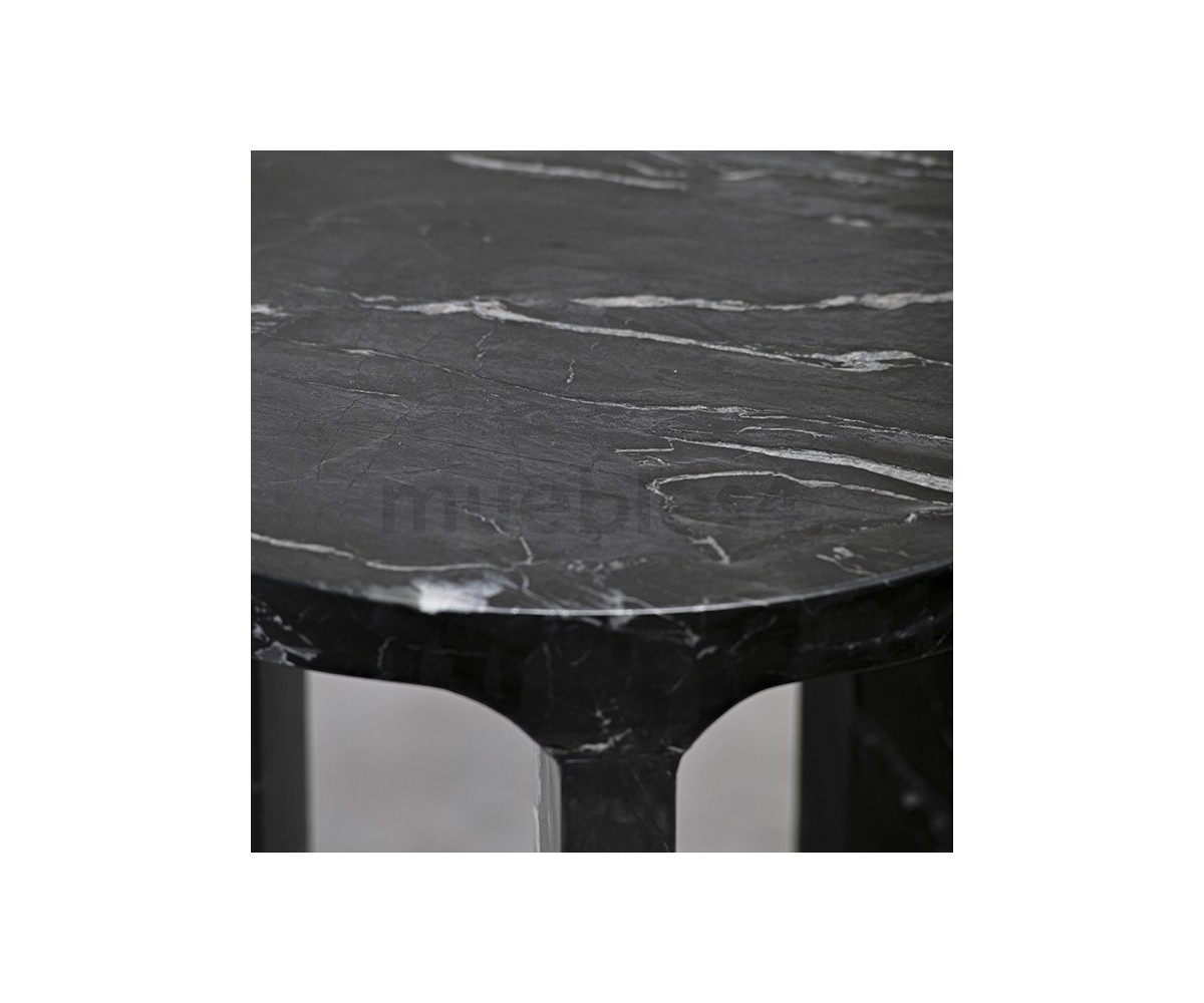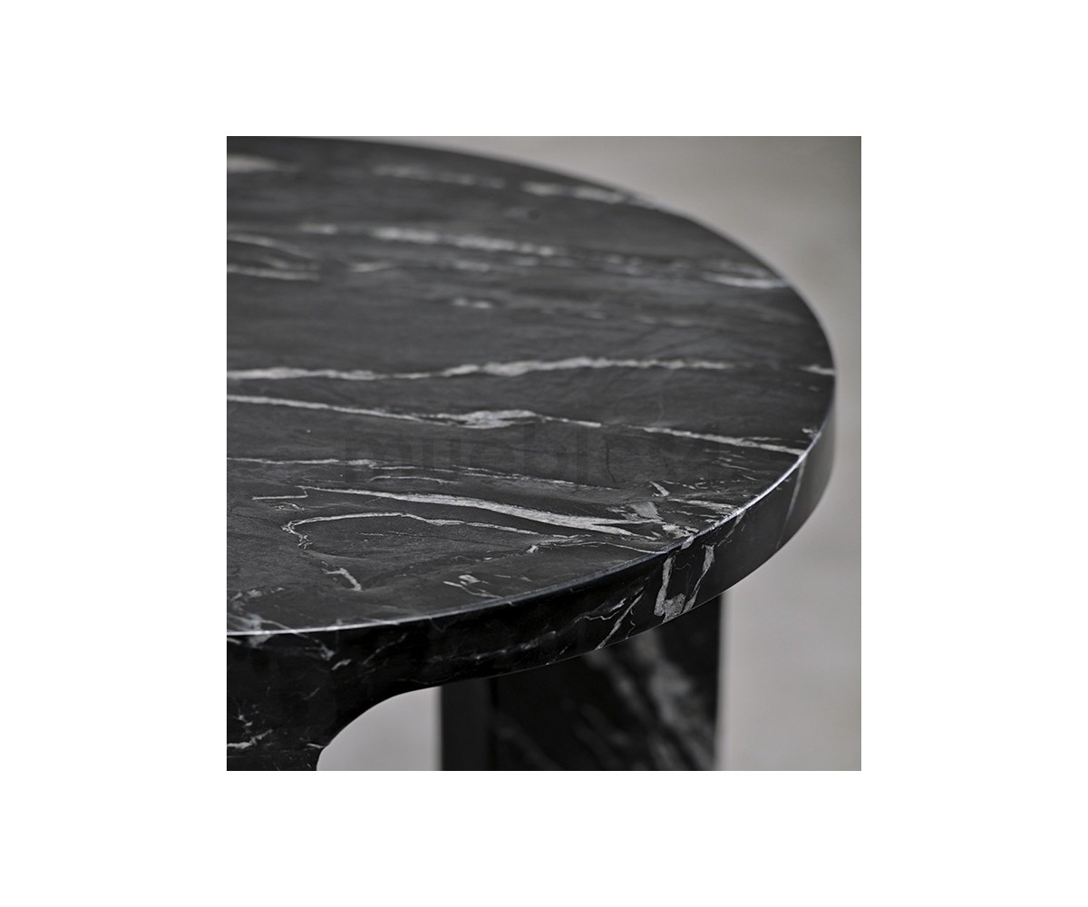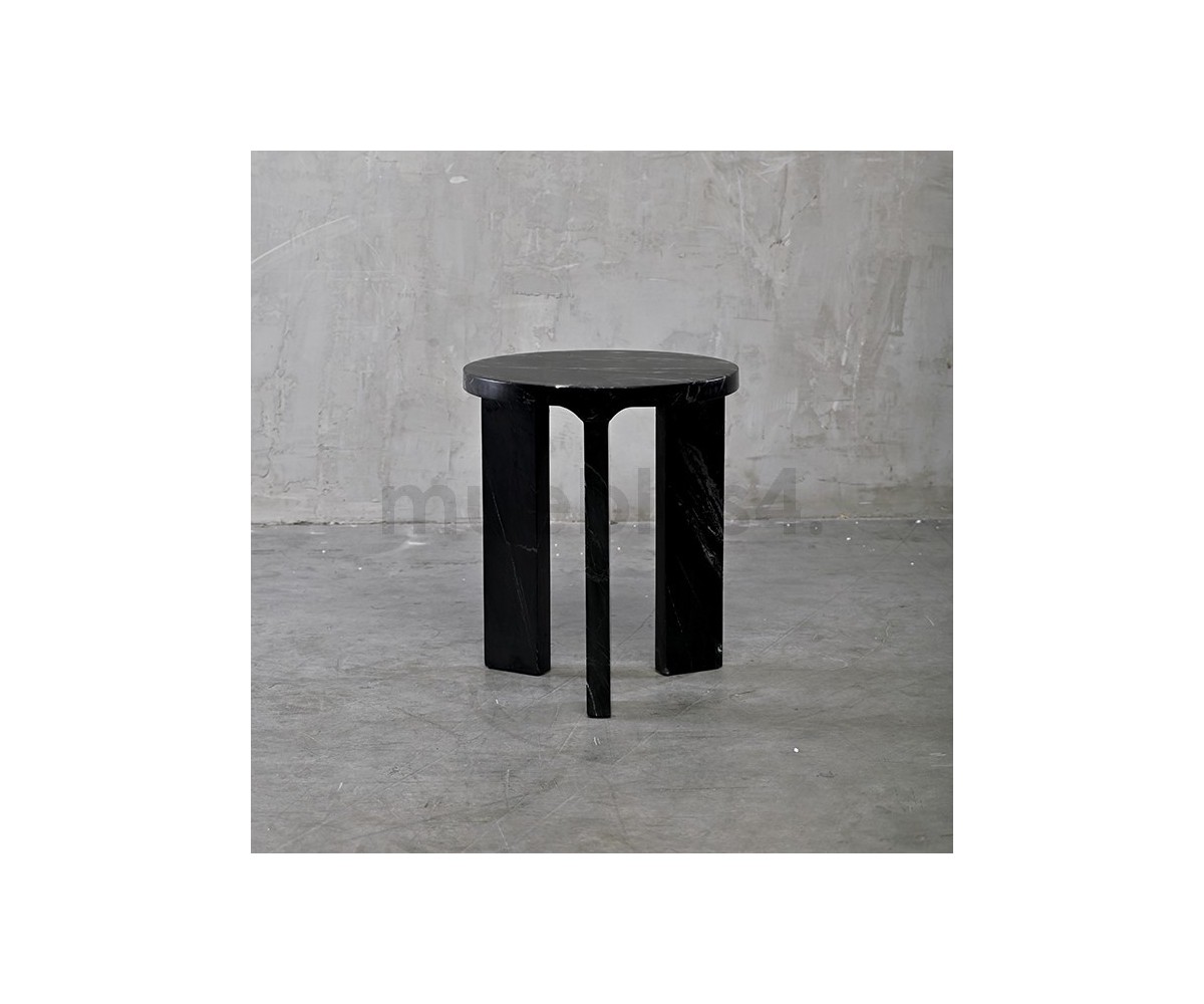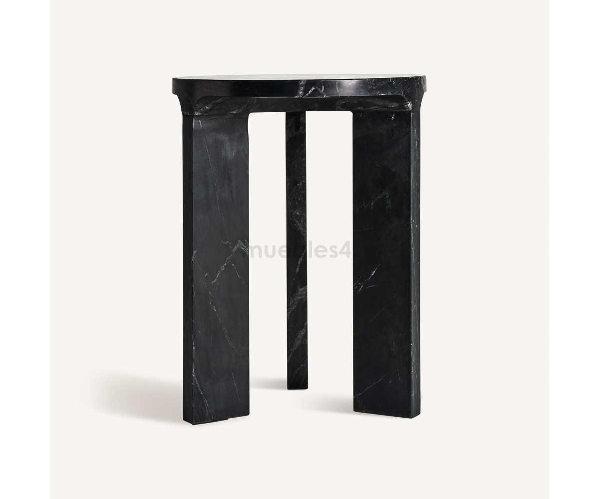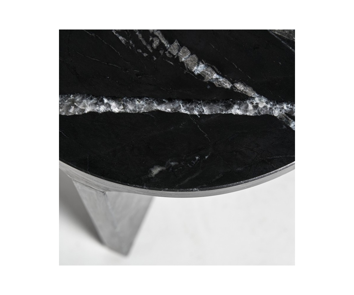 Mesa auxiliar inspirado en un diseño de Lorenzo Bini. Elaborada en mármol negro intenso, presenta una llamativa silueta circular con tres patas en forma de losa, cada una conectada por detalles únicos. Este diseño robusto y elegante ofrece una presencia imponente, combinando materialidad lujosa con un llamativo juego de formas.