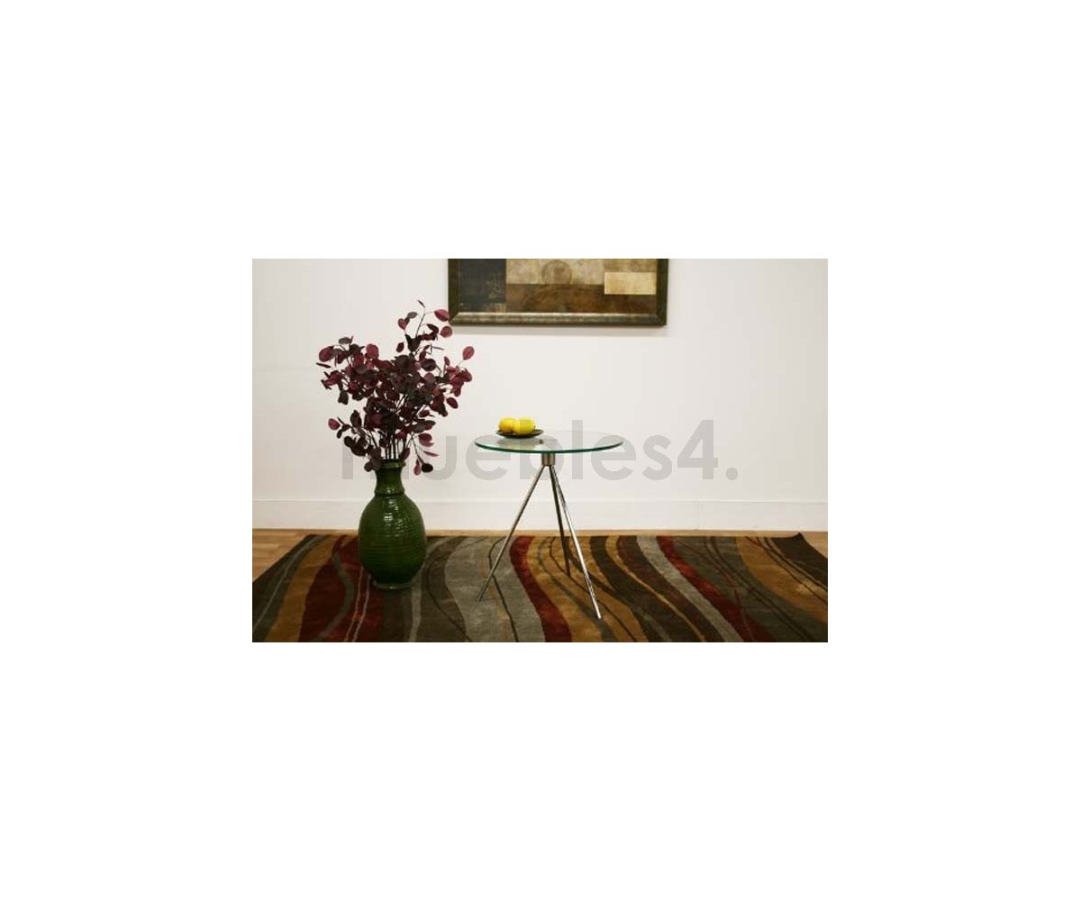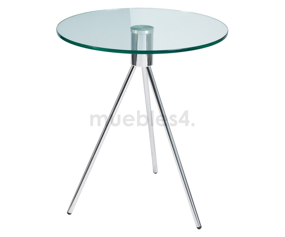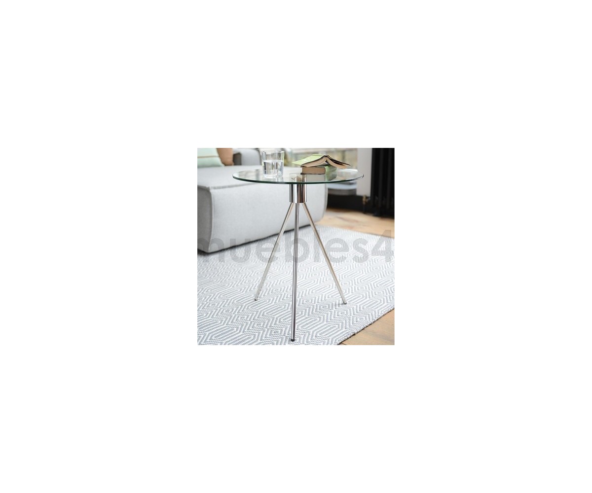 Mesa auxiliar inspirada en un diseño de Europe Design. Base tripode en acero cromado terminación brillo, tapa circular en cristal templado transparente. Réplica exacta con materiales originales de máxima calidad.