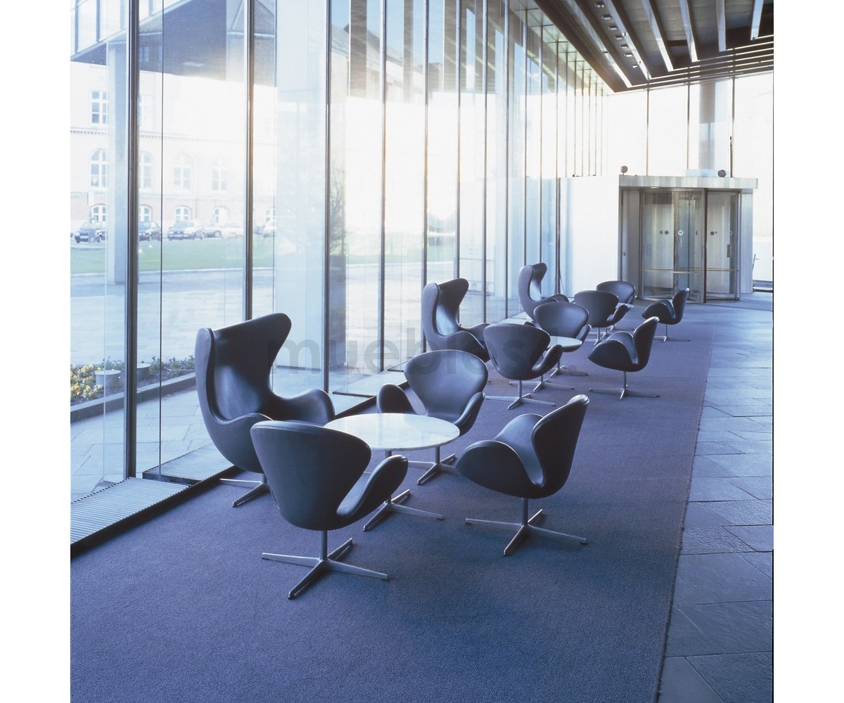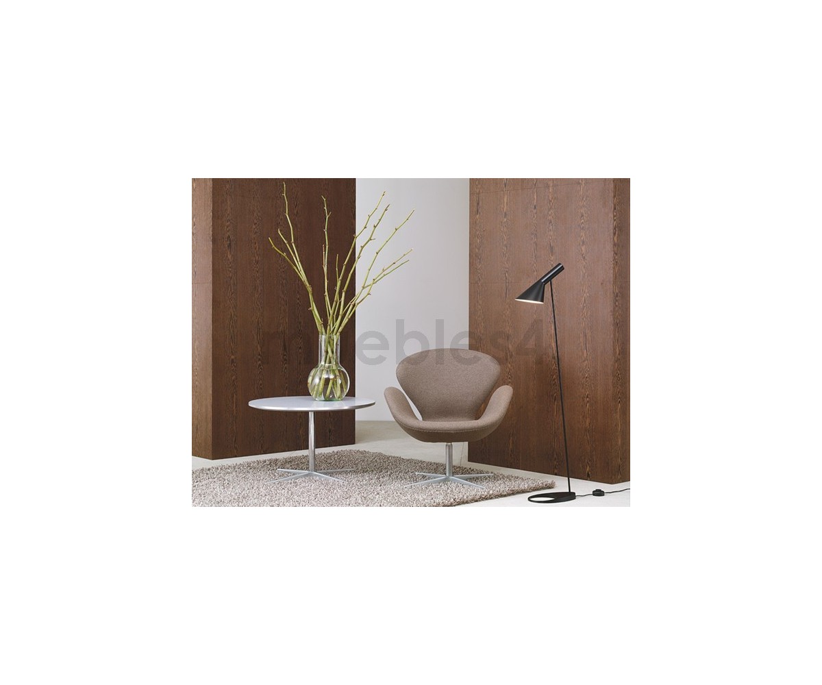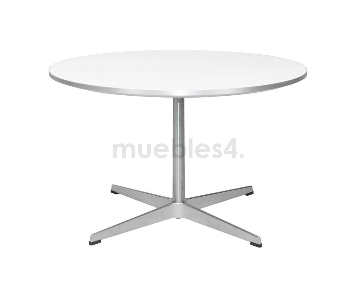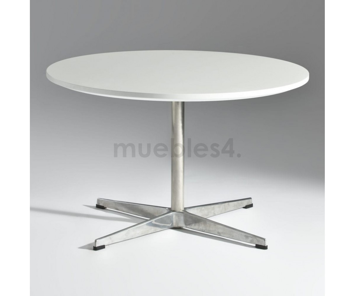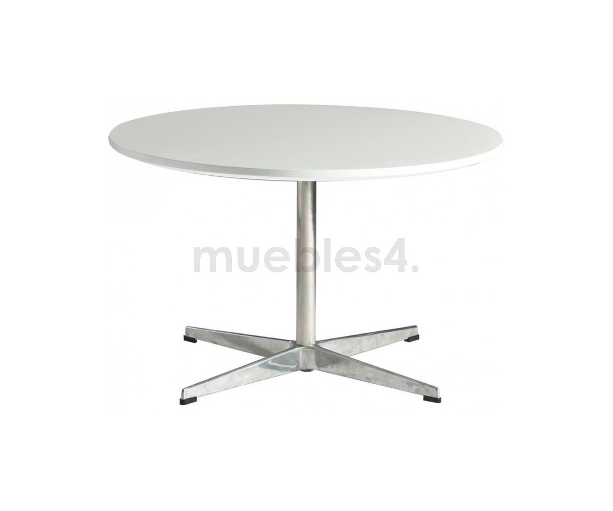 Mesa de centro circular, inspirada en un diseño de Arne Jacobsen. Estructrura tubular y de pletina en acero cromado terminación brillo alta calidad. Tapa en madera con triple lacada en color blanco. Réplica exacta con materiales originales de máxima calidad.