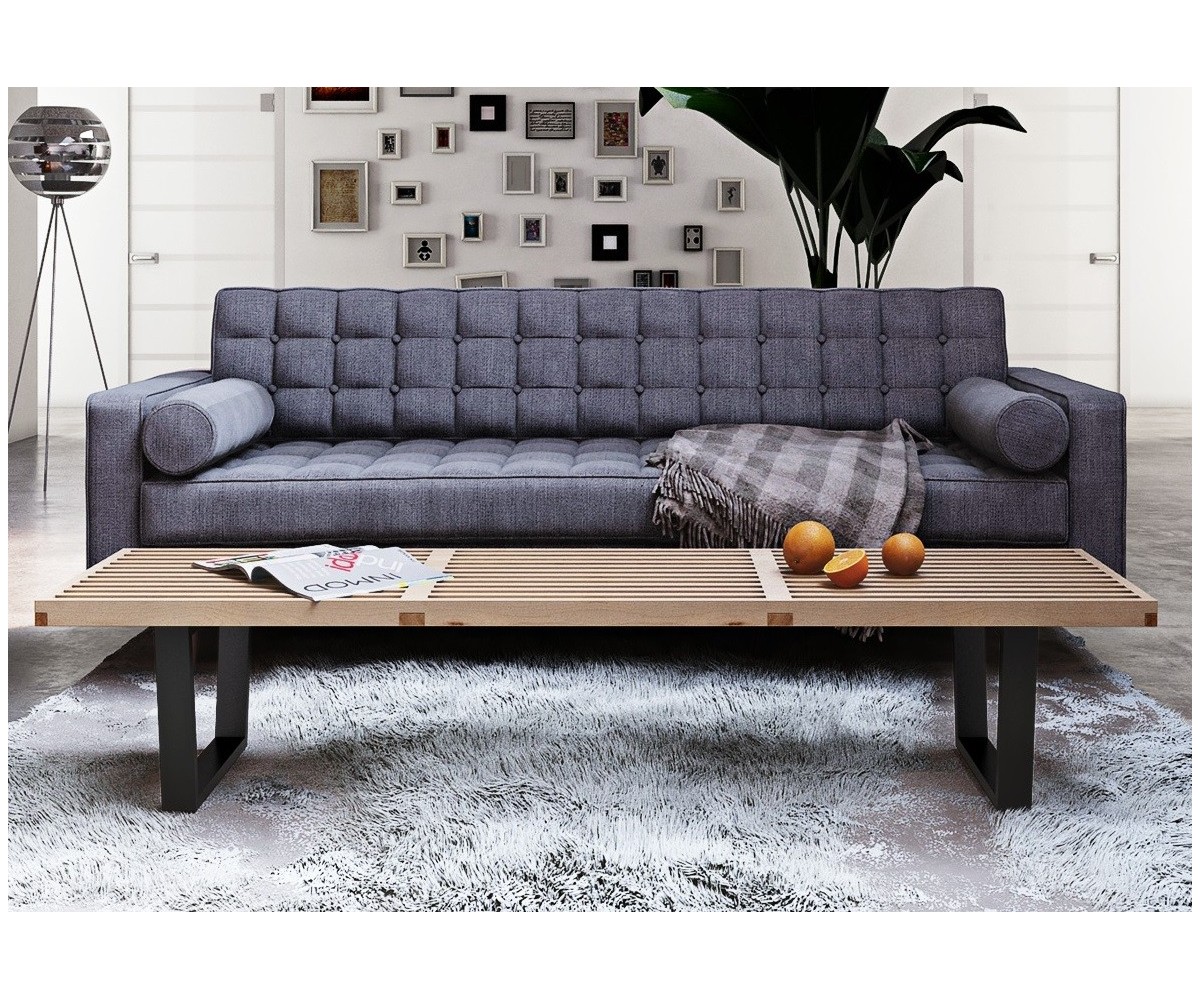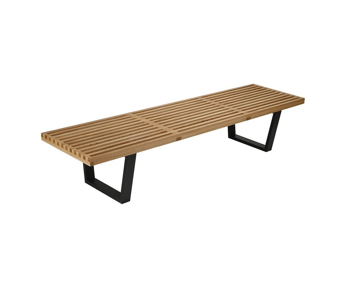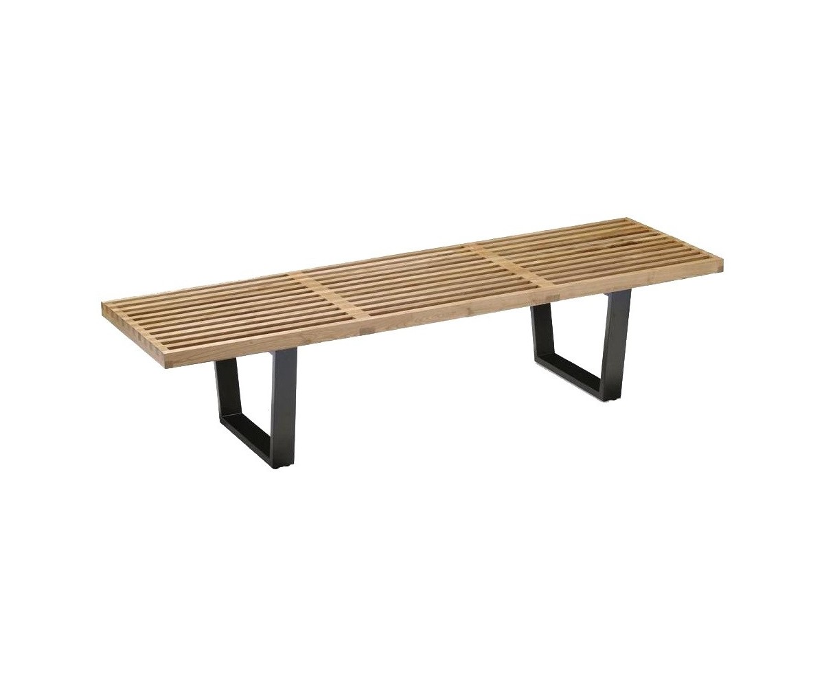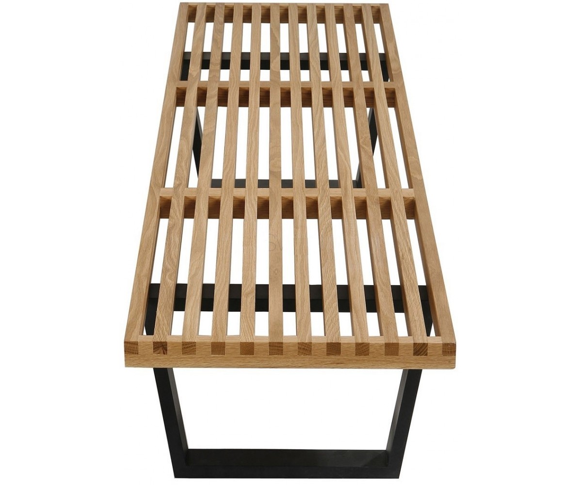 Mesa de centro inspirado en un diseño de George Nelson. Base fabricada mediante tablillas en madera de roble maciza , con un espaciado uniforme que permite una mejor circulación de aire, termido con una fina capa de laca transparente. Estructura en acero con trilple lacado negro. Réplica exacta con materiales originales de máxima calidad.